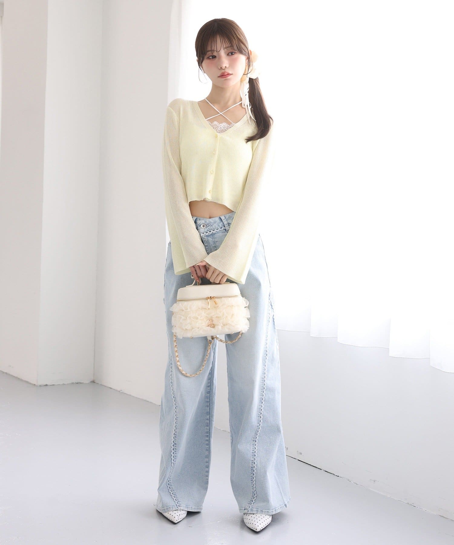 シアーシャツやカーディガンを羽織ったレイヤードコーデがおすすめ。