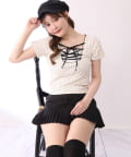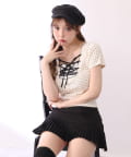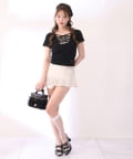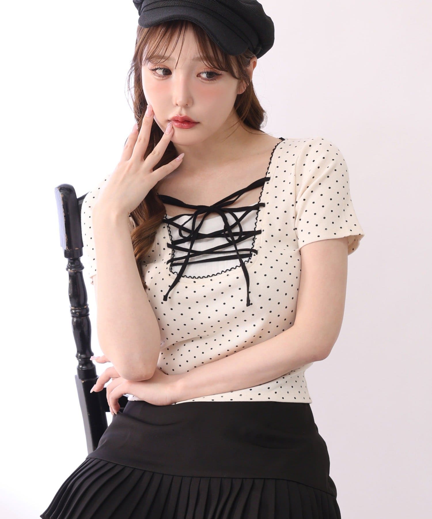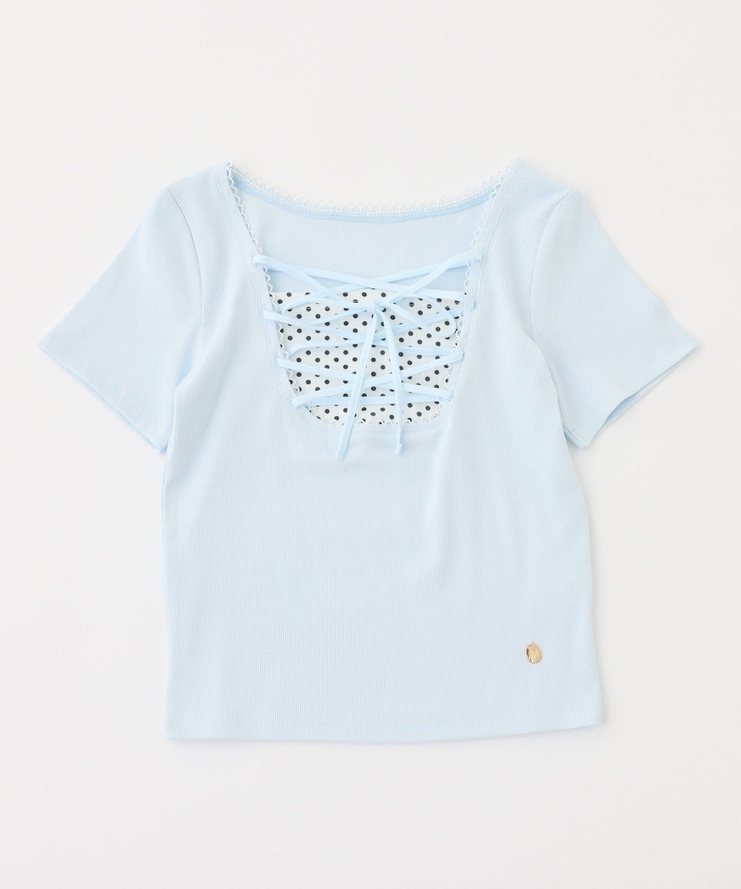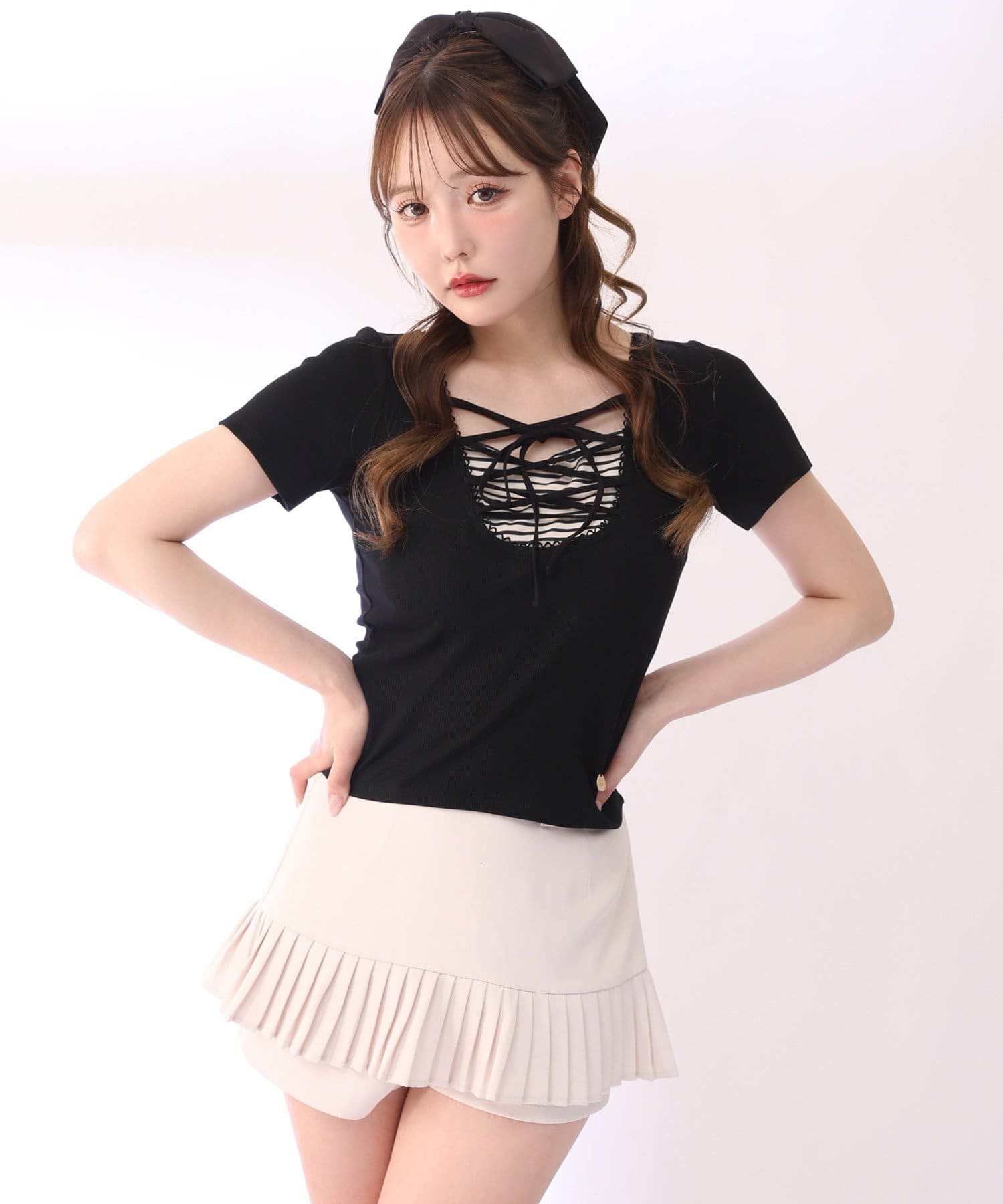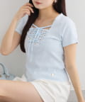 テレコ素材で着心地の良いトップスに、フロントのレースアップデザインをプラスした一枚。
