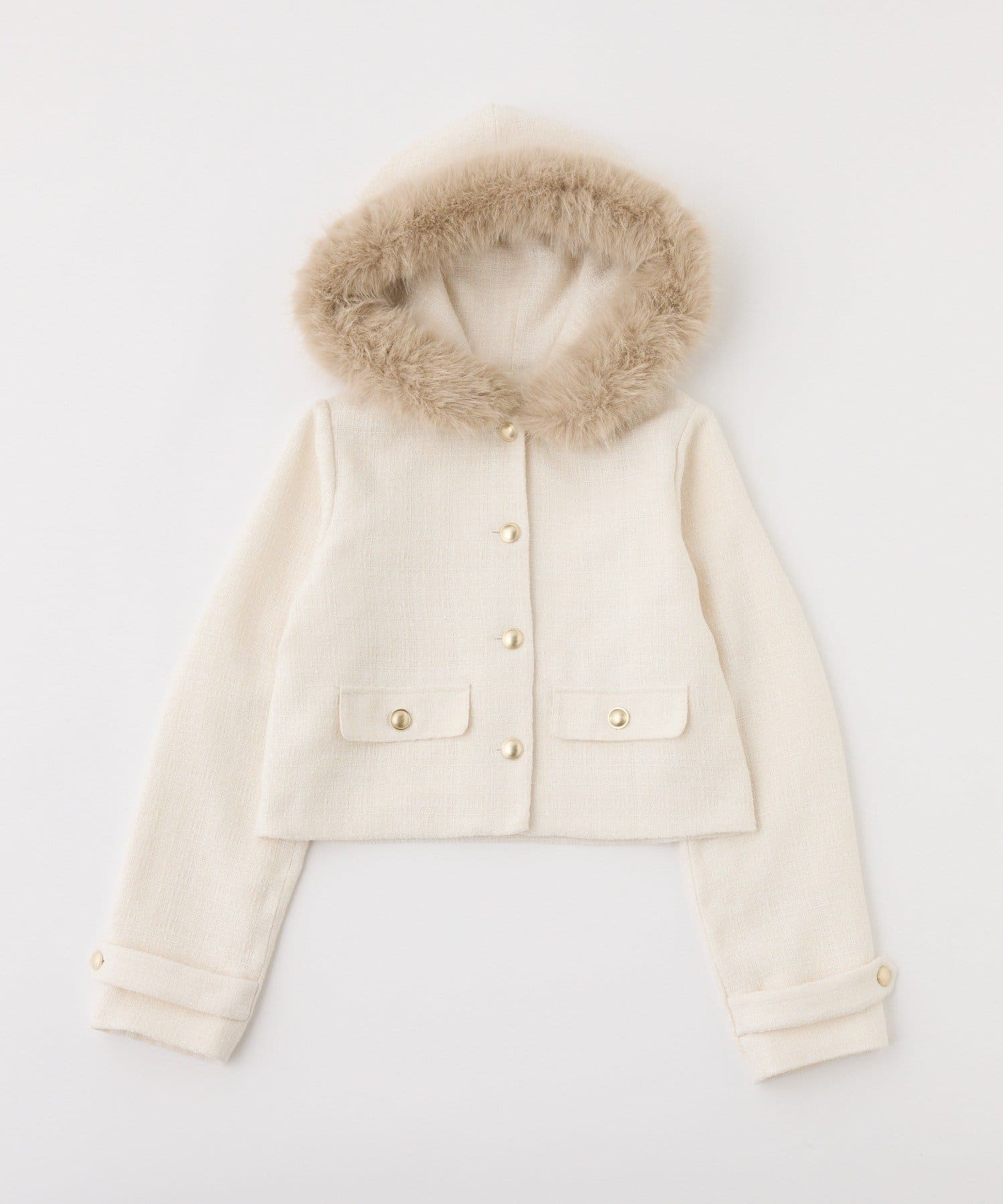 上品なツイード素材に、カジュアルなフードとふわふわファーを組み合わせた主役級アウター。