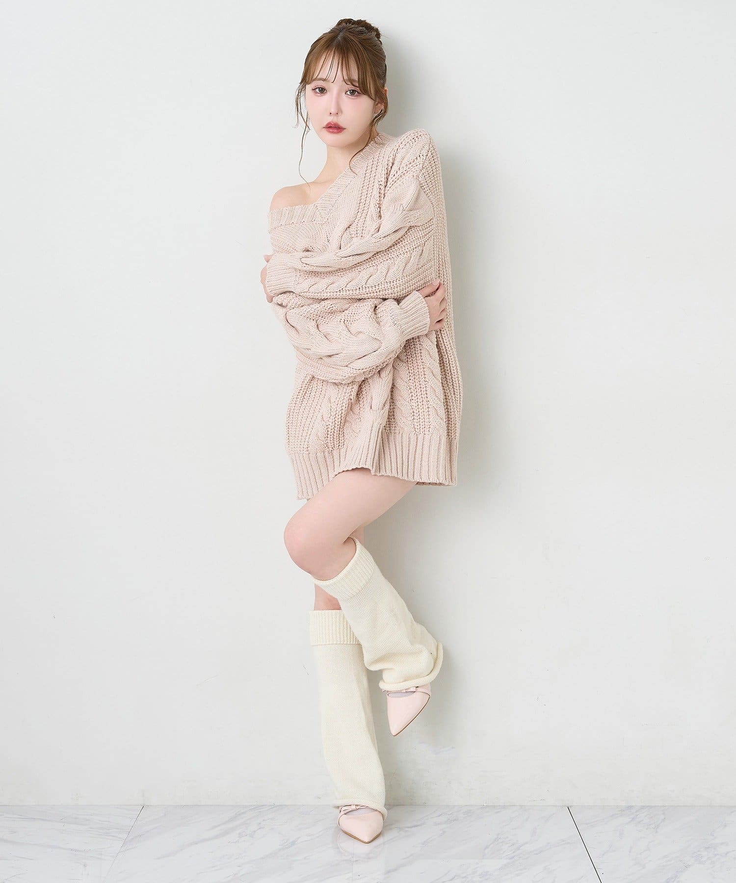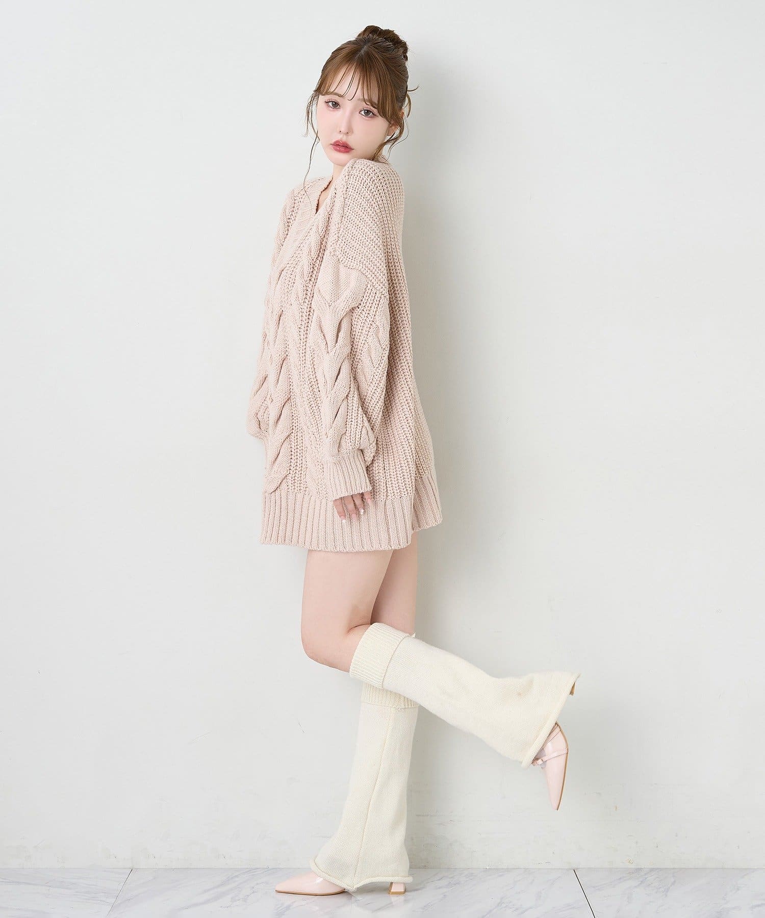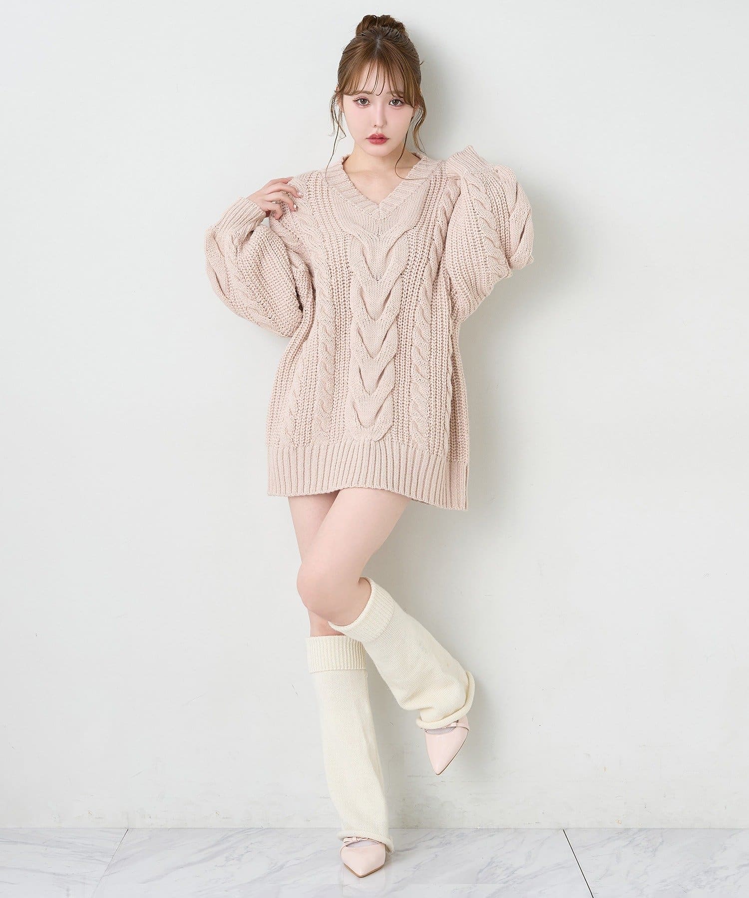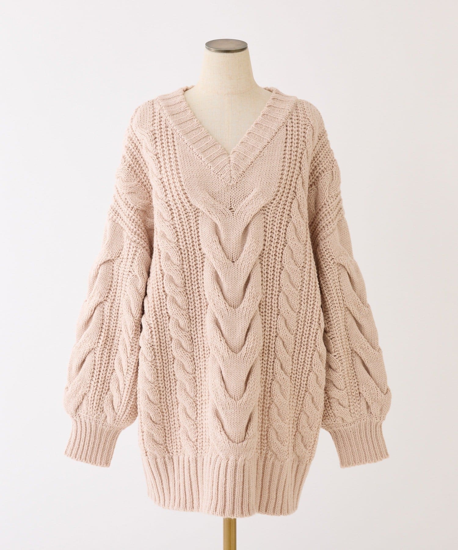 ケーブル編みがポイントのニットミニワンピース。