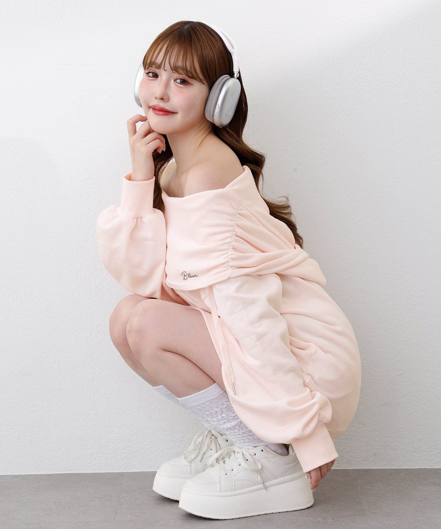スウェット素材を使用した、オフショルデザインのパーカー。