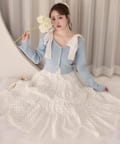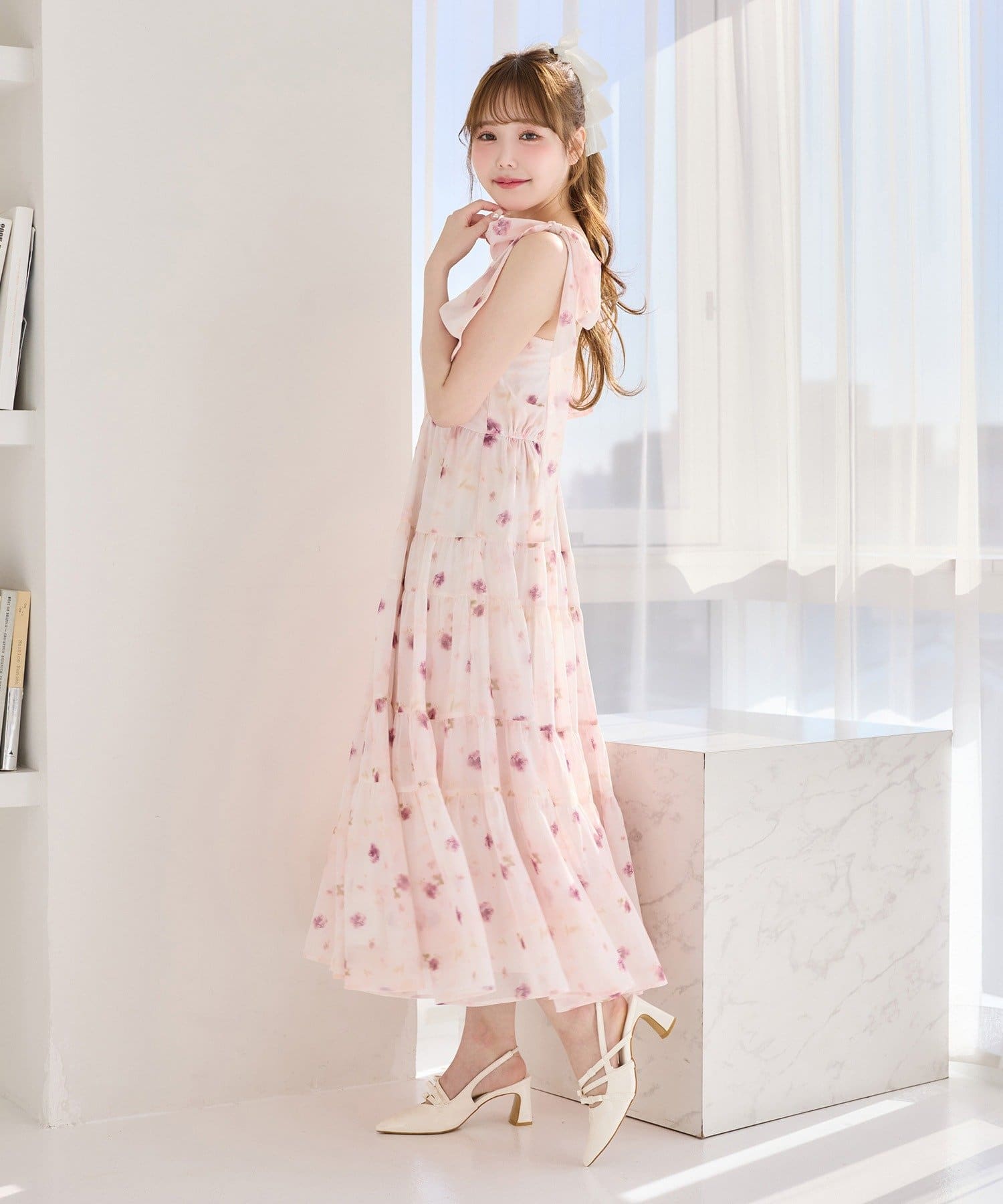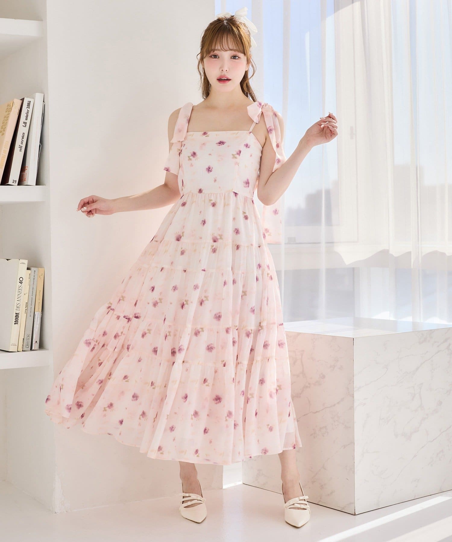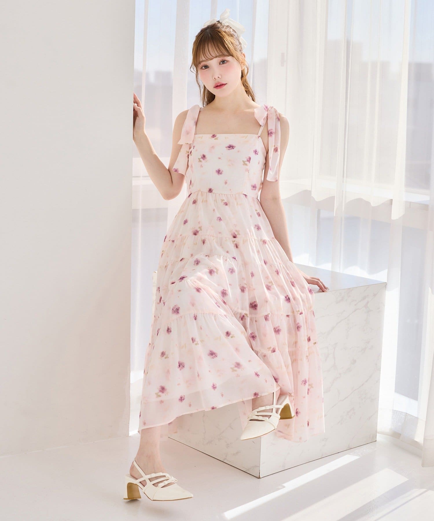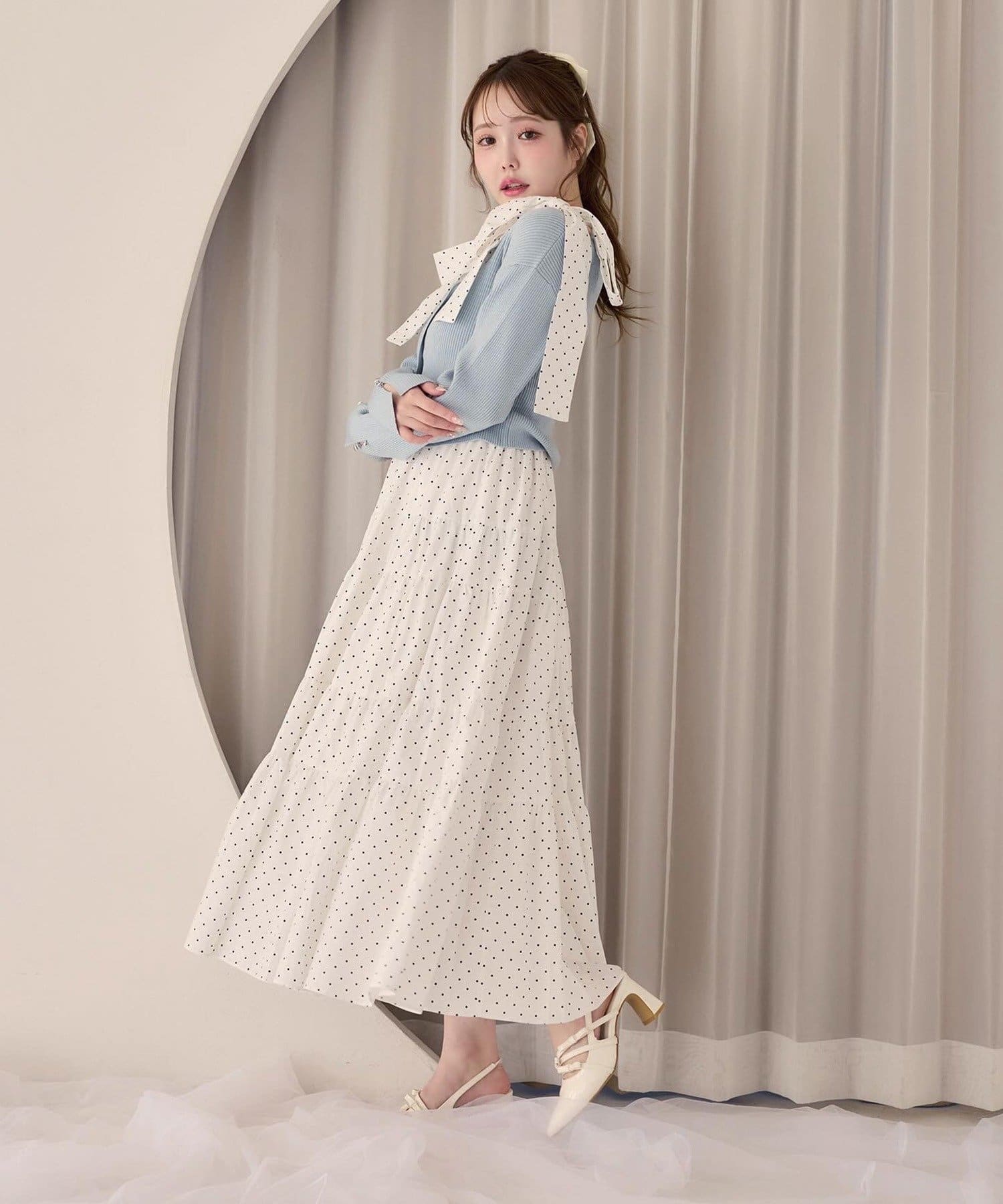 シルエットがきれいなティアードデザインになったキャミワンピースとカーディガンのセットアイテム。