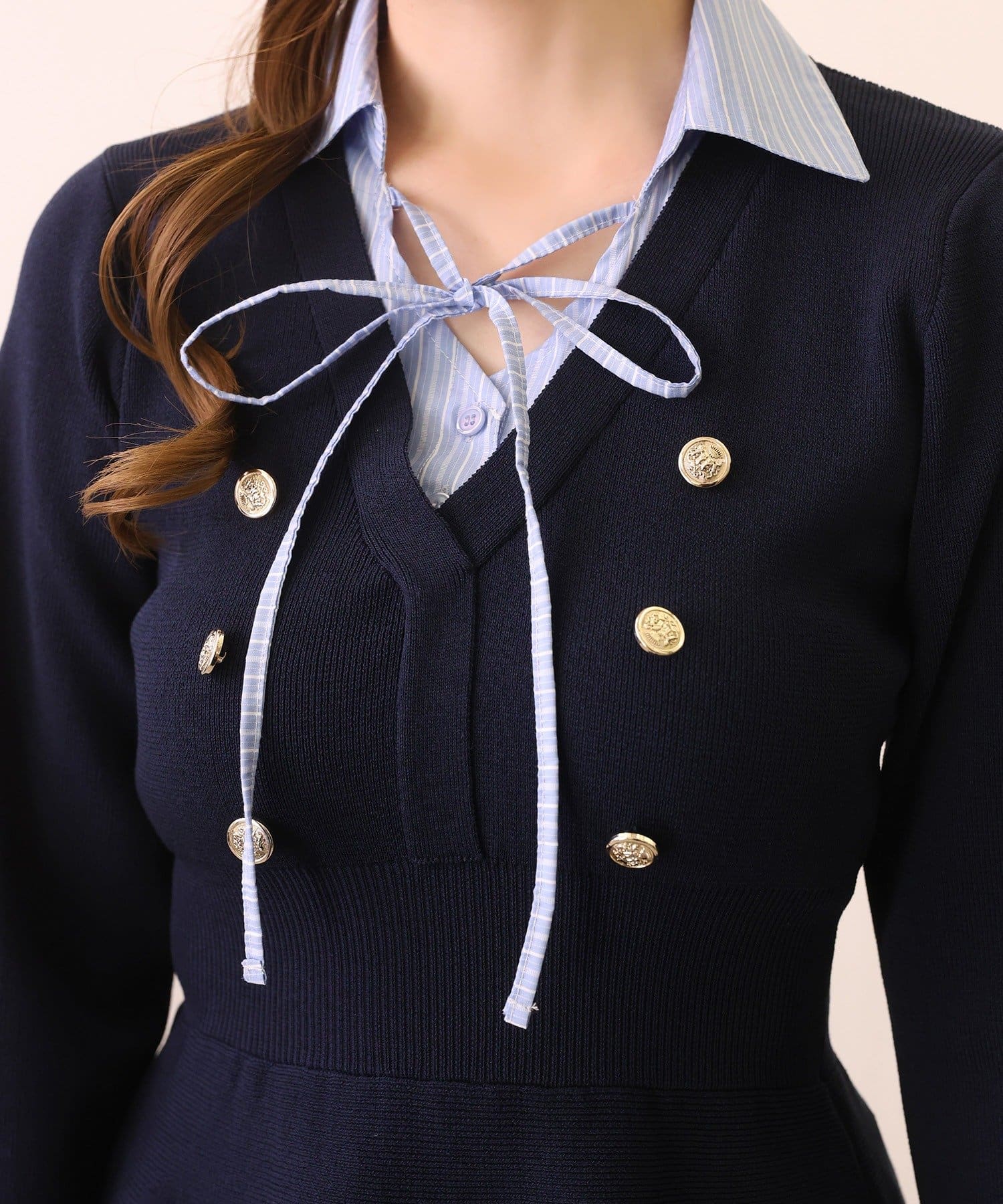 胸元のリボンがさりげないアクセントになり、顔まわりを華やかに見せてくれます。