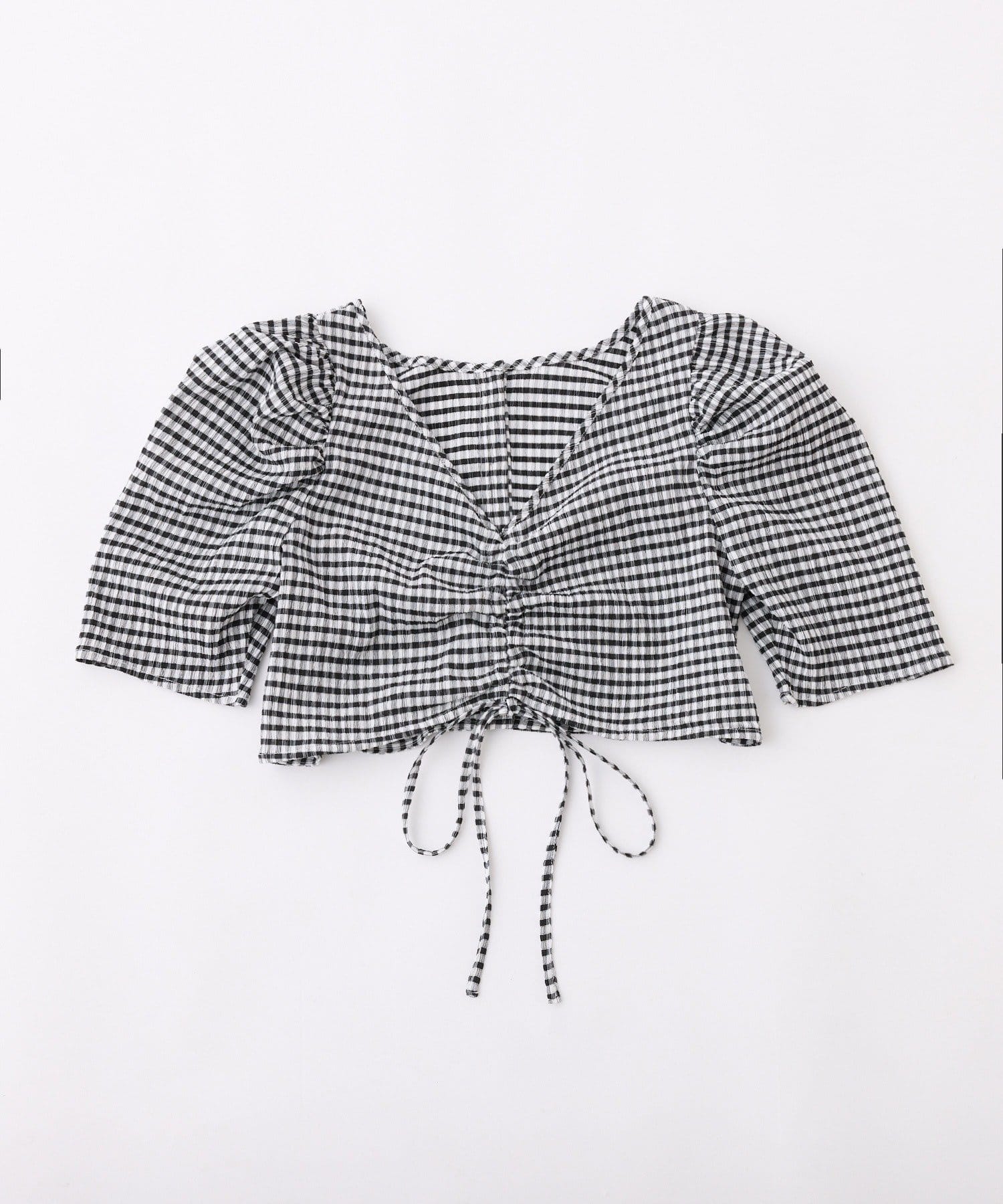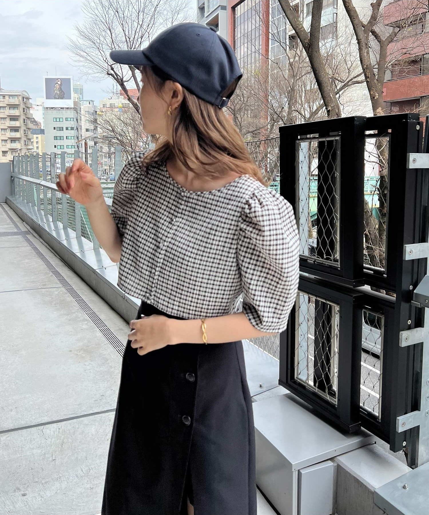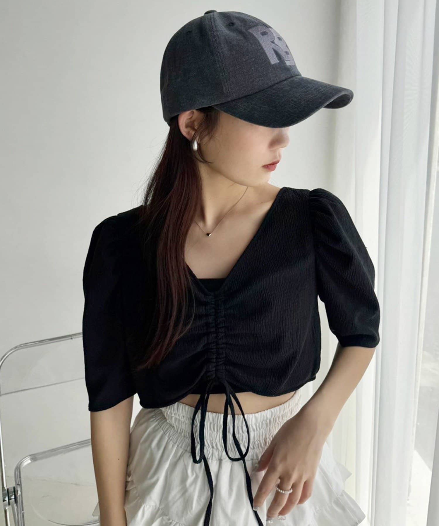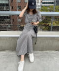 トップスはコンパクトなクロップド丈で足長効果を演出します。