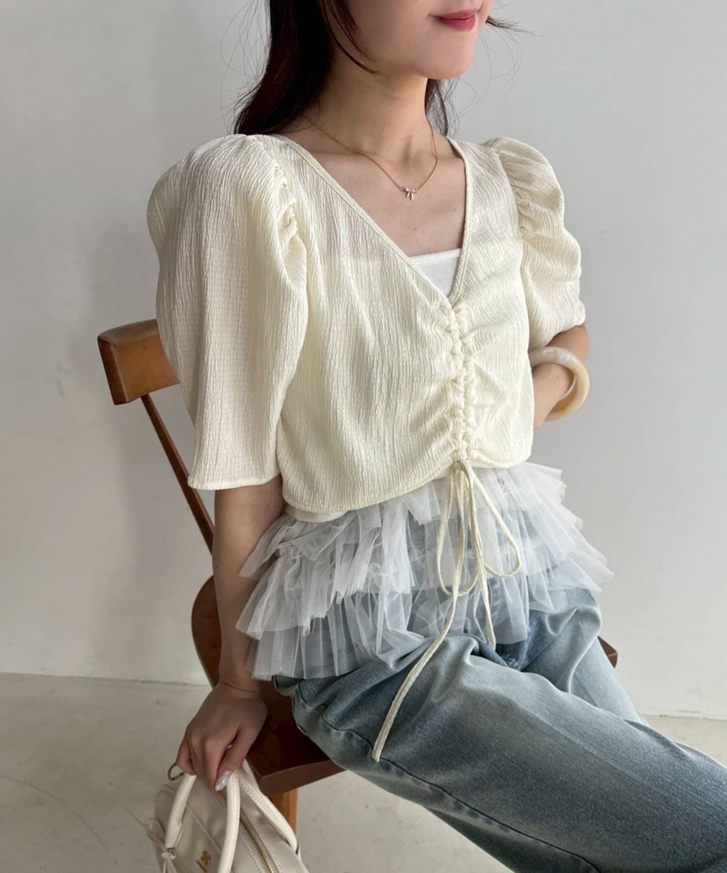 トップス単体ならインナーにデニム合わせもオススメ。