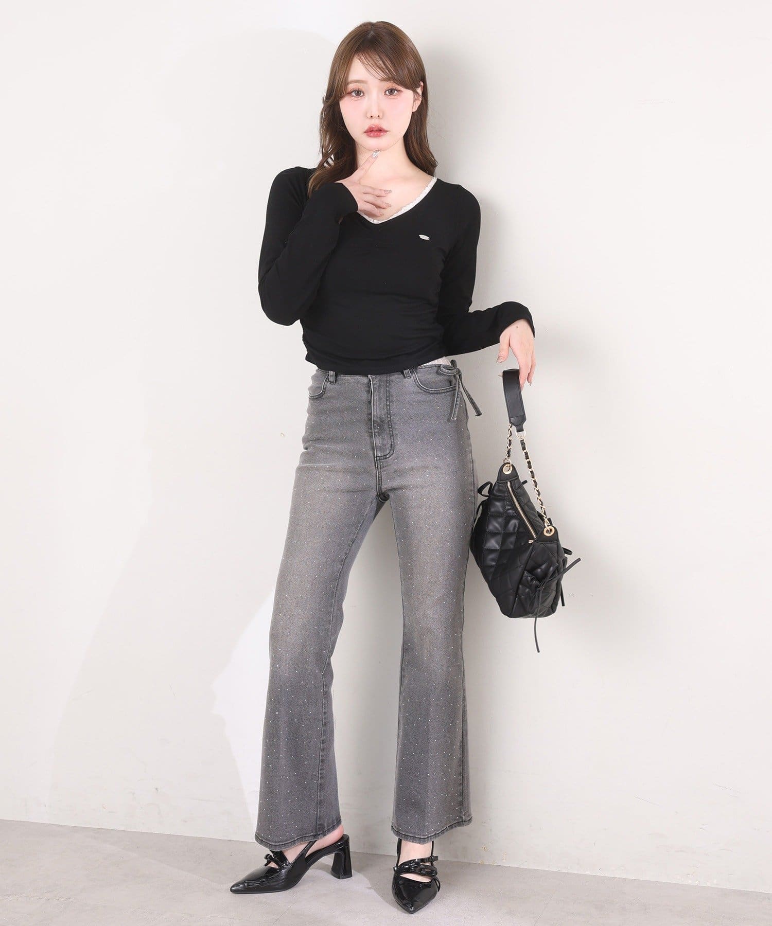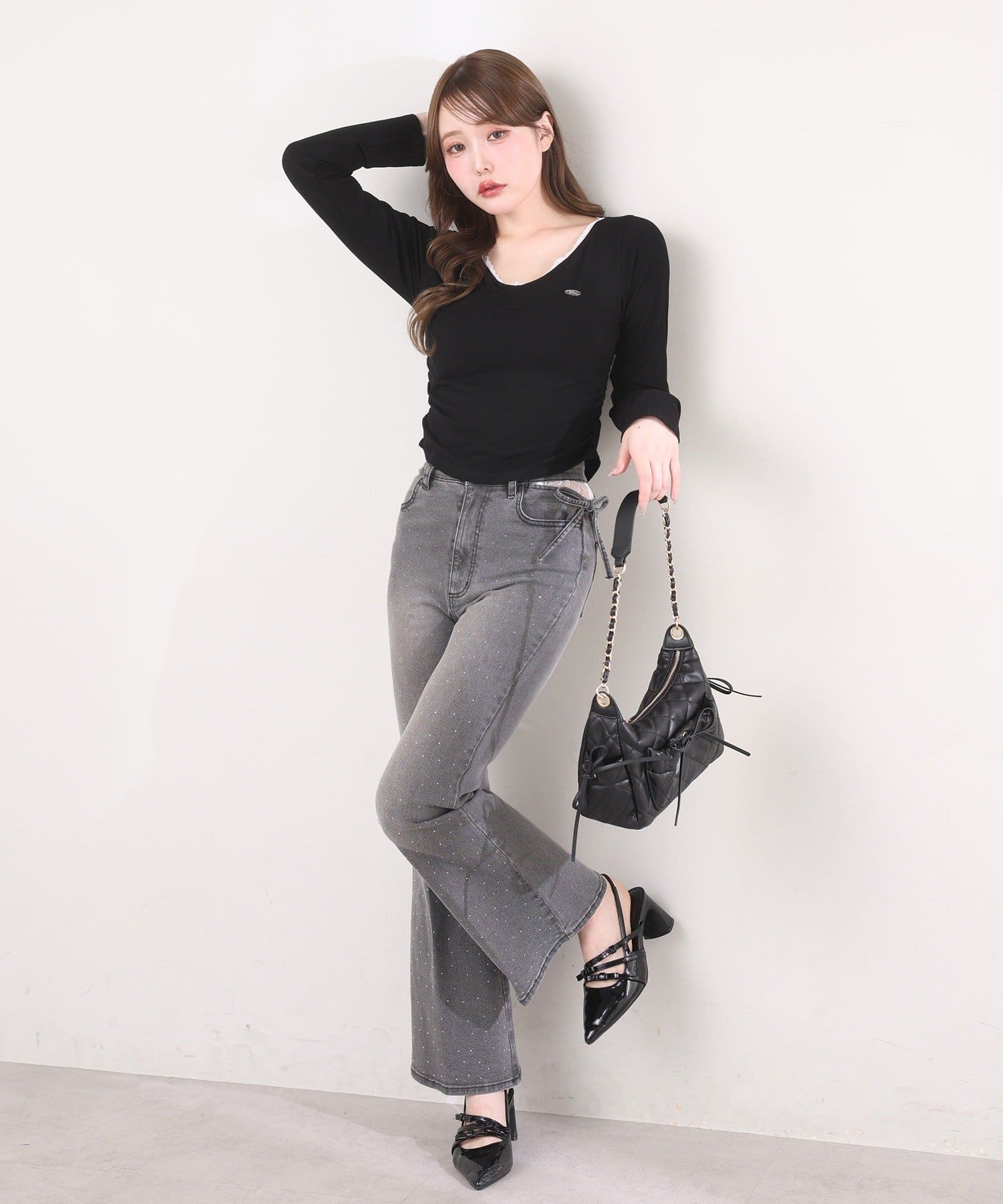 フロントのリボンディテールが、さりげなくガーリーなアクセントをプラスします。