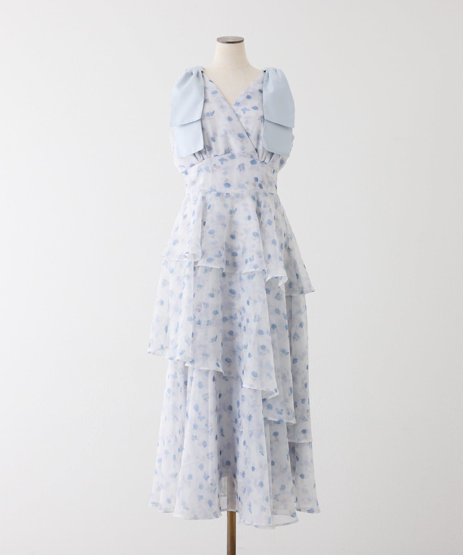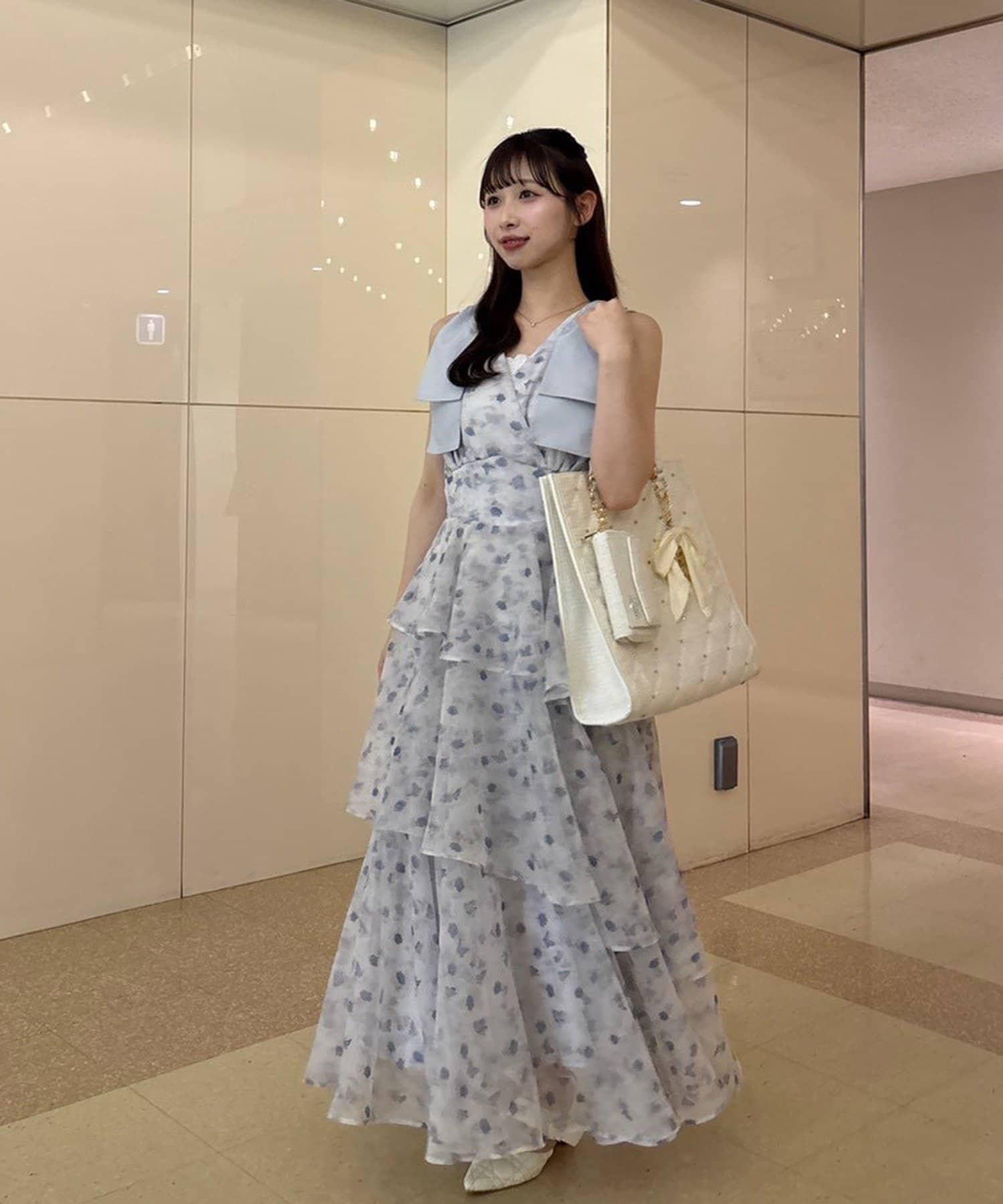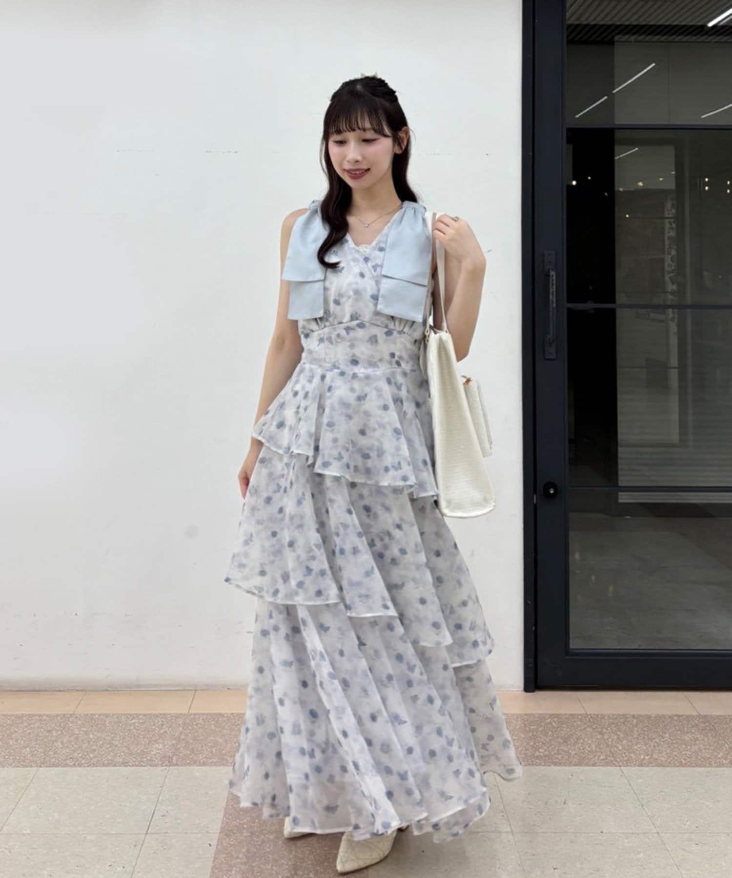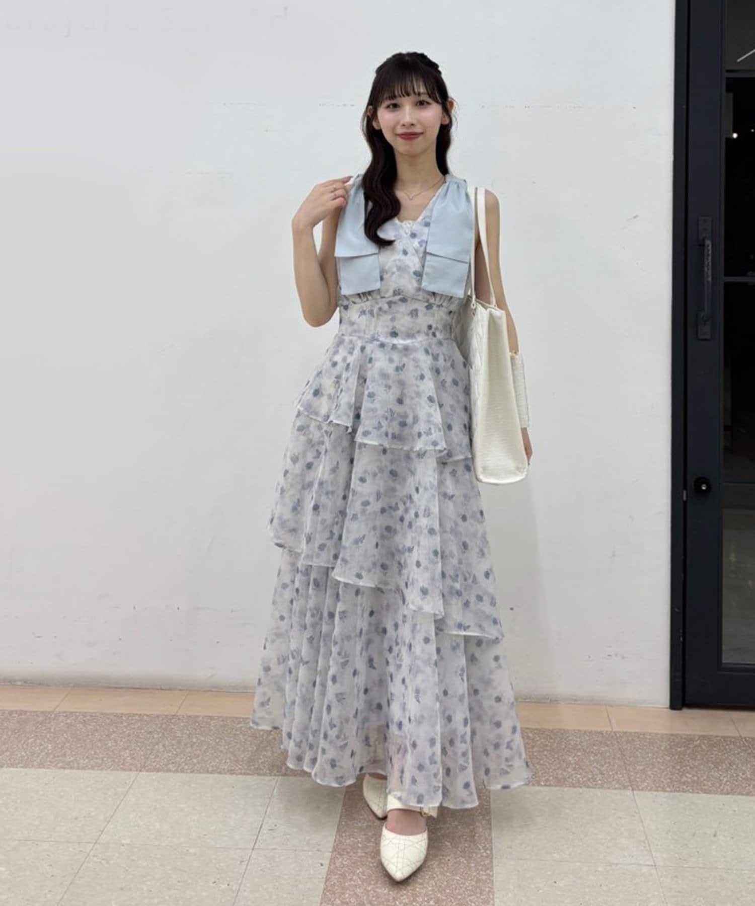 肩の大きめリボンがポイントのティアードロングワンピース。