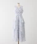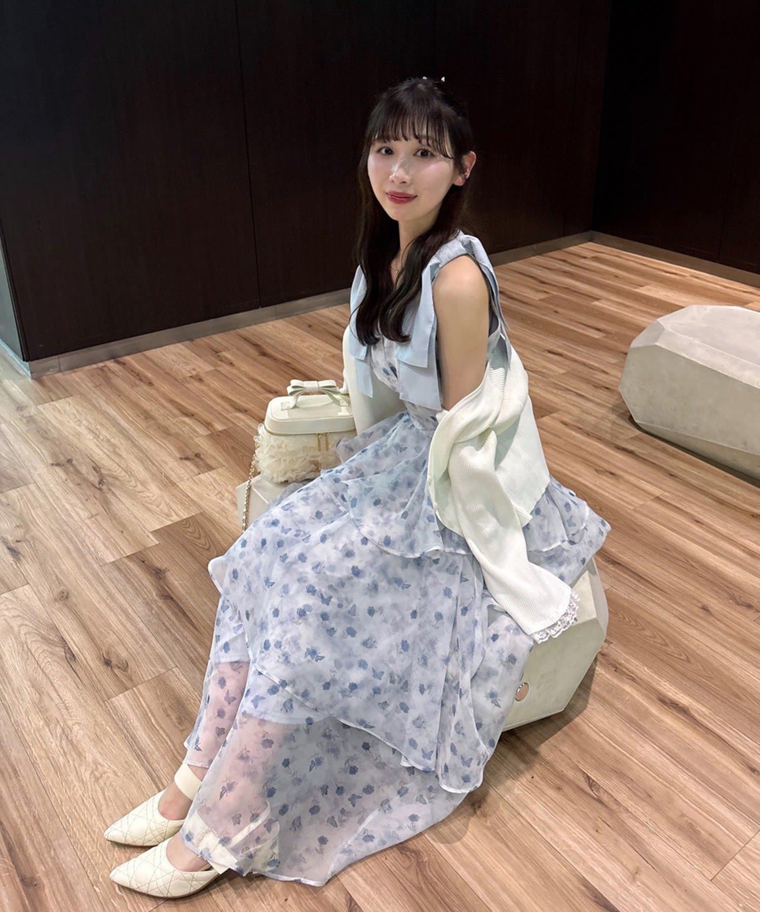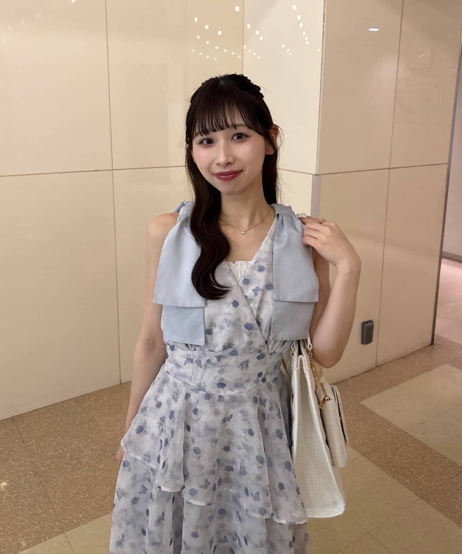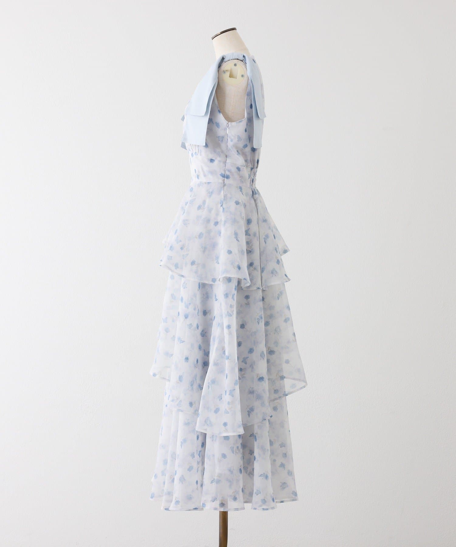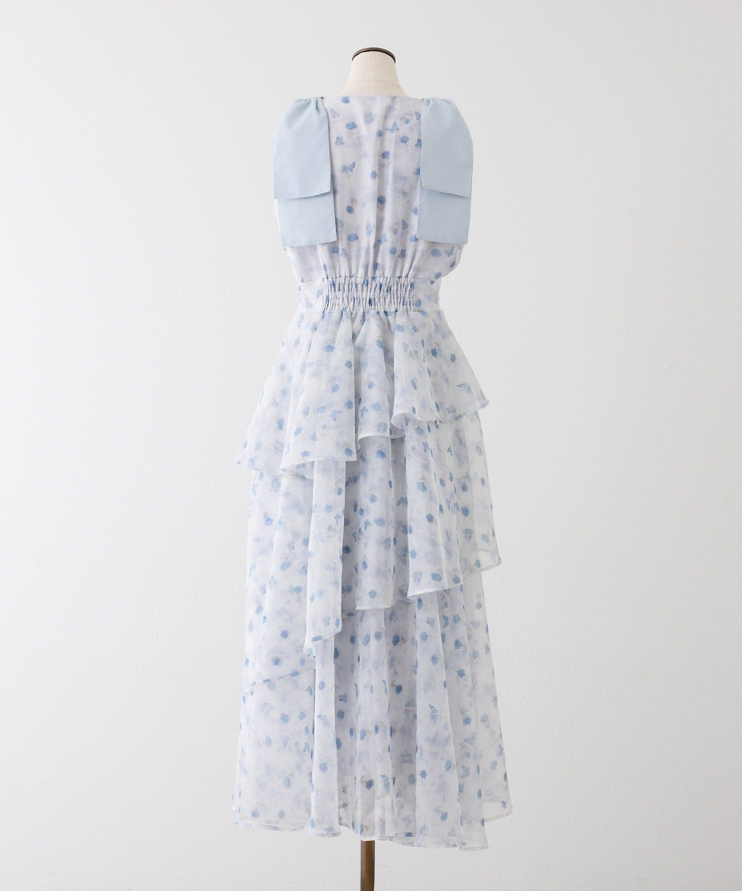 肩の大きめリボンがポイントのティアードロングワンピース。