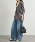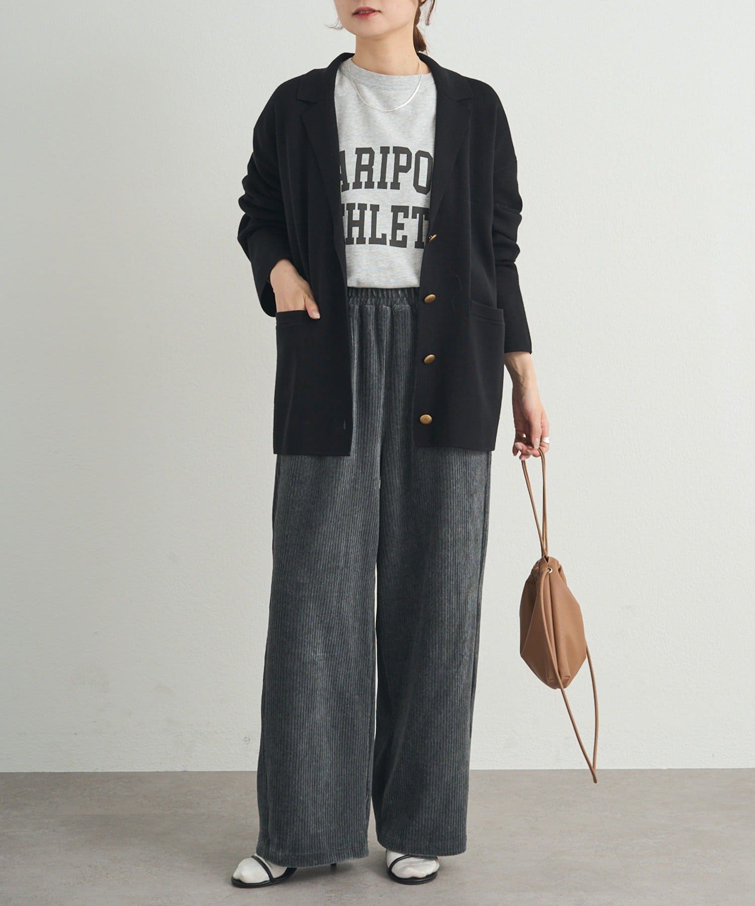 すっきりとしたジャケットなので、ワイドパンツやフレアスカートなど