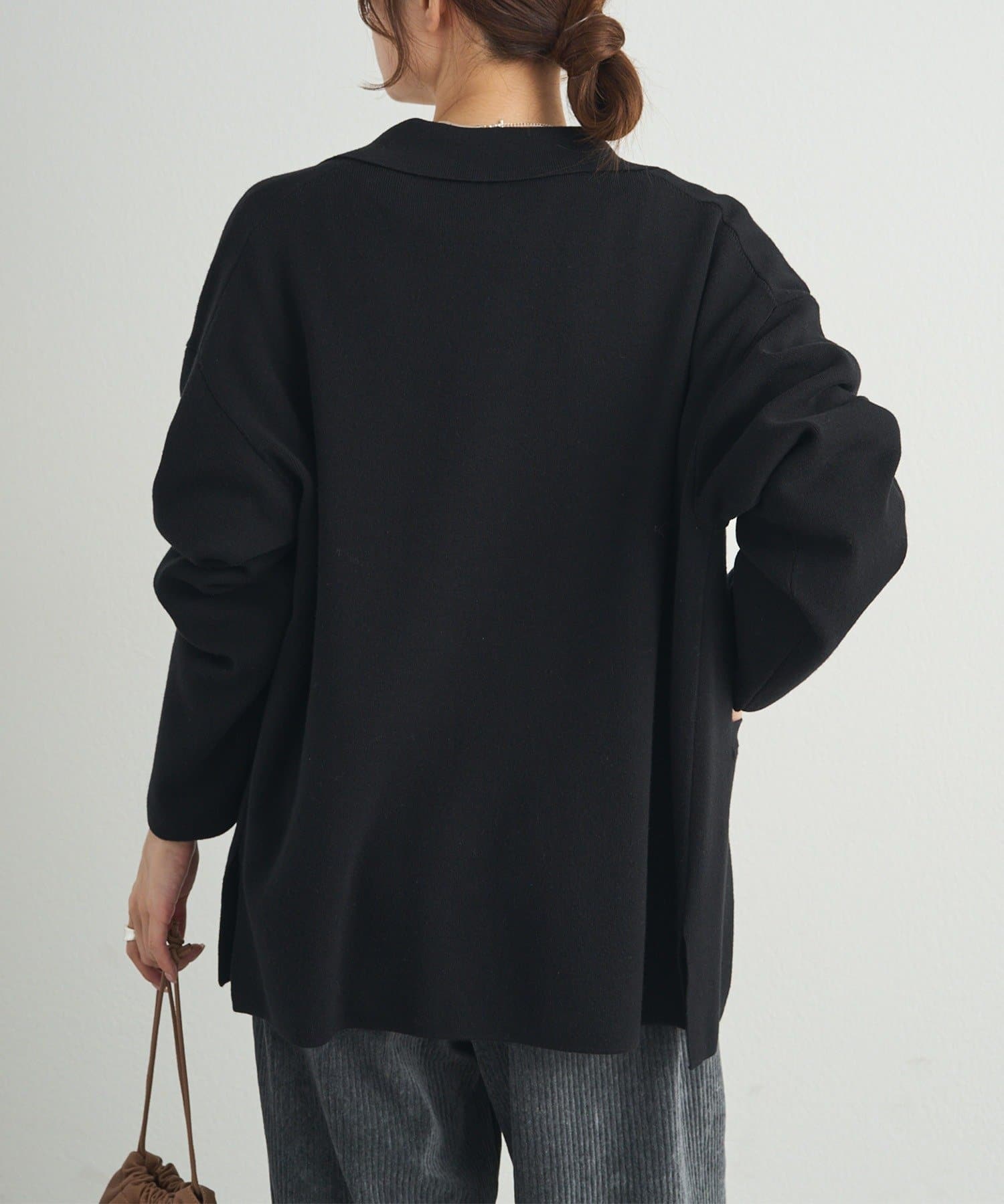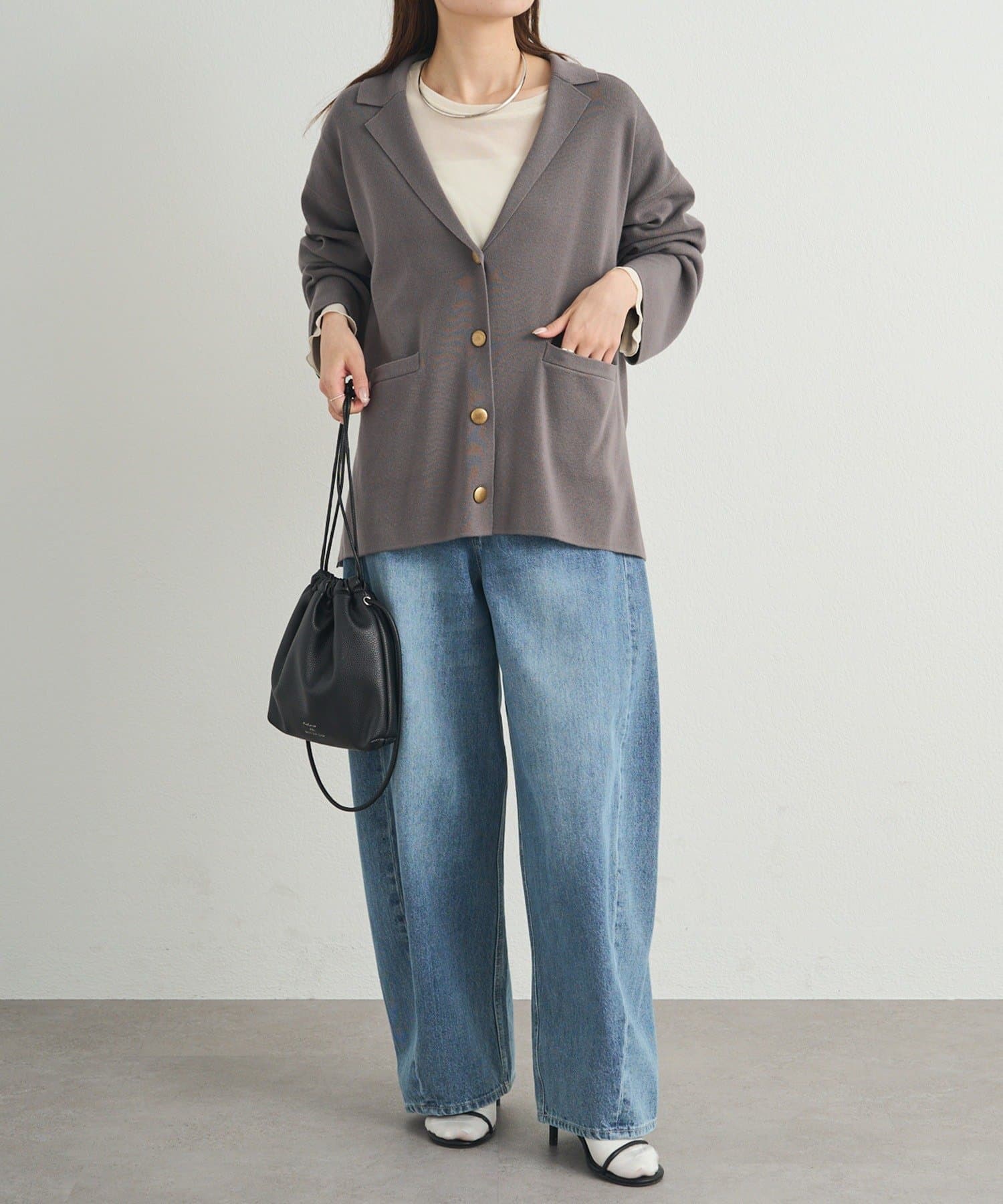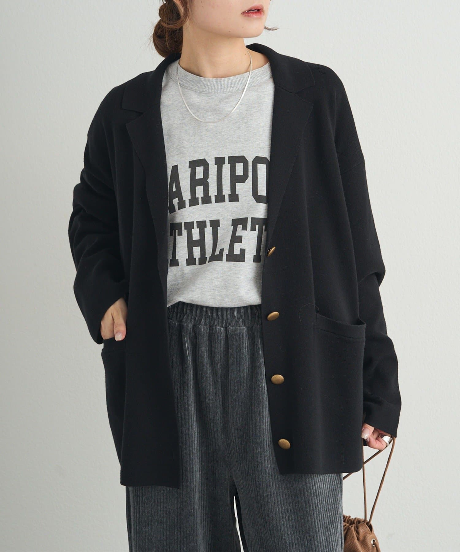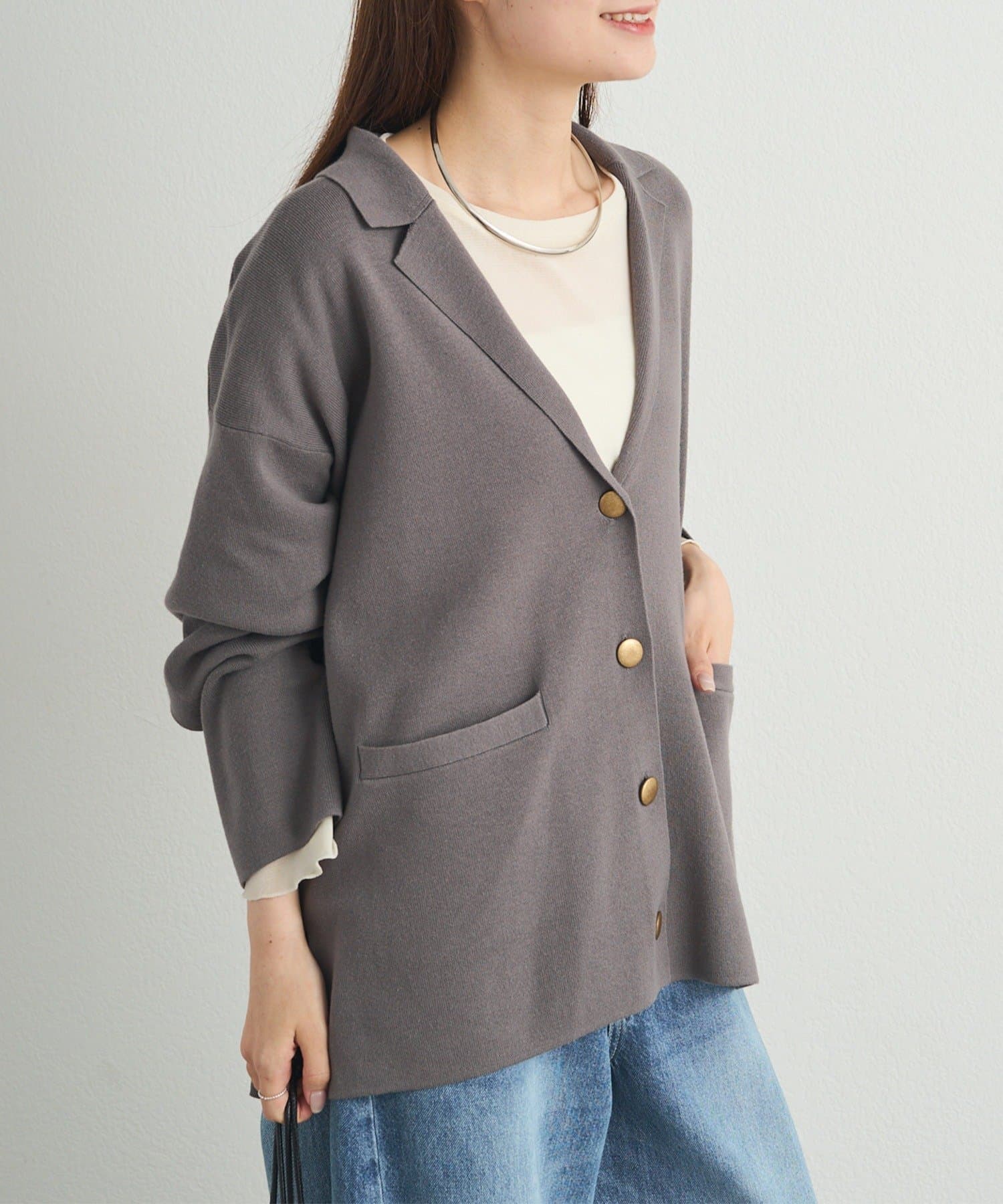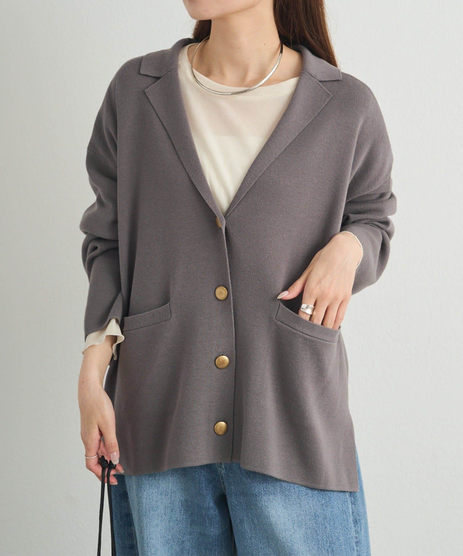 着用感:柔らかなニット生地なので、カーディガンよりもややフォーマルな印象です。