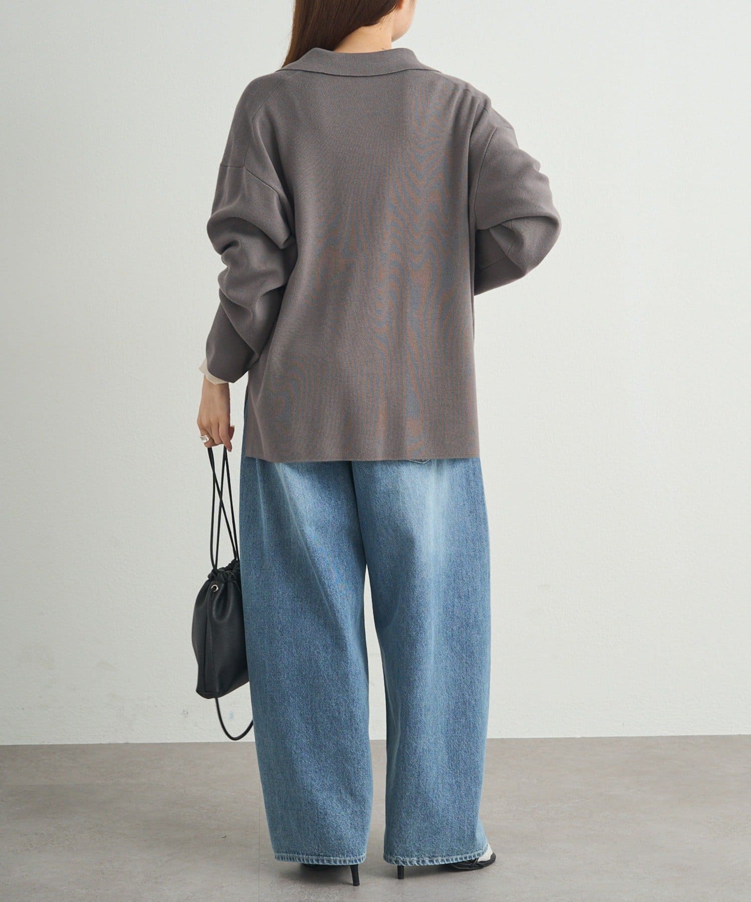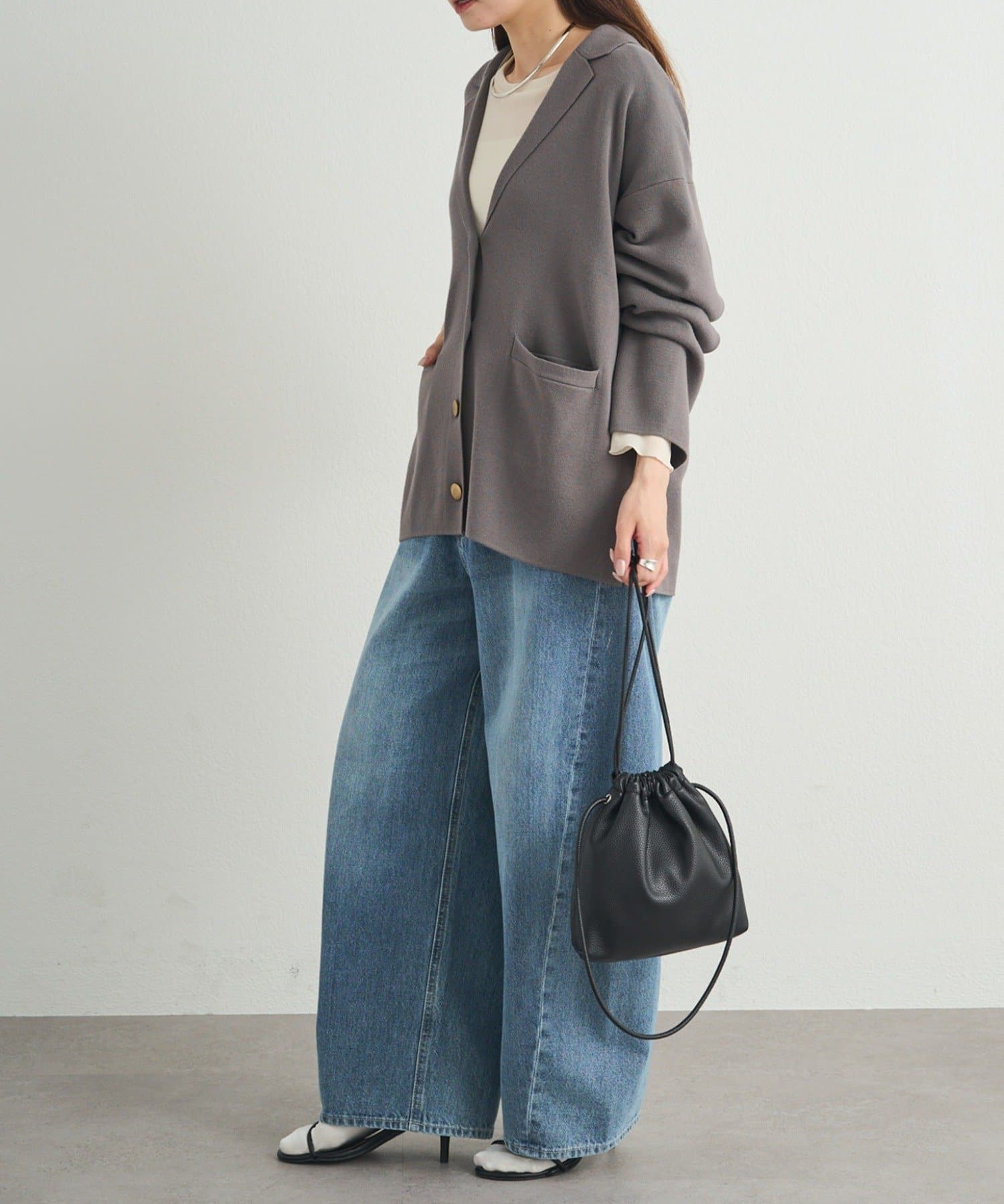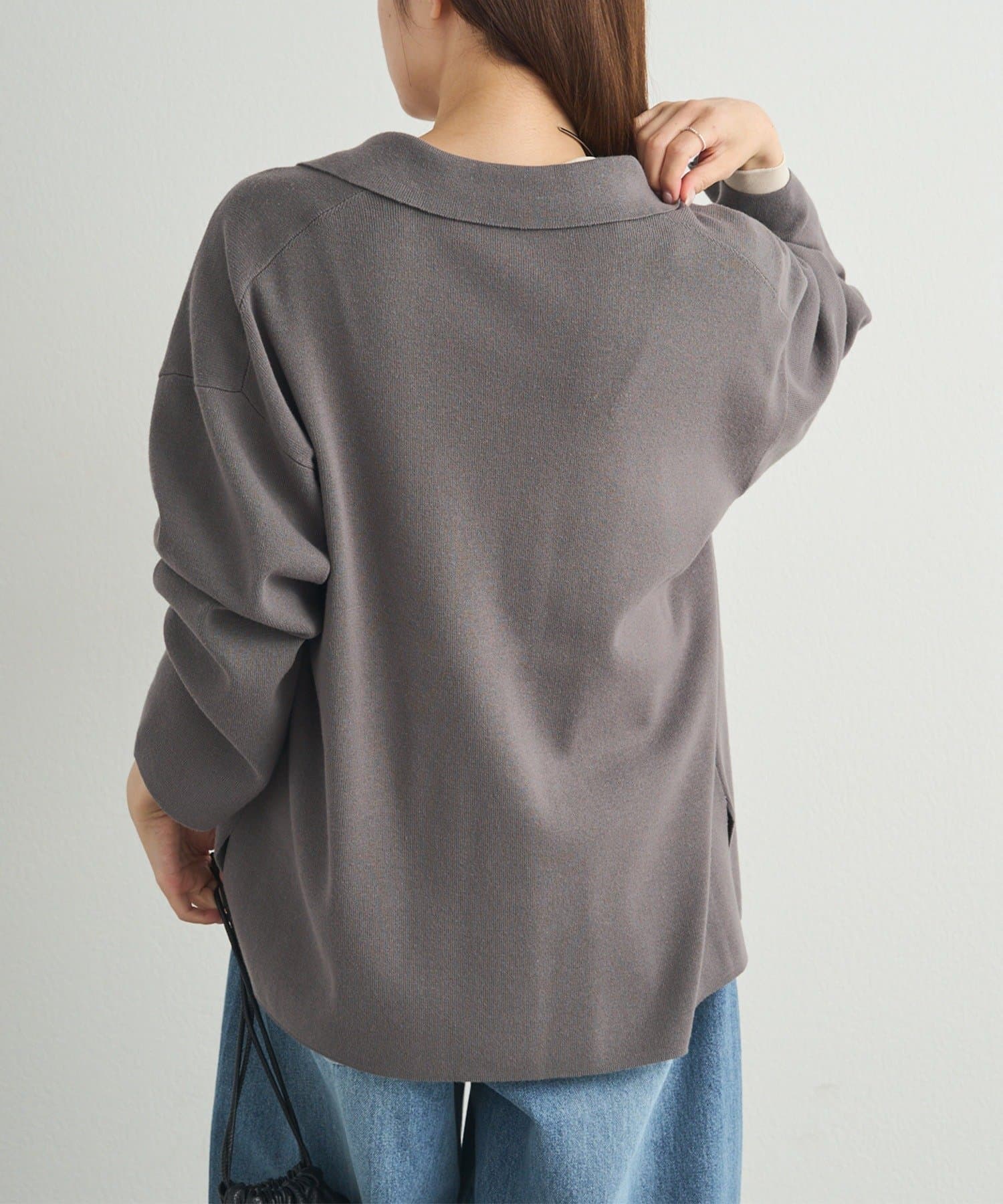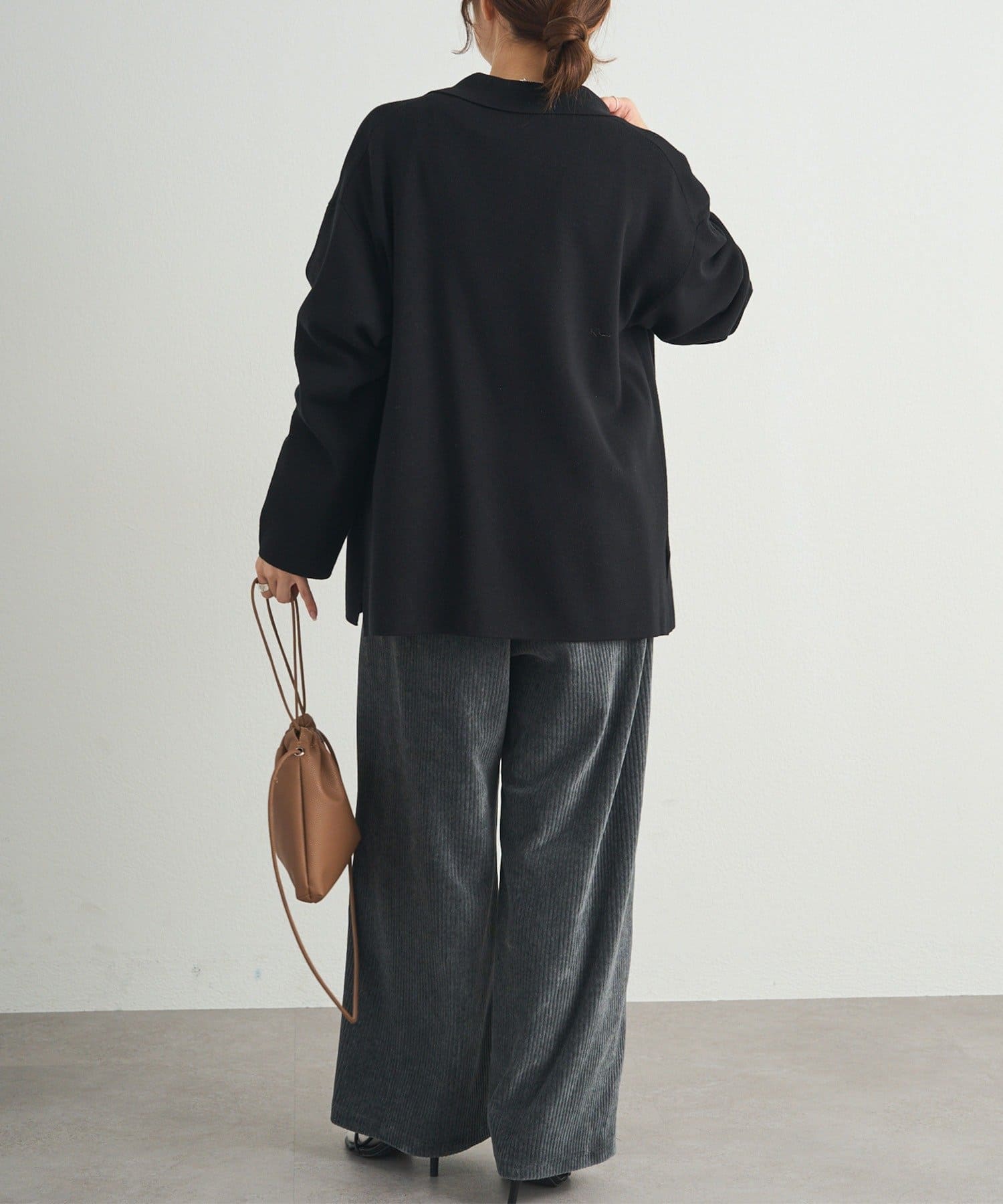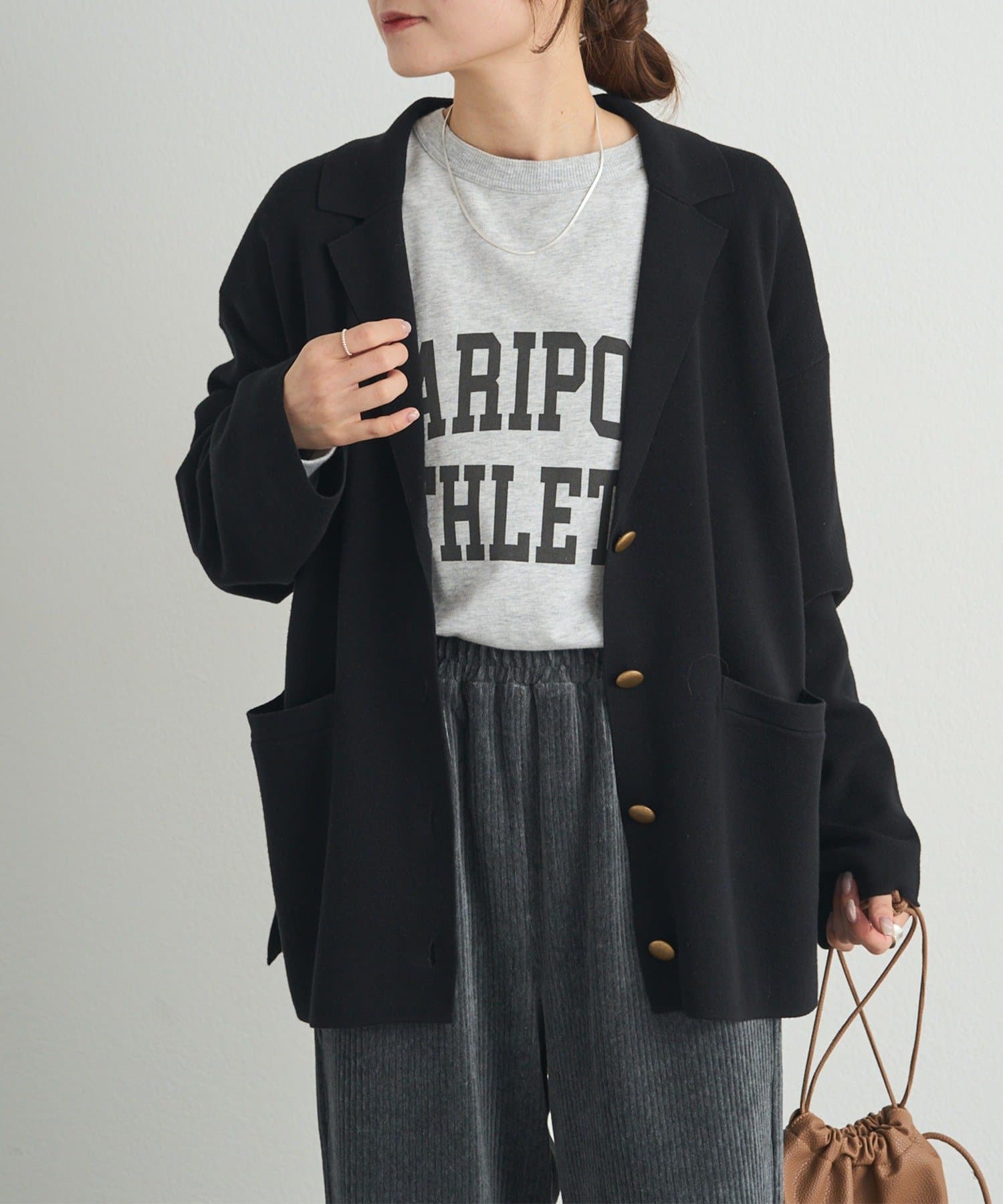 着用感:柔らかなニット生地なので、カーディガンよりもややフォーマルな印象です。