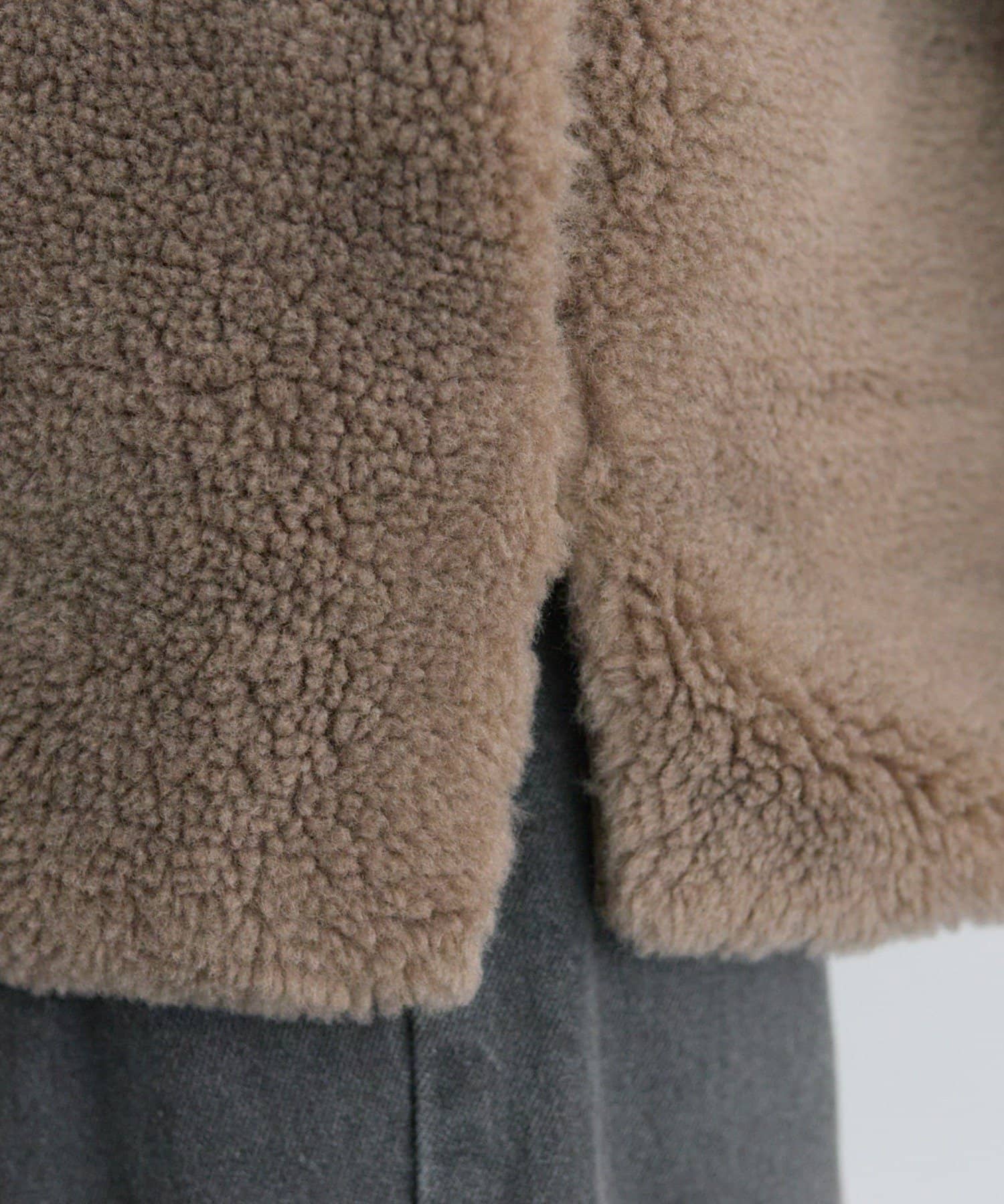 ふんわりとしたボア素材がフェミニンな印象を引き立て、ブーツやスニーカーを履いて秋冬のお出かけコーデに。