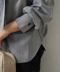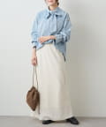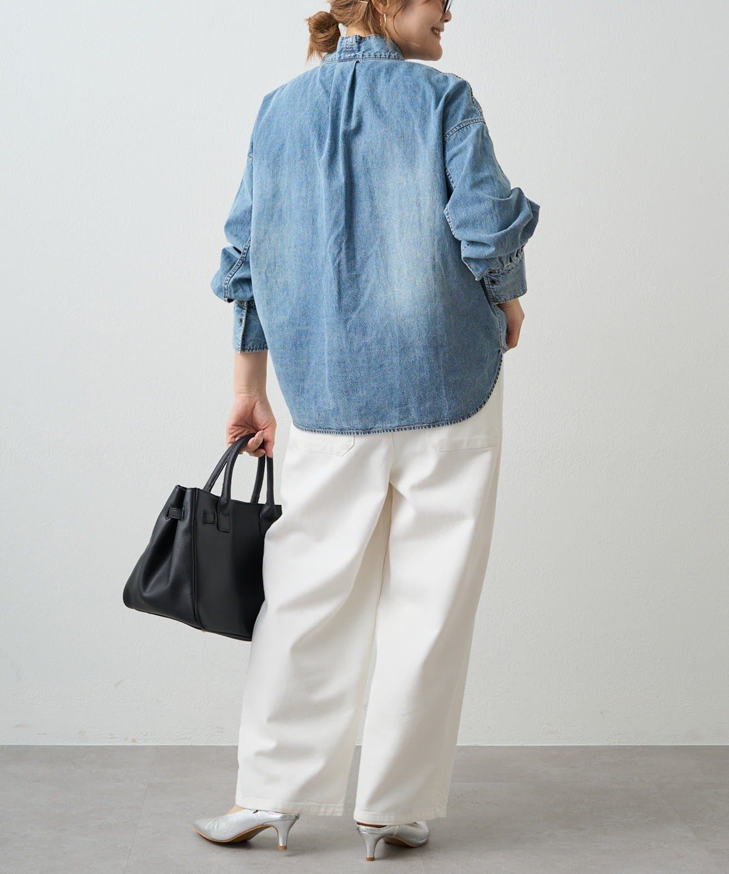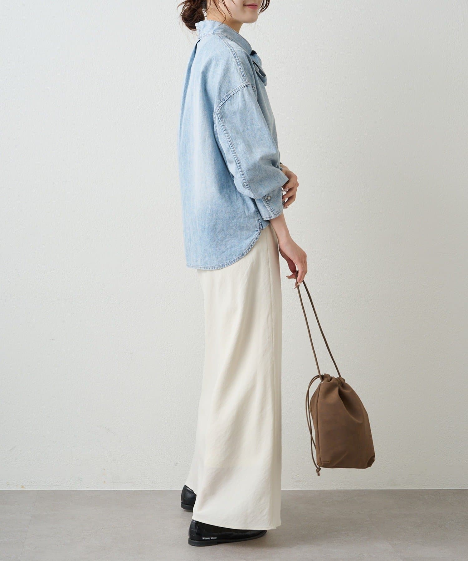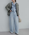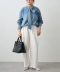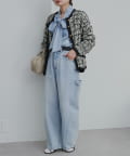 同系色のデニムパンツと合わせたセットアップ風の洗練スタイリング。