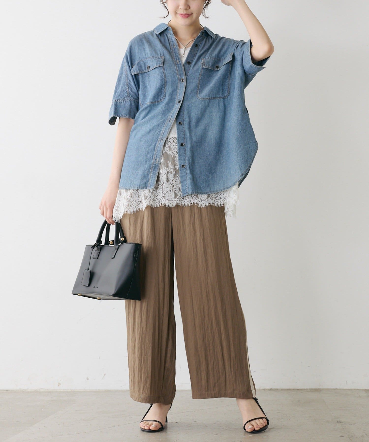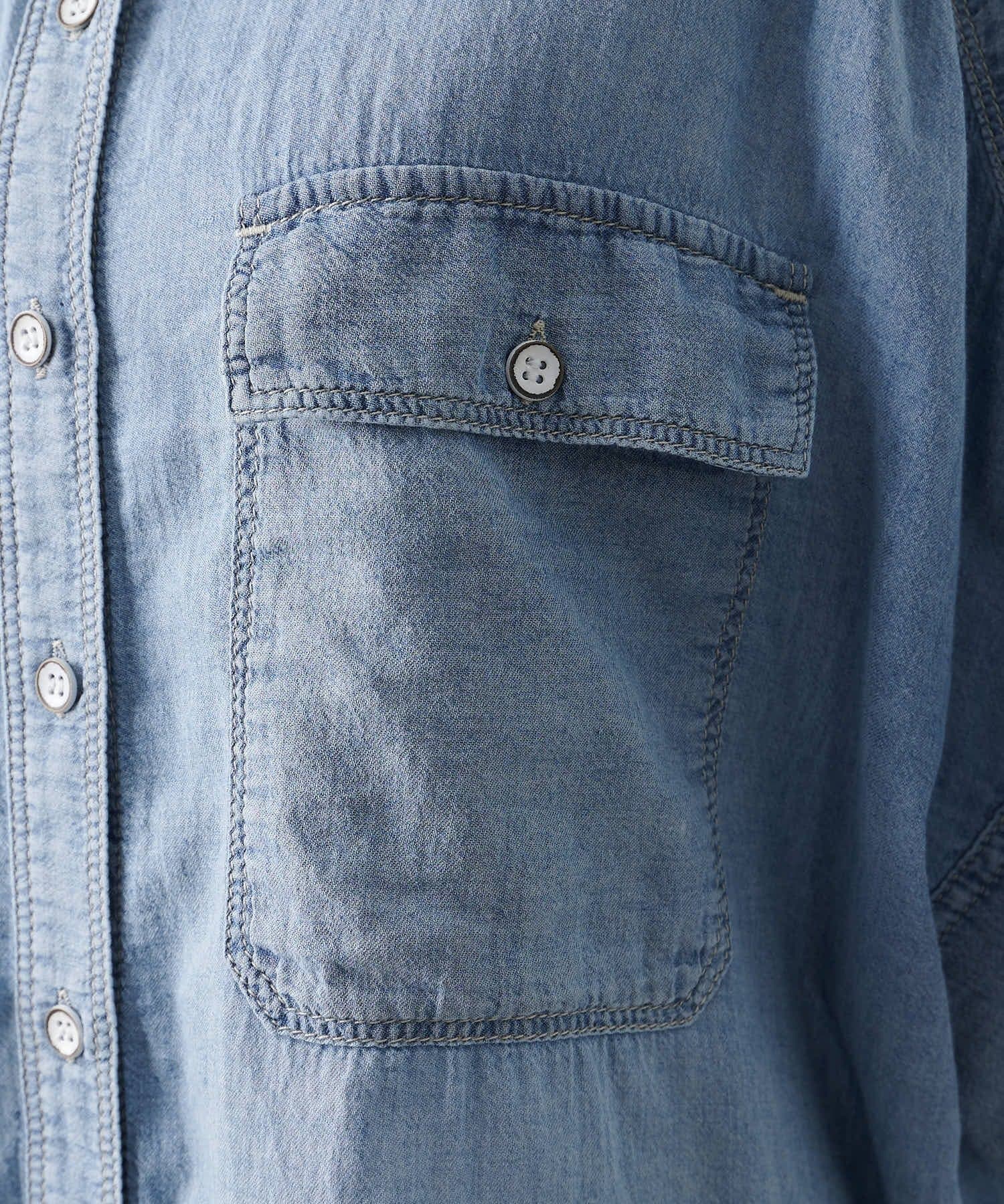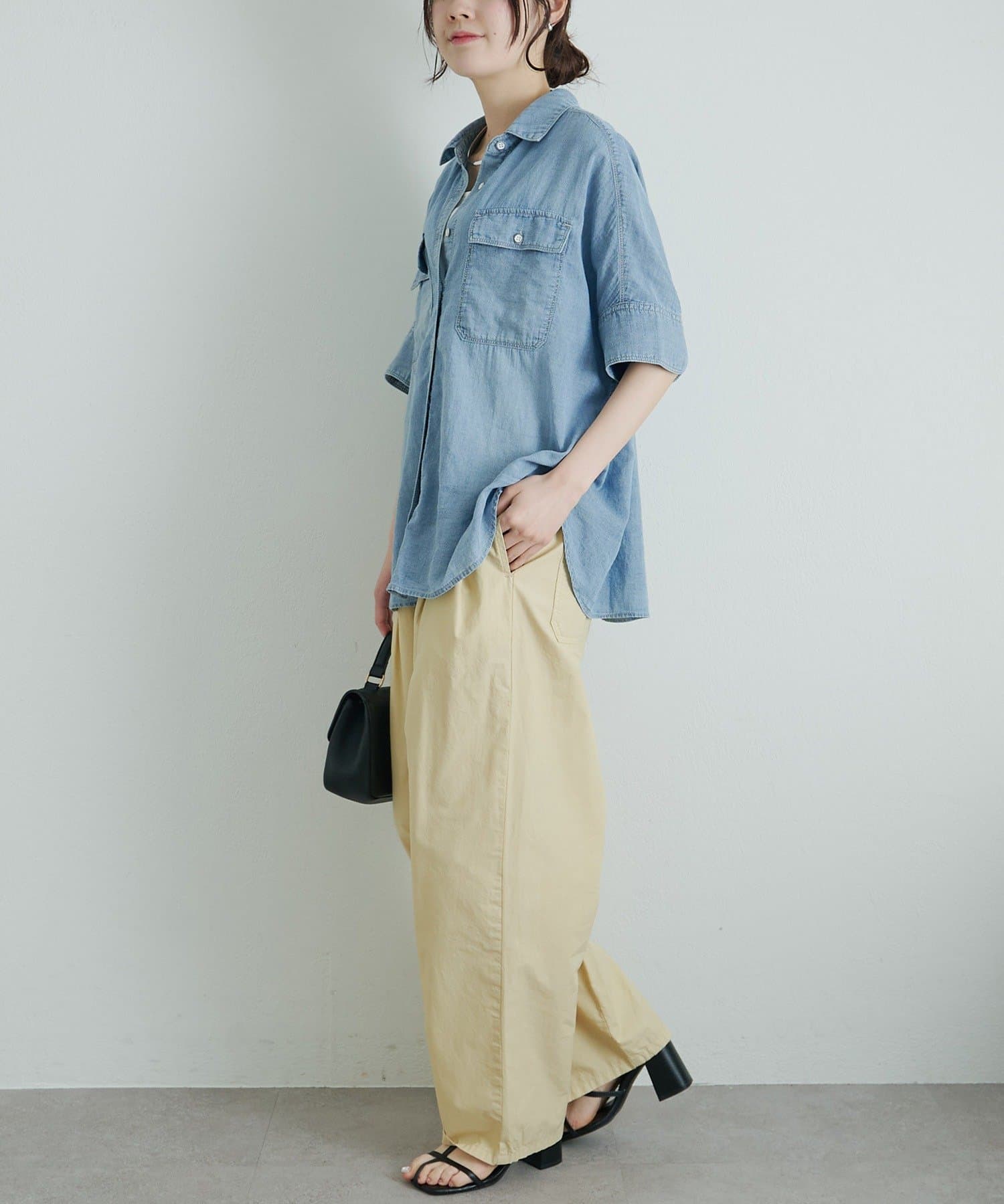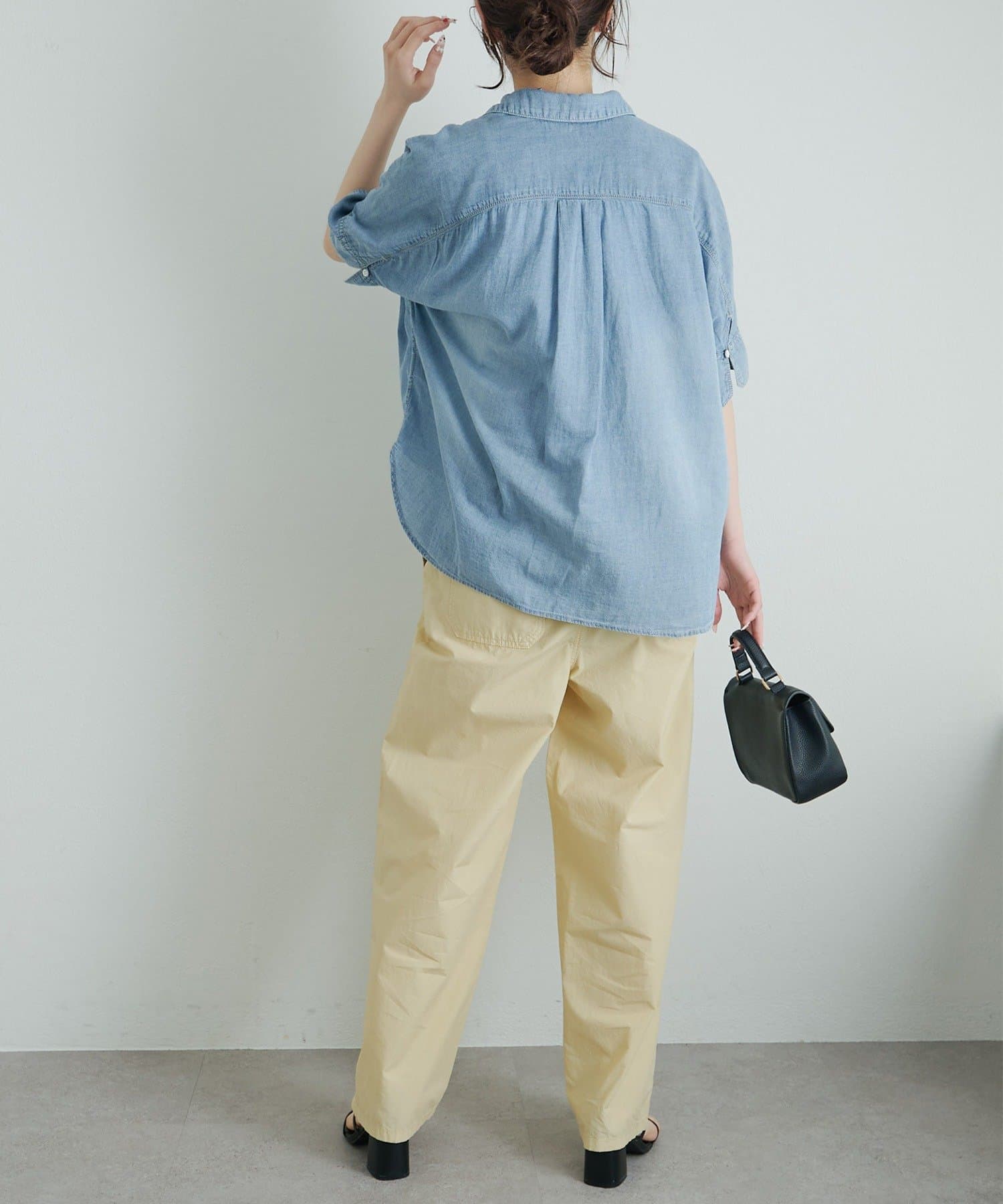 軽やかなシアーデニムを使用したハーフスリーブブラウスは、適度な透け感と爽やかさが魅力的。