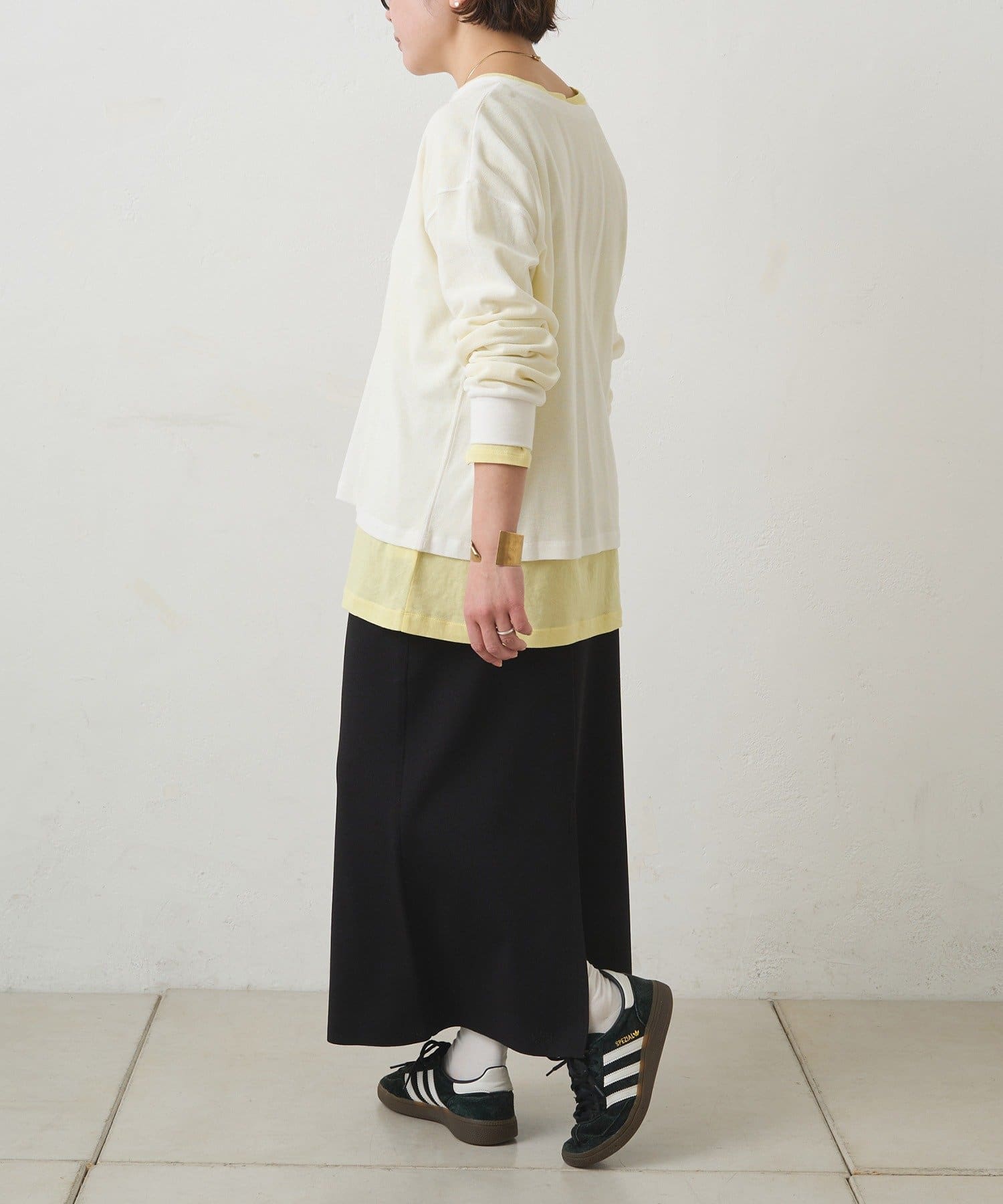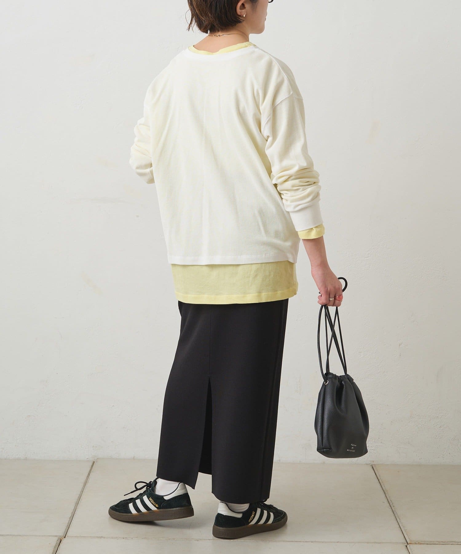 ドロップショルダーでゆとりのある身幅と、