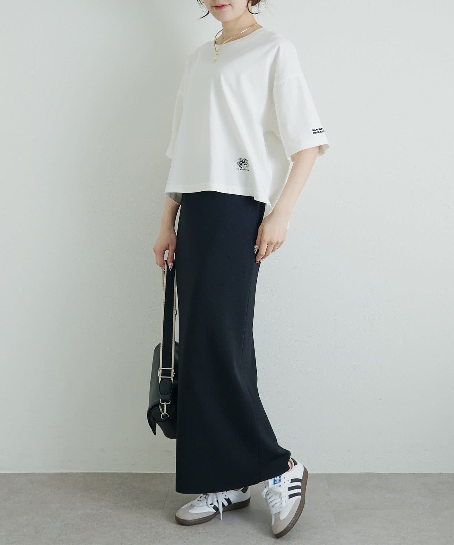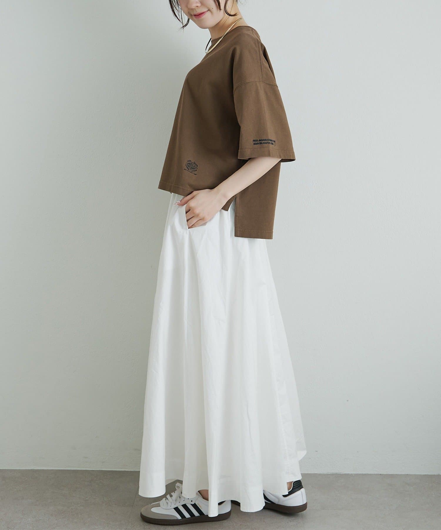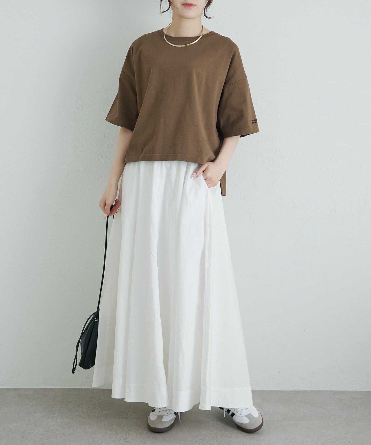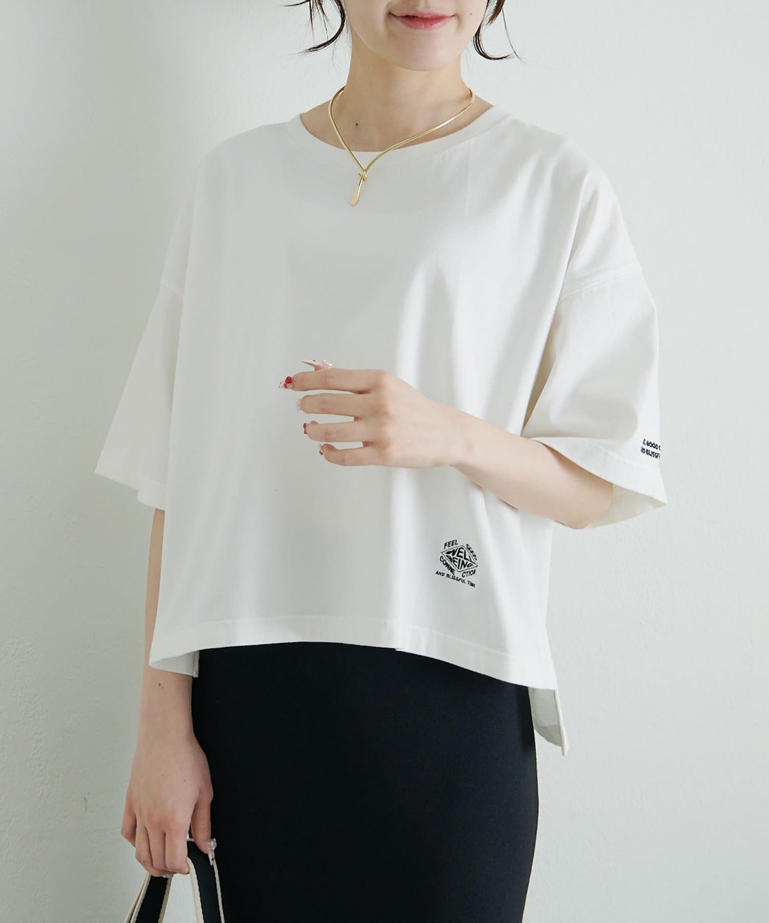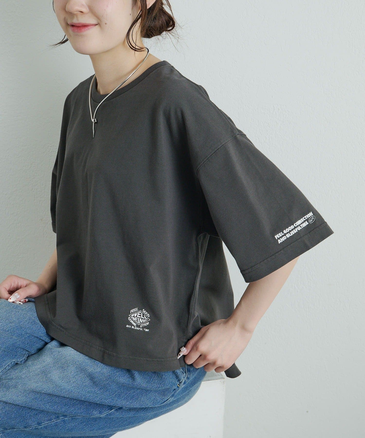 ボックスシルエットをゆったりとした身幅と短めの着丈で仕上げることで、