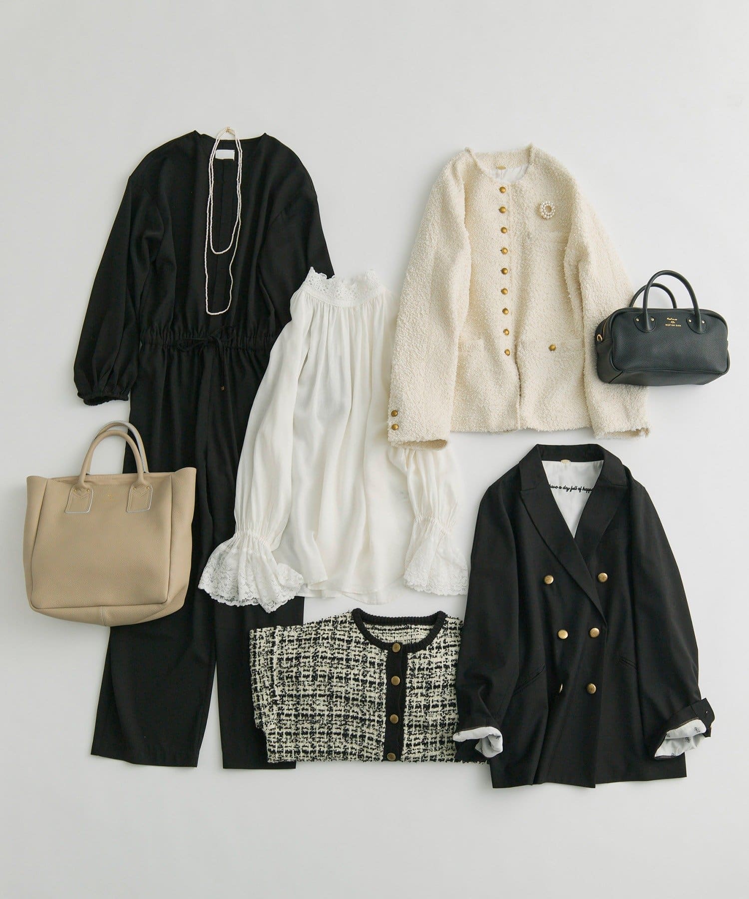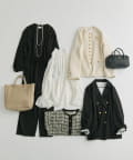 ノーカラーデザインなので、襟や袖にポイントがあるブラウスとのスタイリングで正統派な着こなしや、