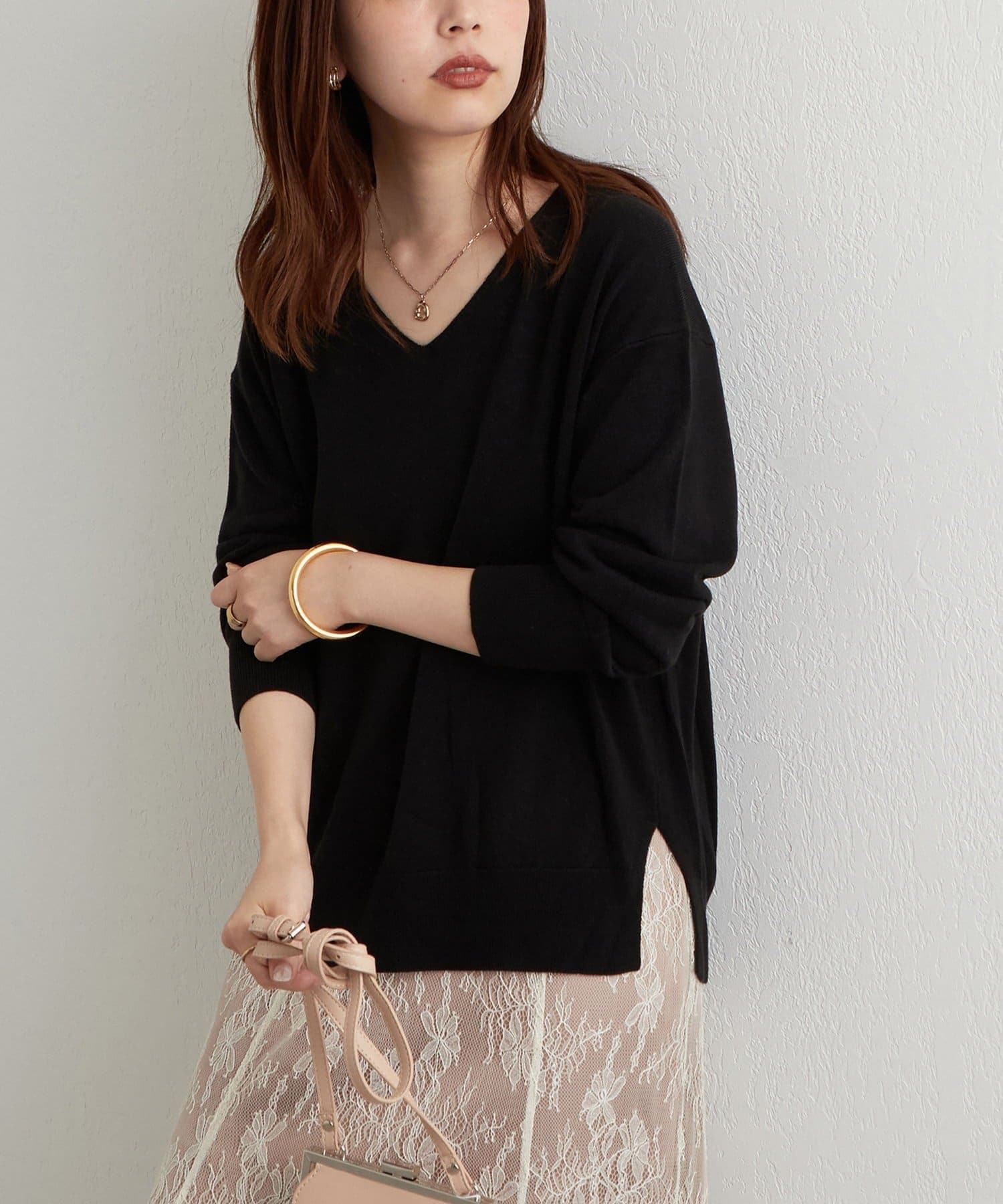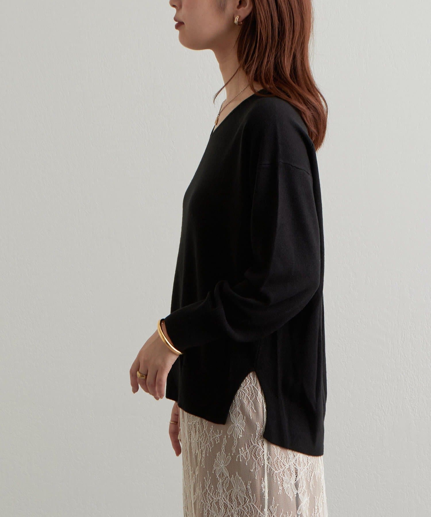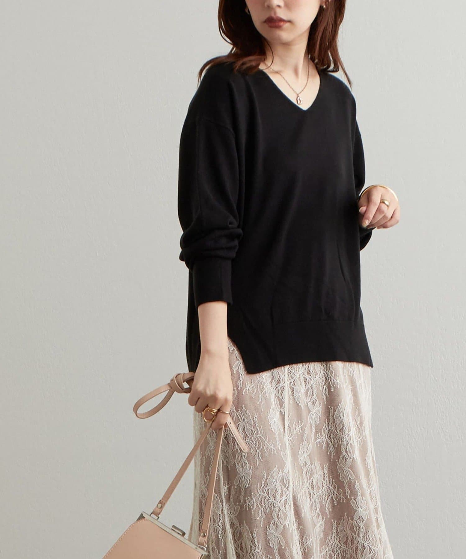 顔まわりをシャープに見せるVネックに、体のラインを拾いすぎないシルエットが重宝する1枚です。