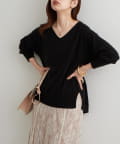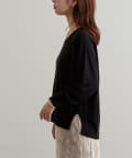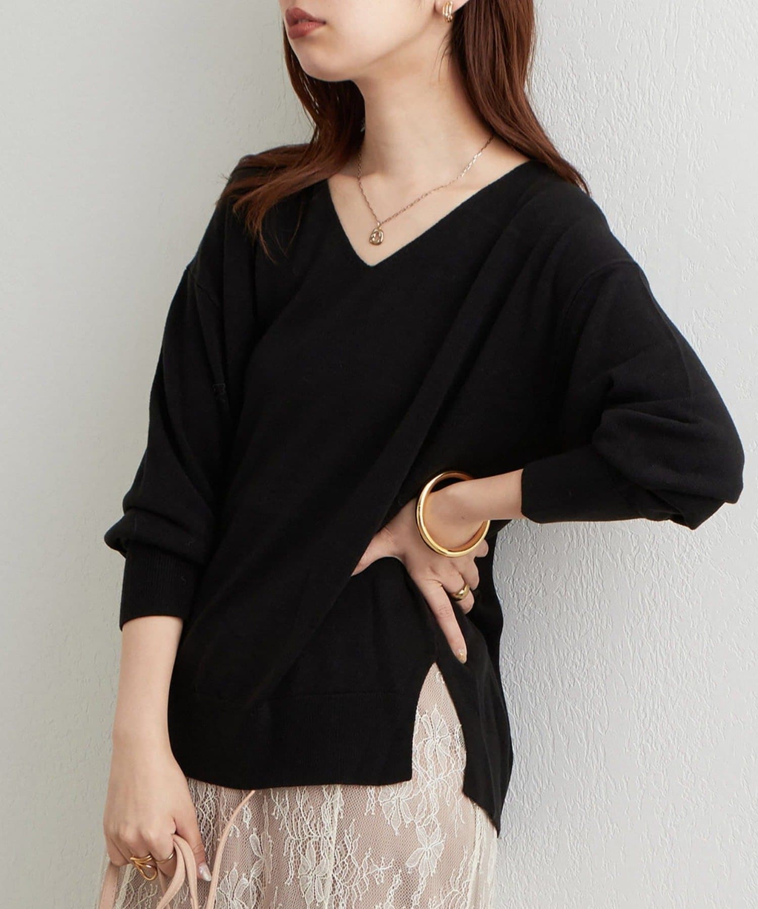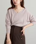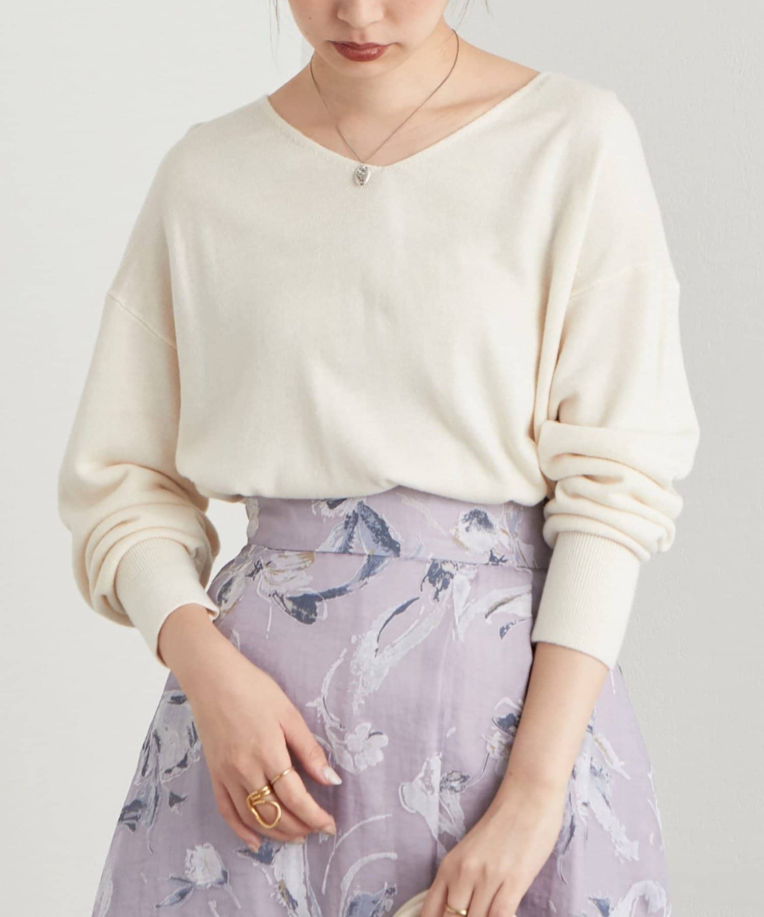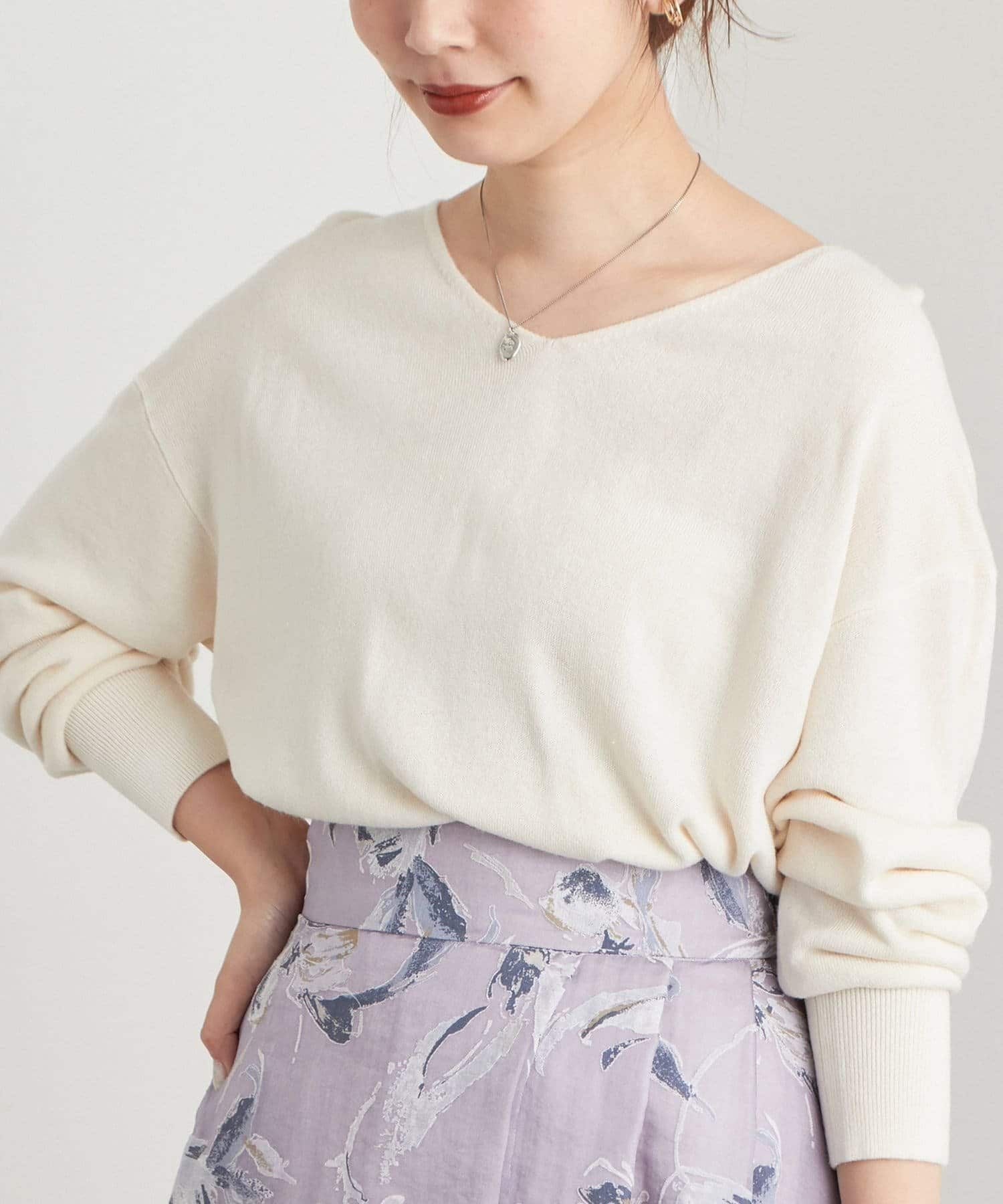 顔まわりをシャープに見せるVネックに、体のラインを拾いすぎないシルエットが重宝する1枚です。