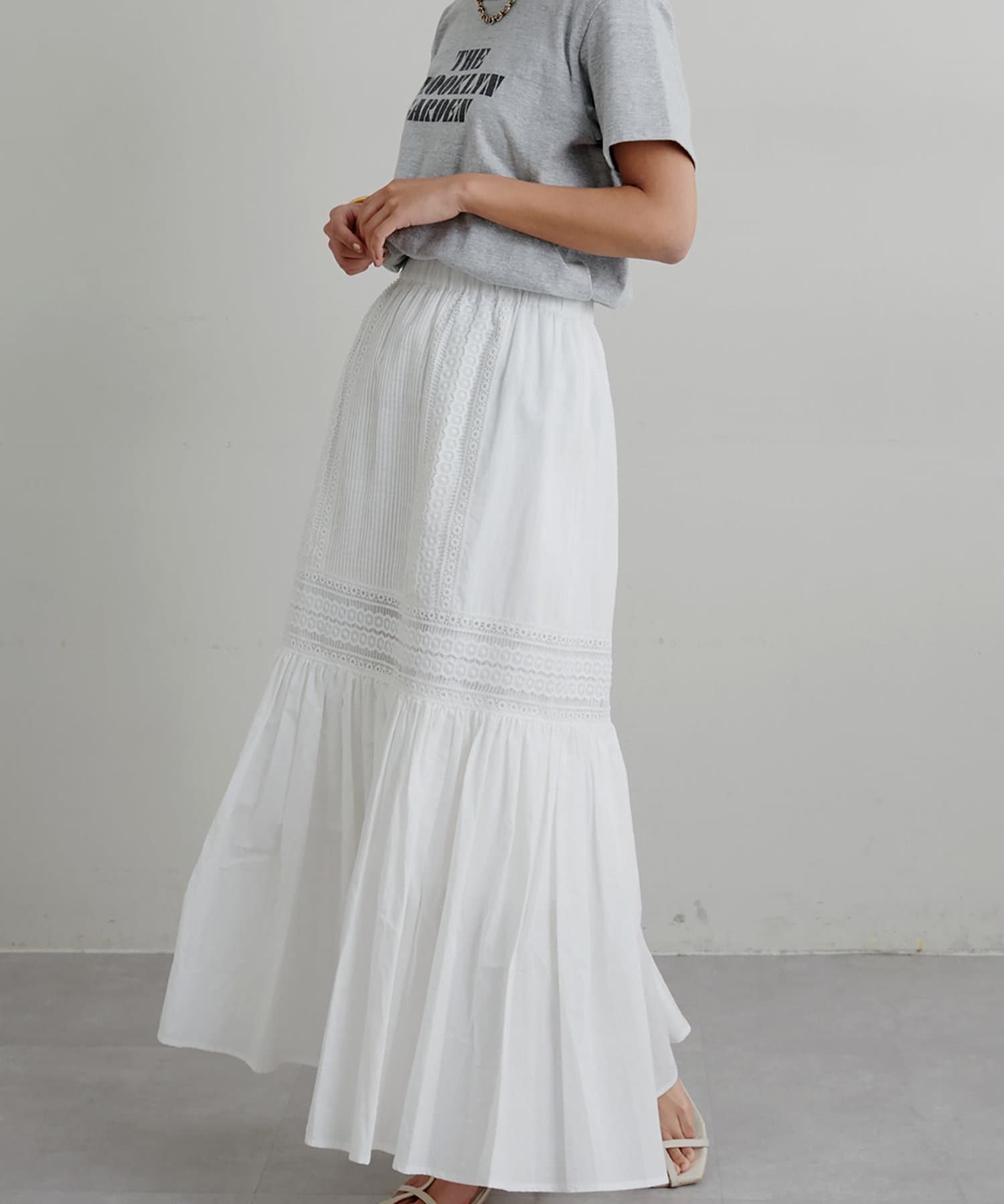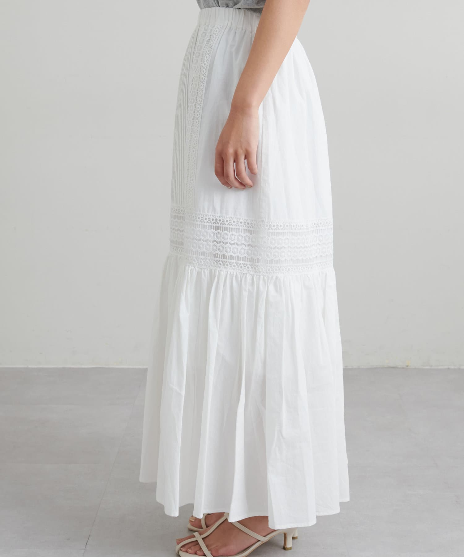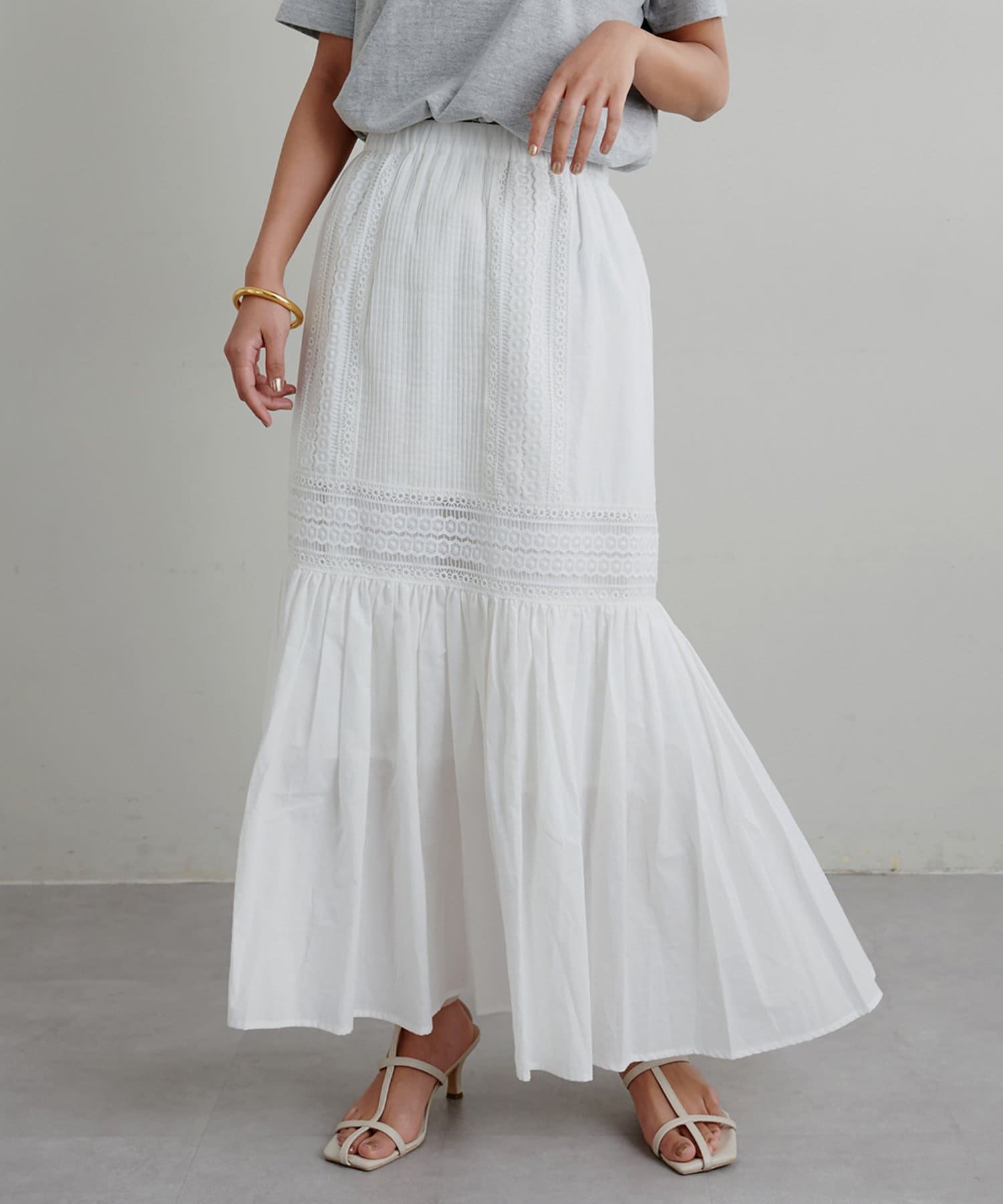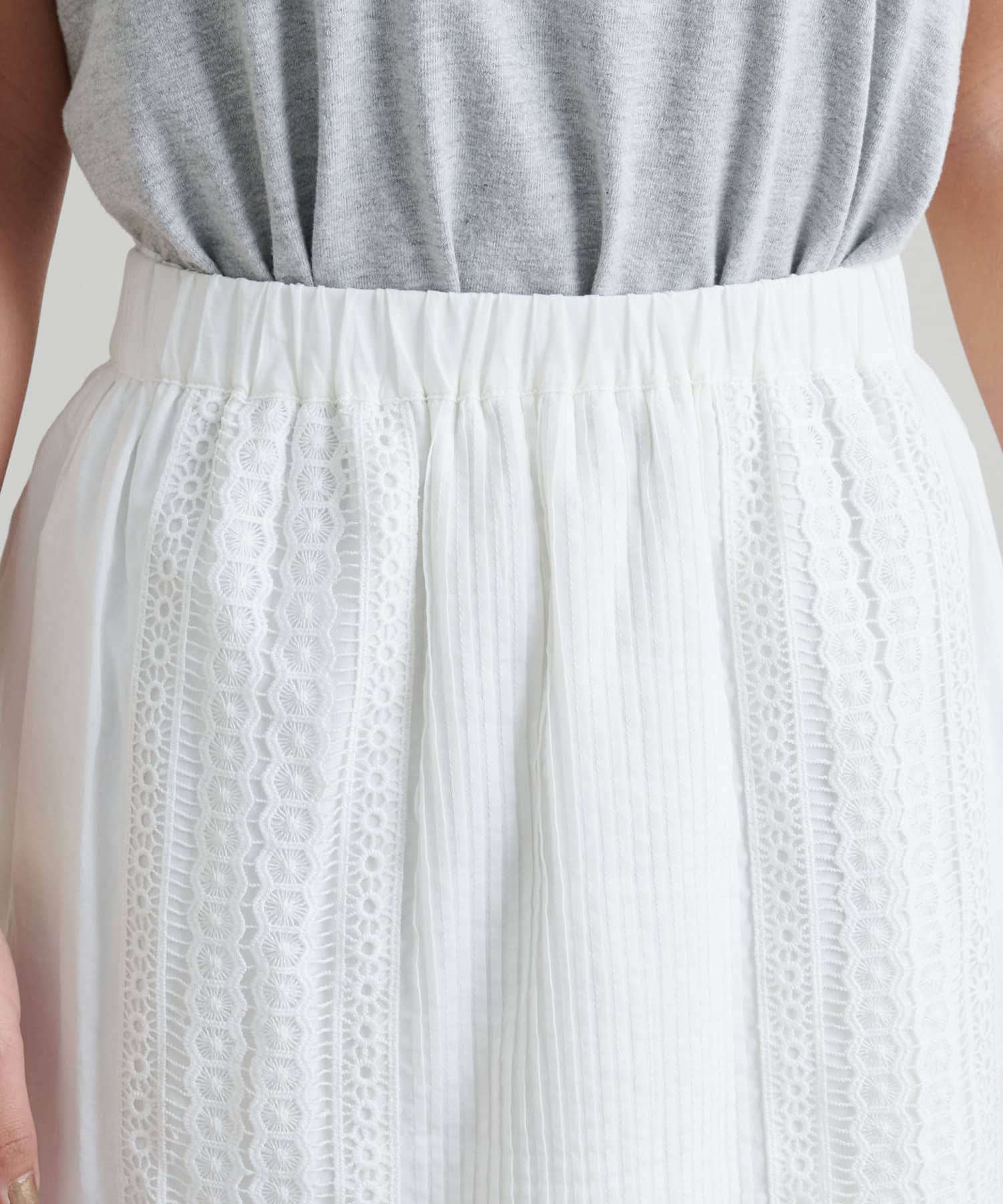フロント部分に細かいピンタックをふんだんにあしらった贅沢なレーススカート。