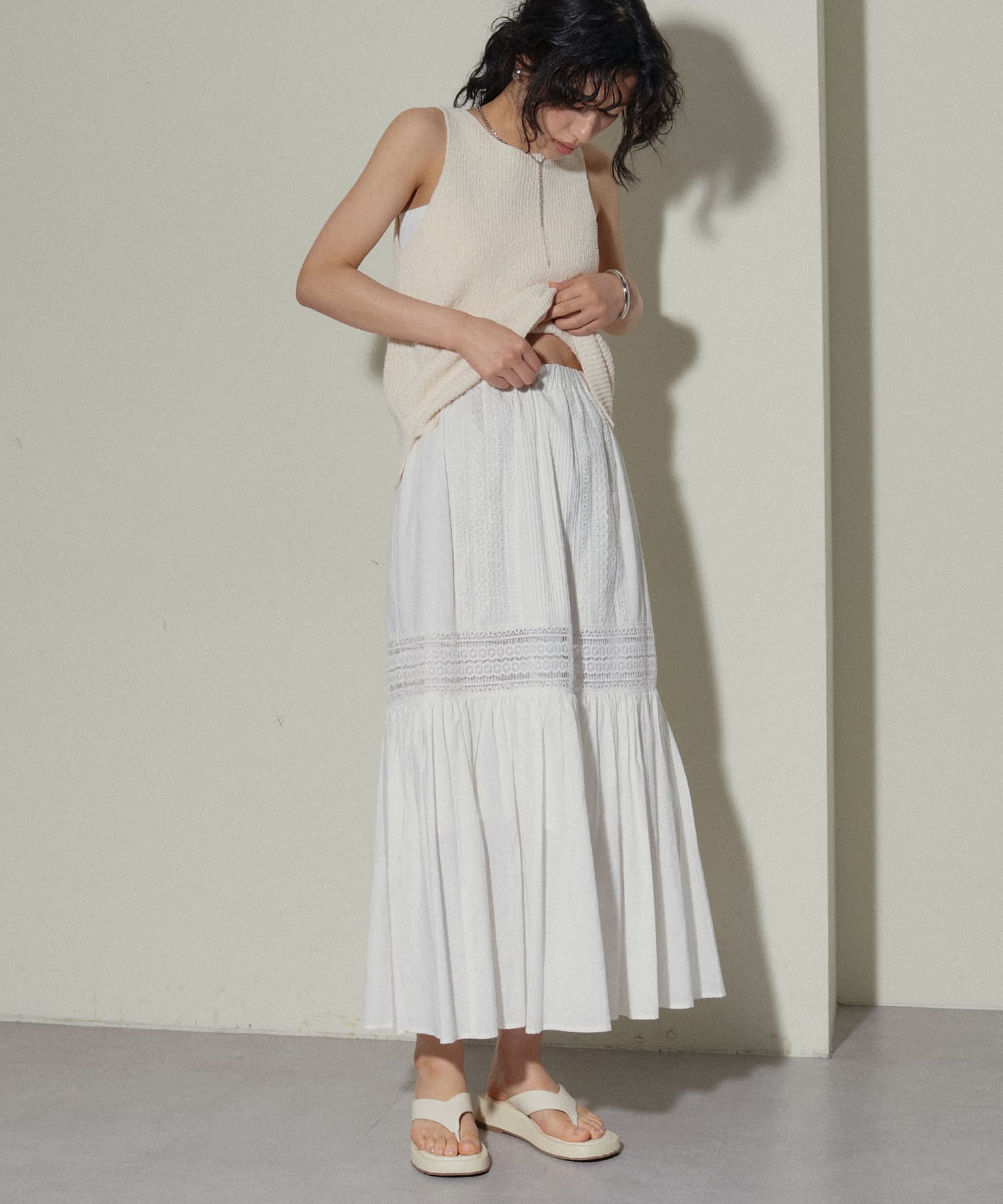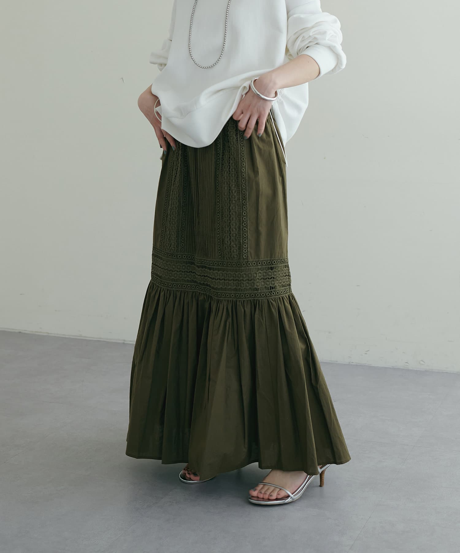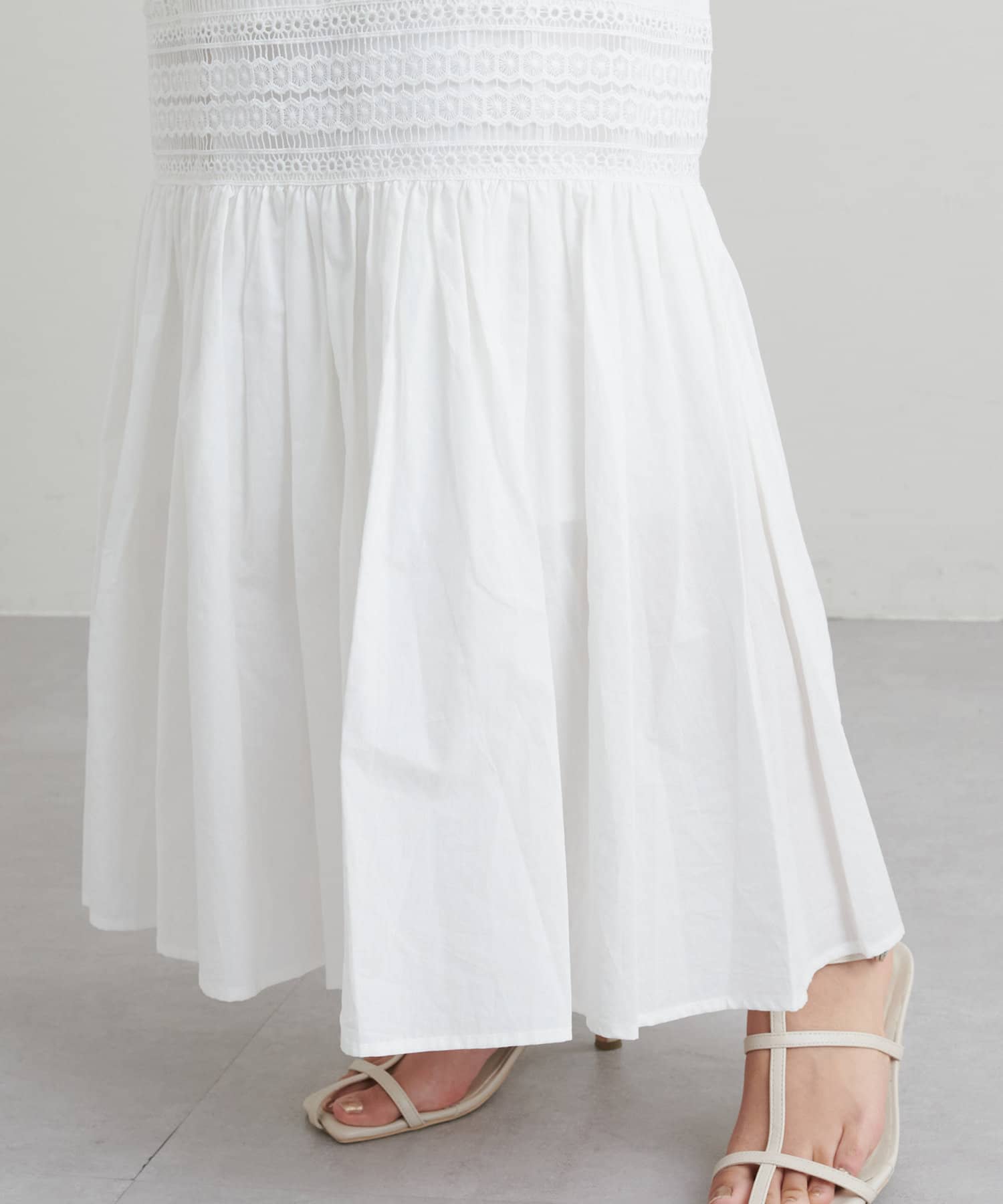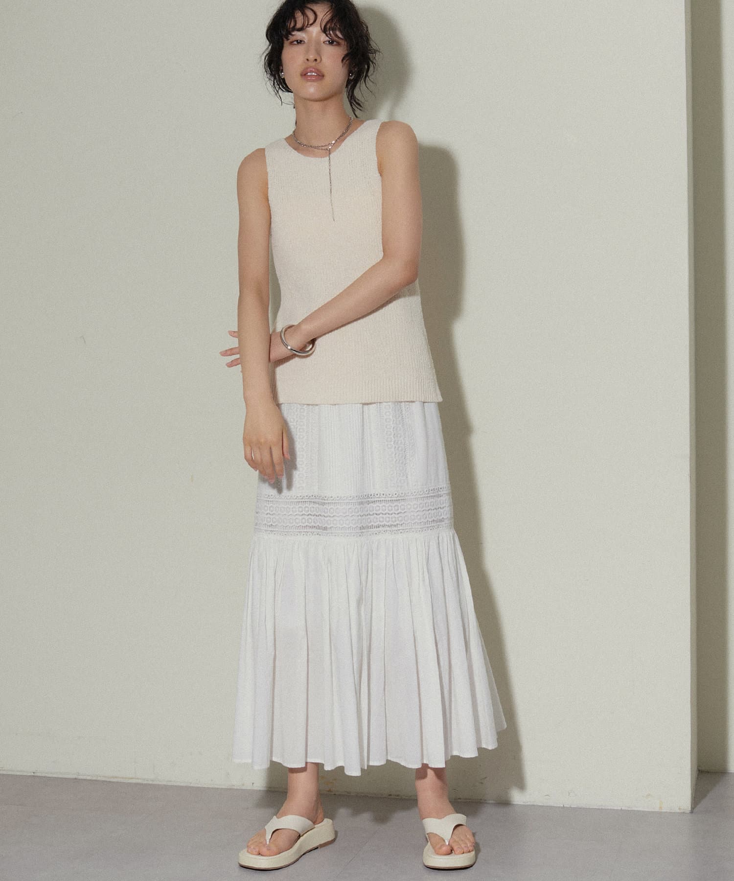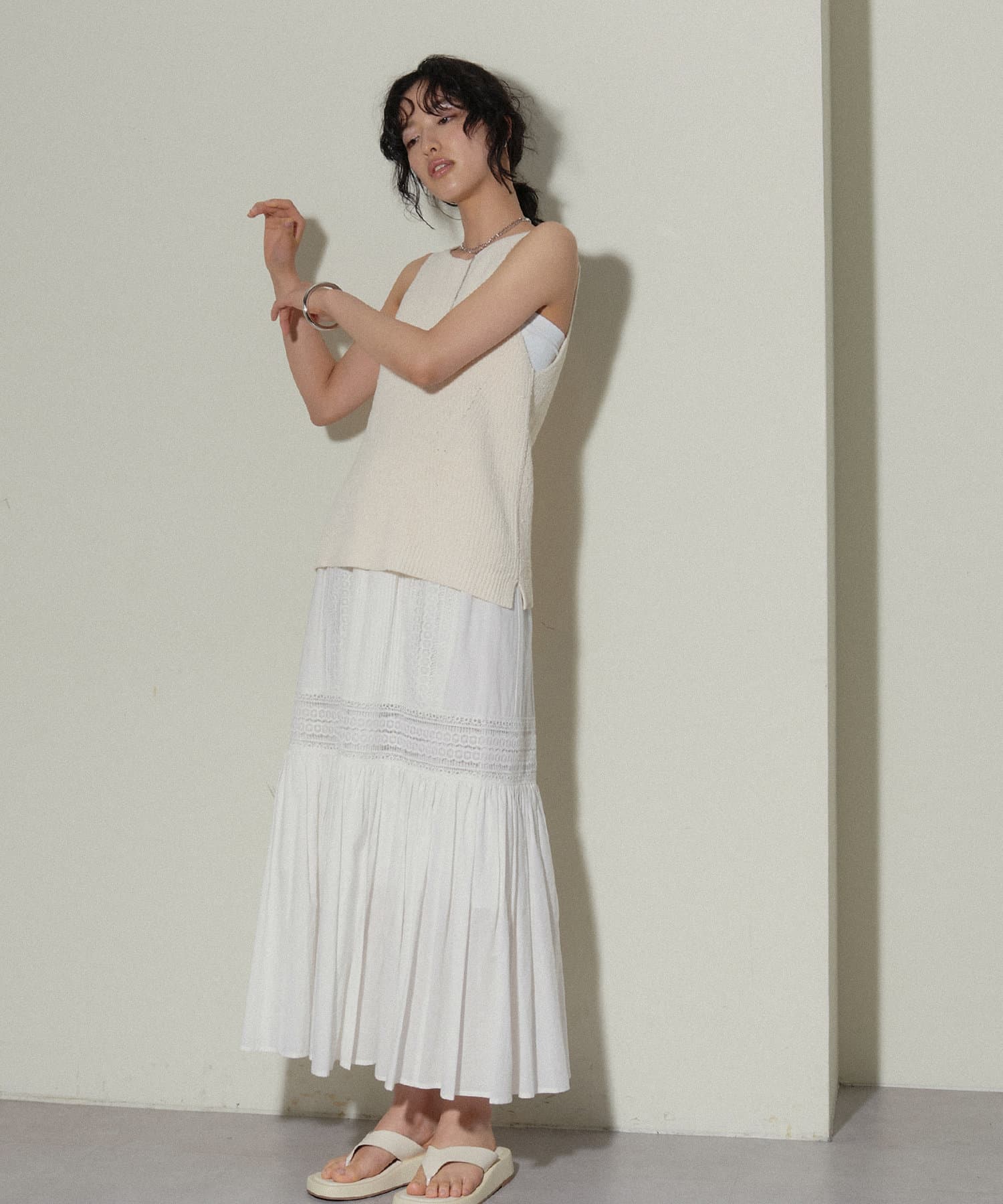 フロント部分に細かいピンタックをふんだんにあしらった贅沢なレーススカート。