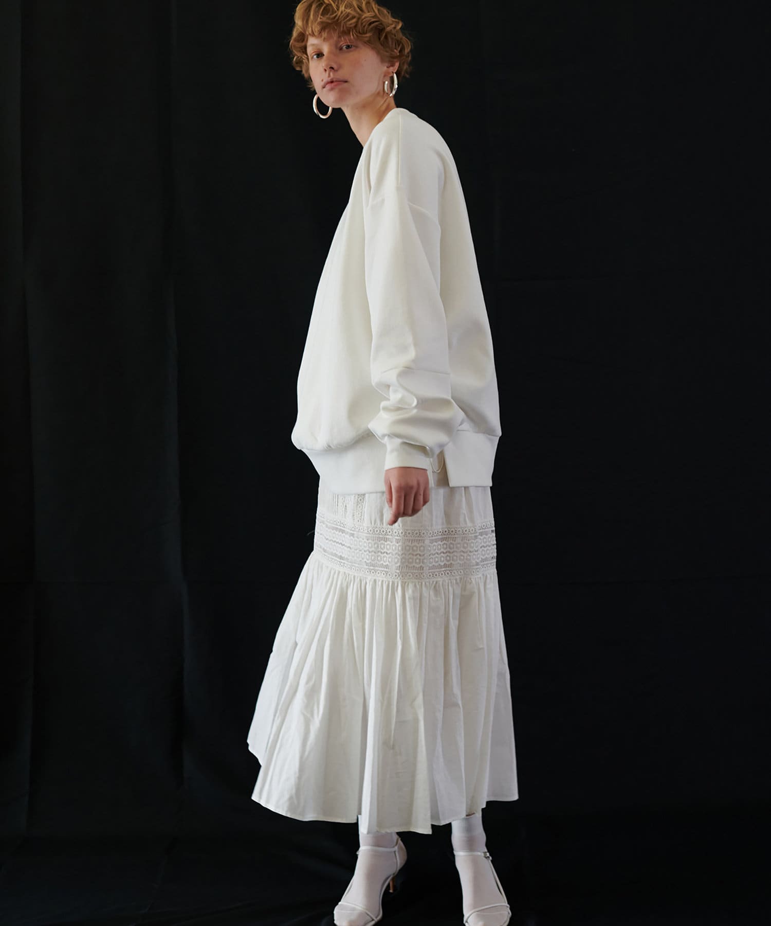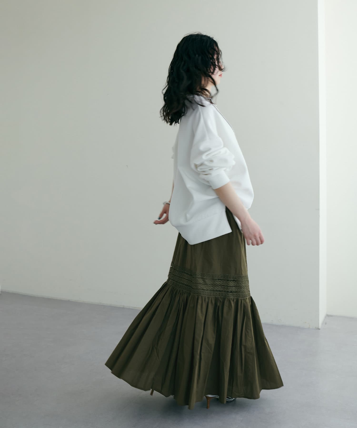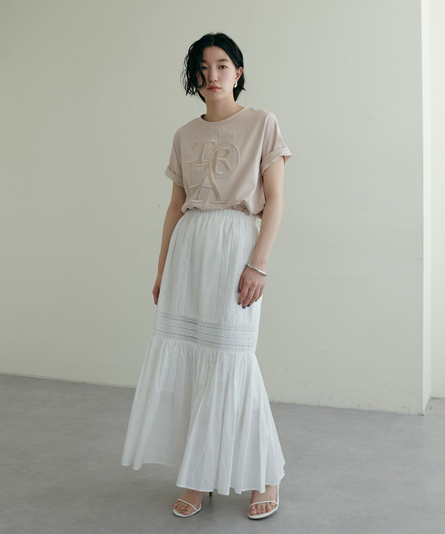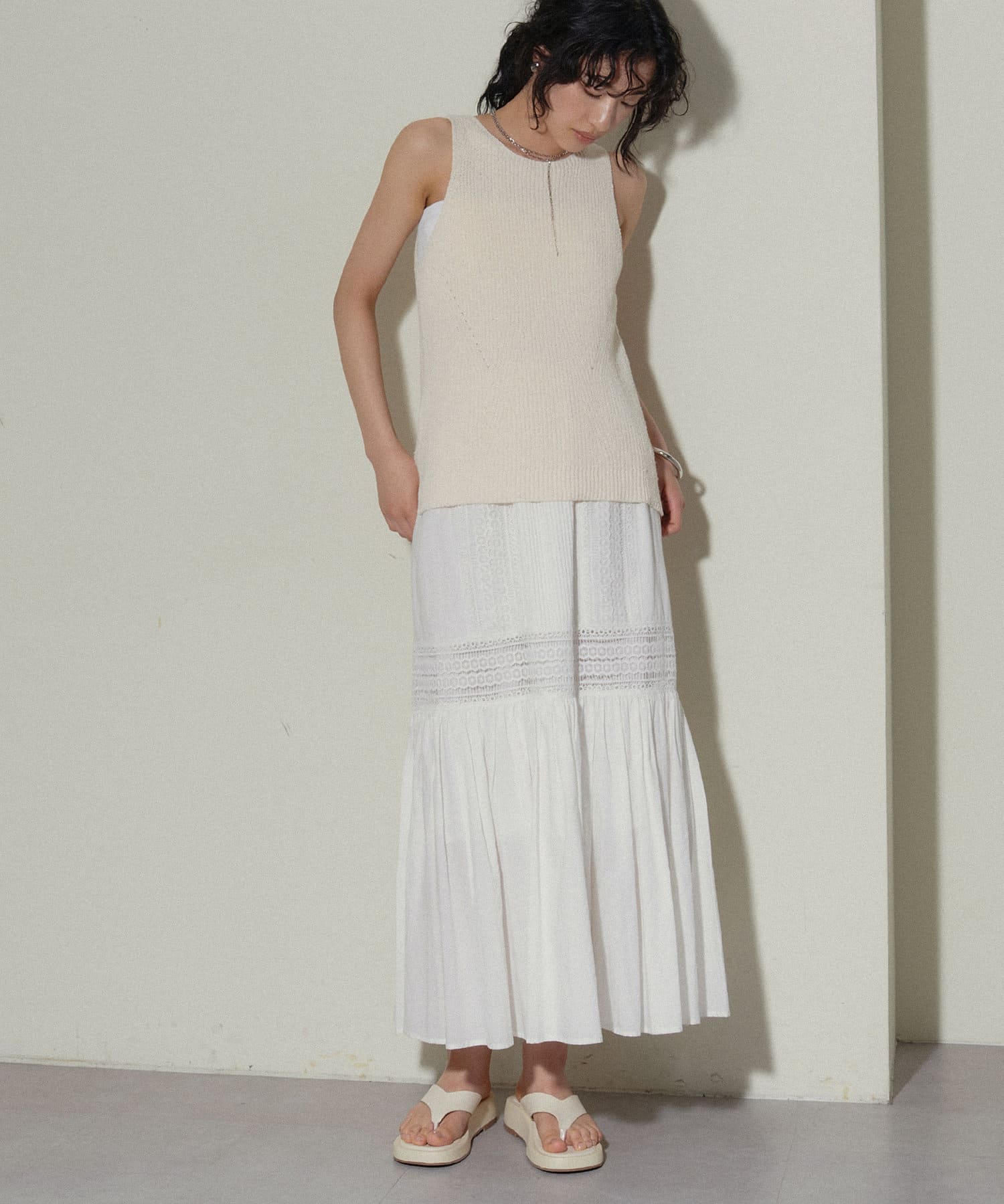 フロント部分に細かいピンタックをふんだんにあしらった贅沢なレーススカート。