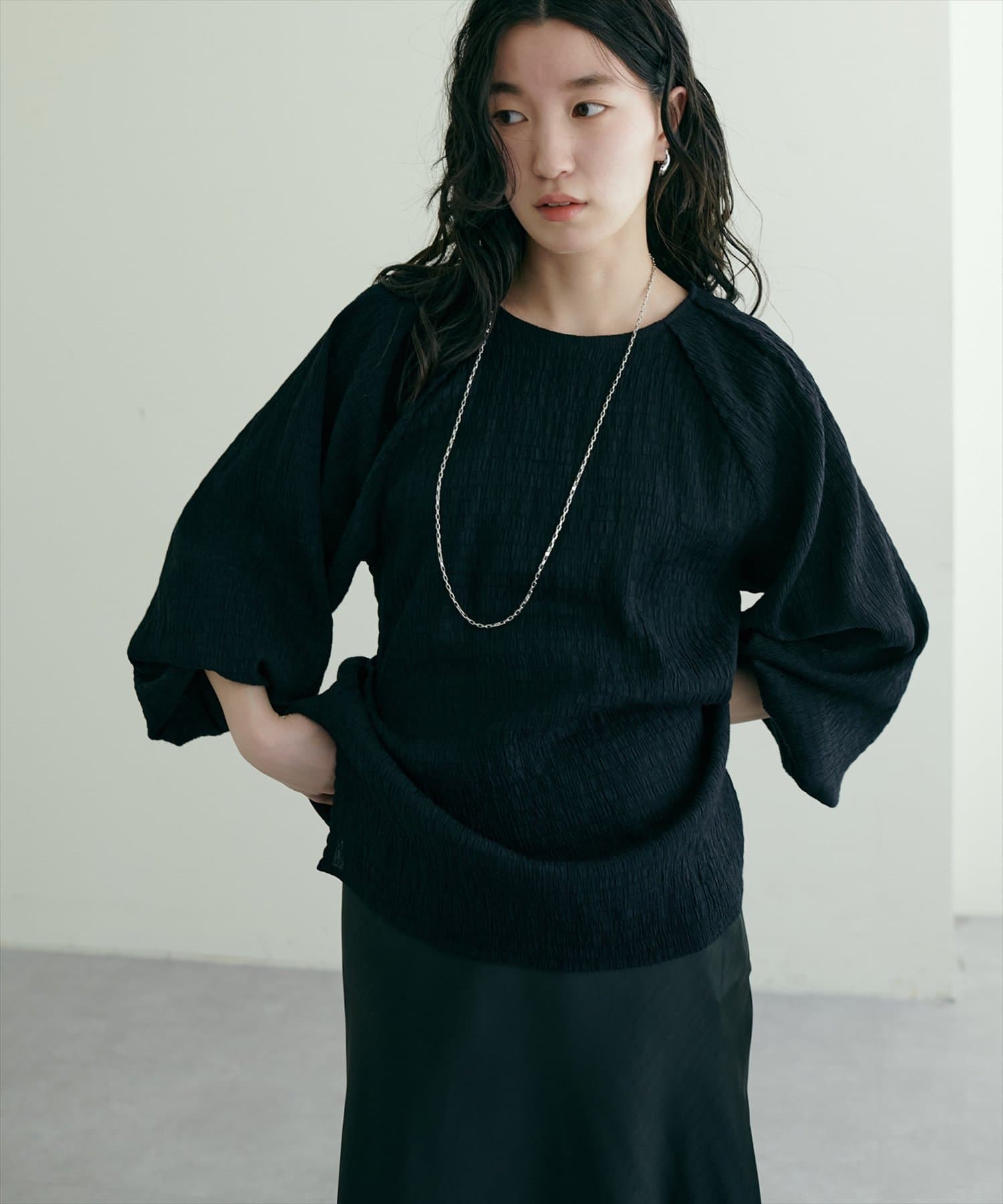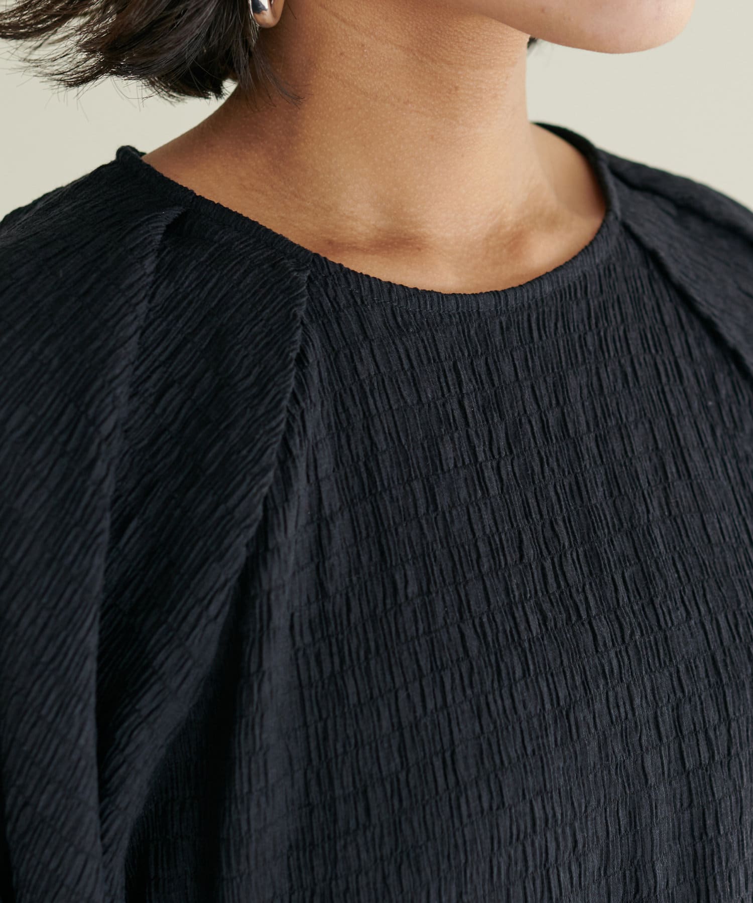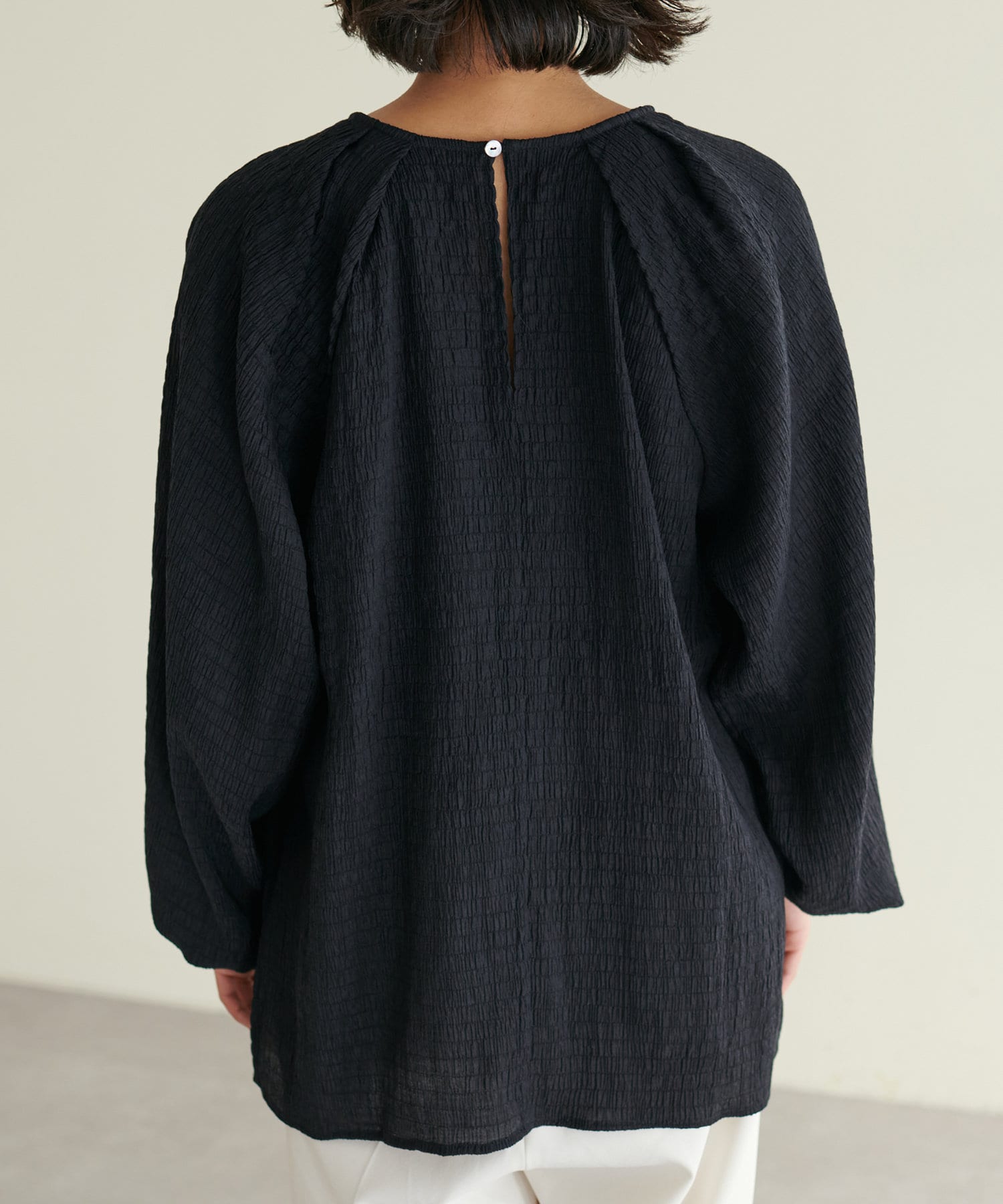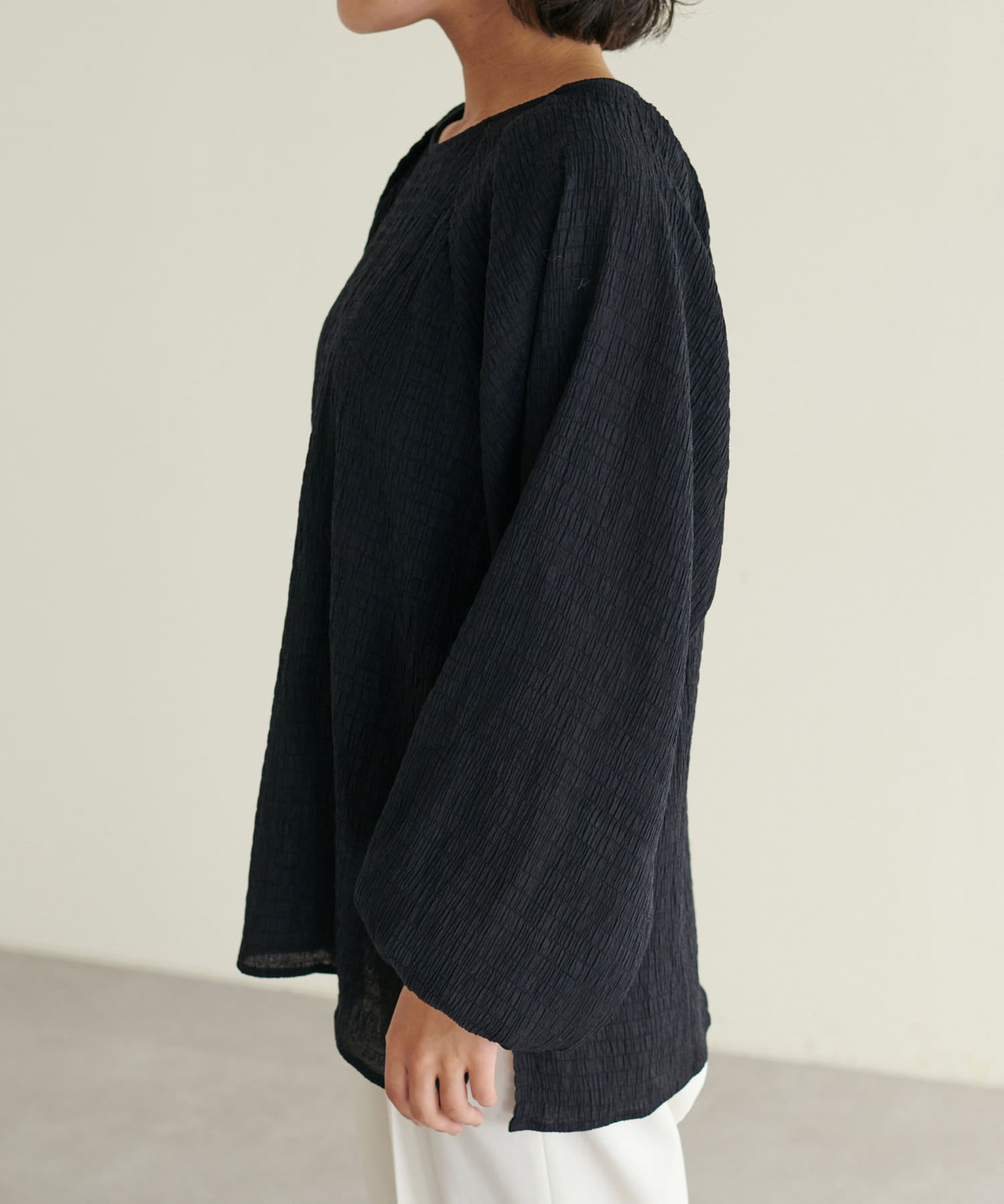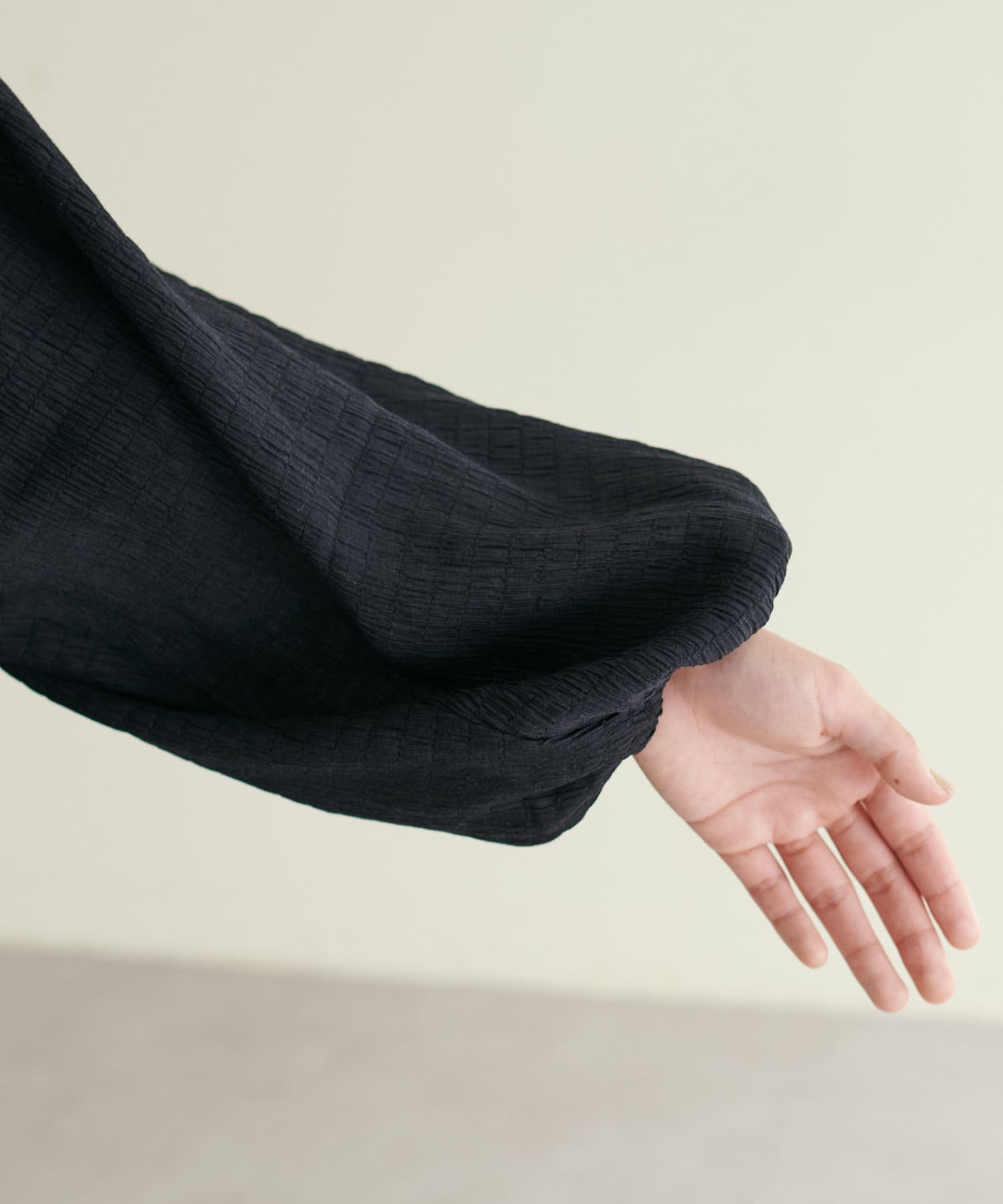 ポコポコした素材とボリューム袖がかわいいです。
