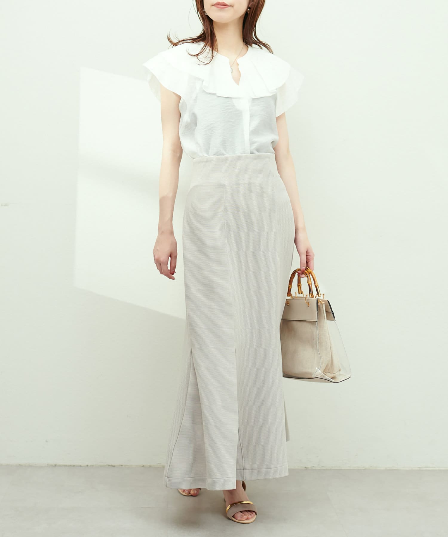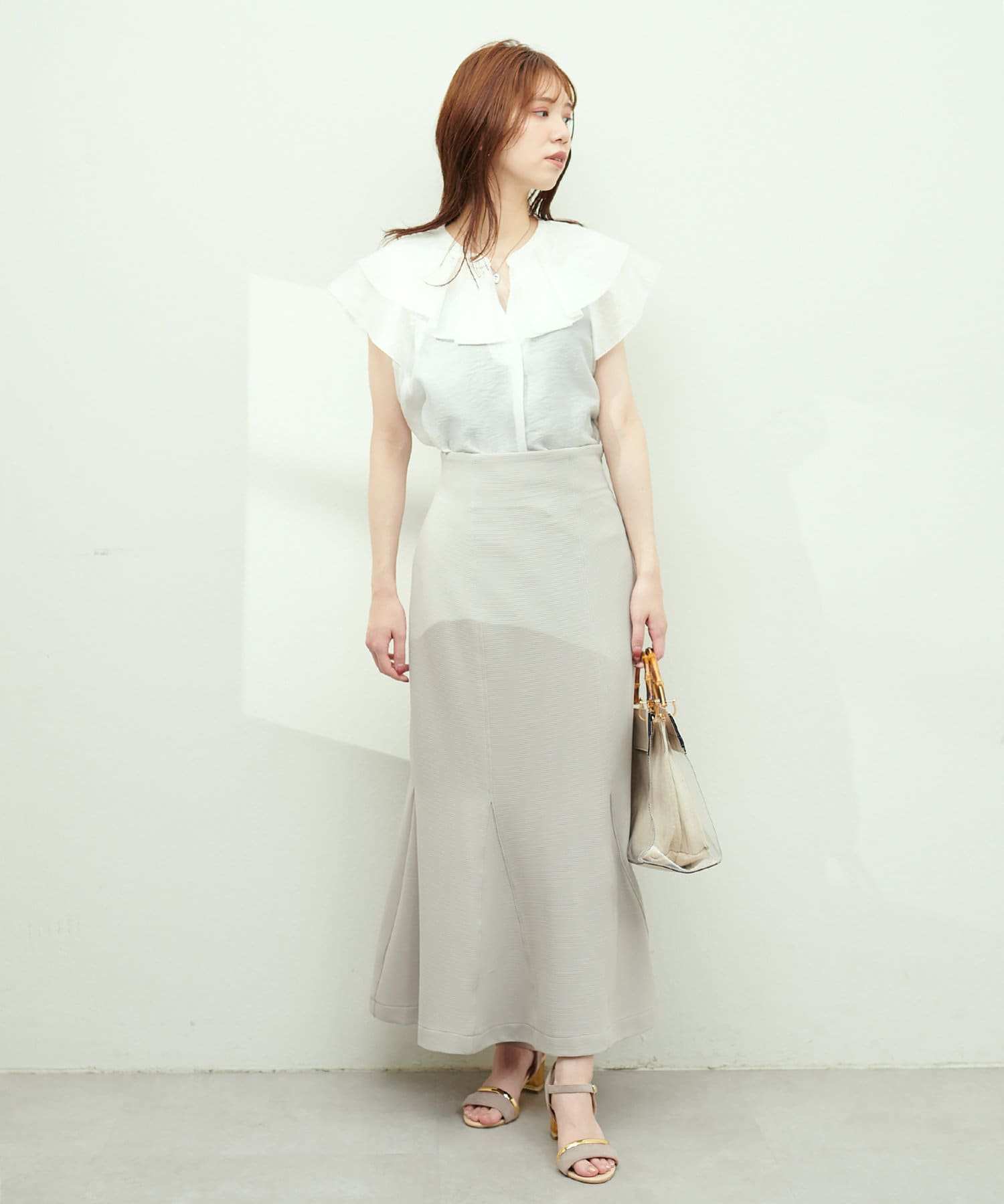 マーメイドシルエットやフレアラインのスカートにウエストインして頂くと、女性らしさが引き立つ上品スタイルに◎