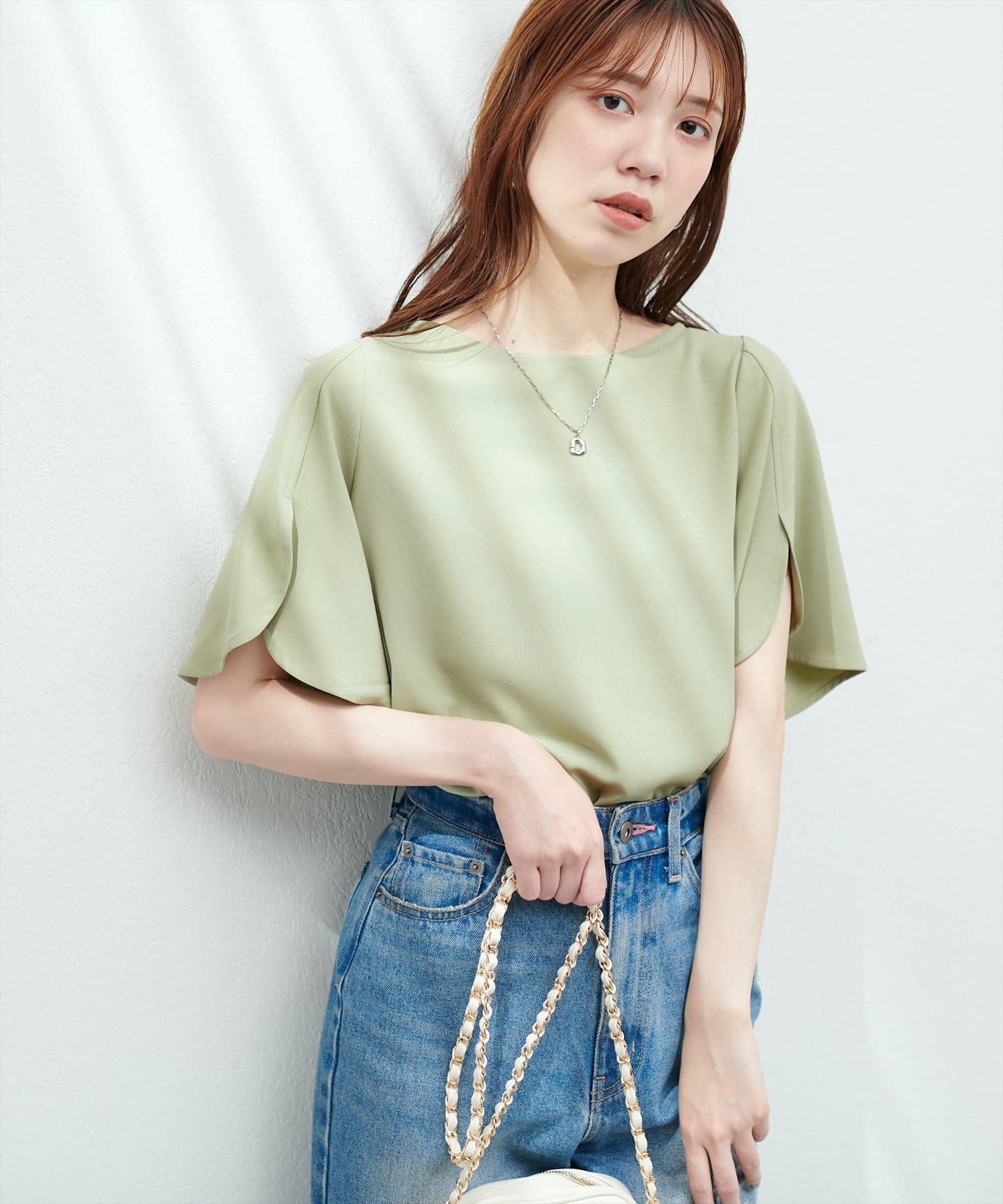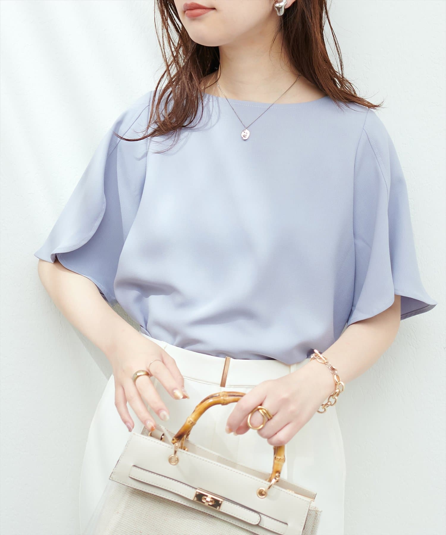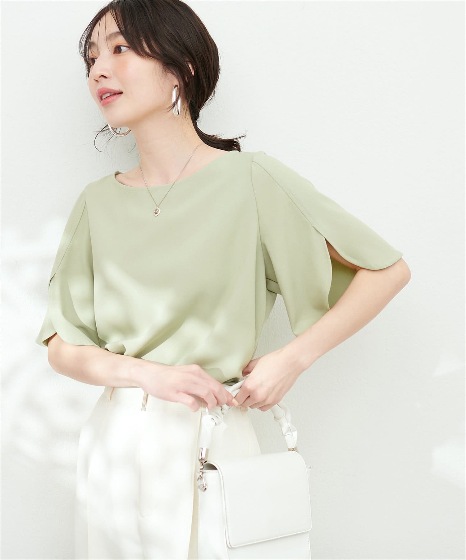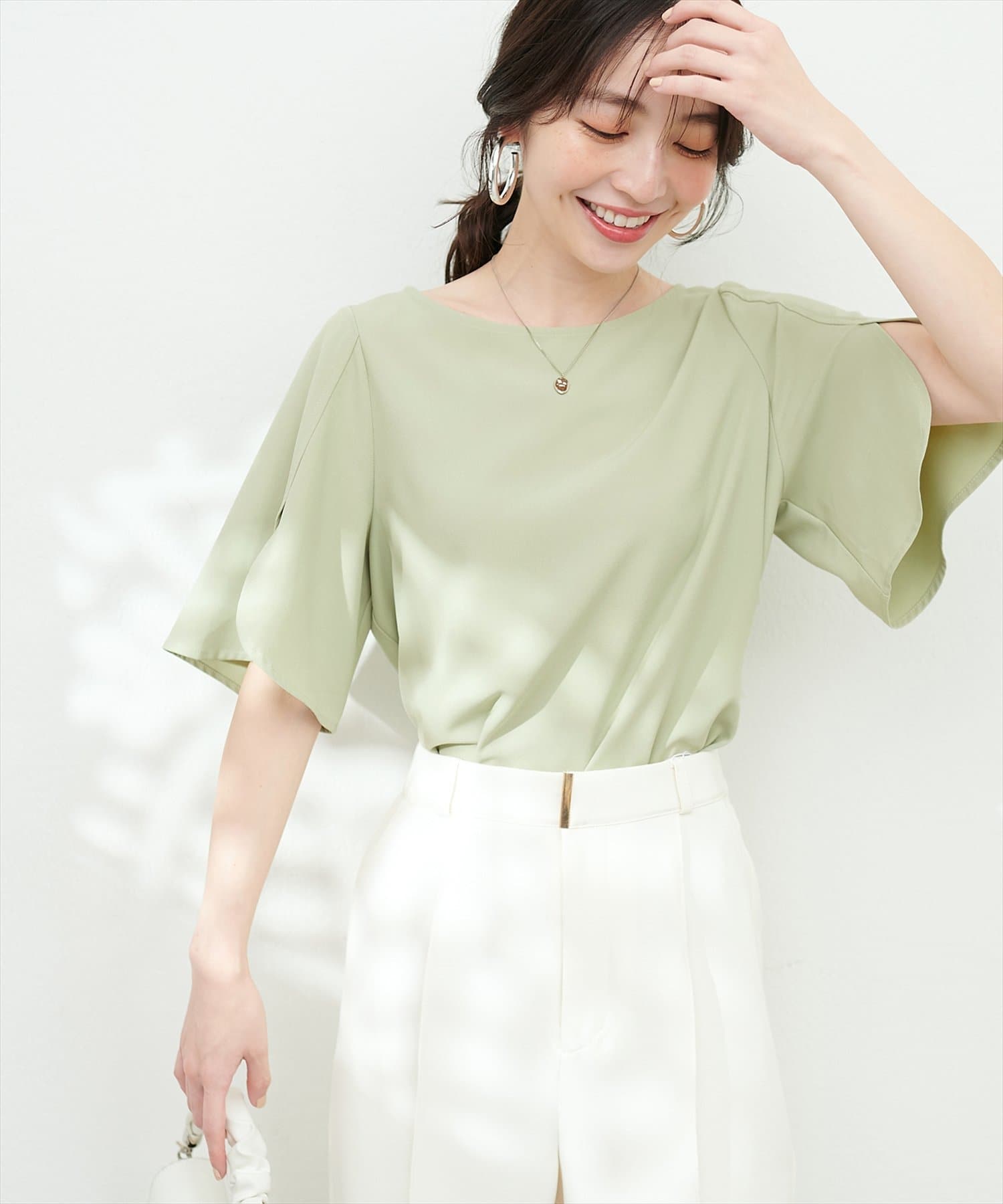 袖にハチワレのようなスリットを施した遊び心のある半袖ブラウス。