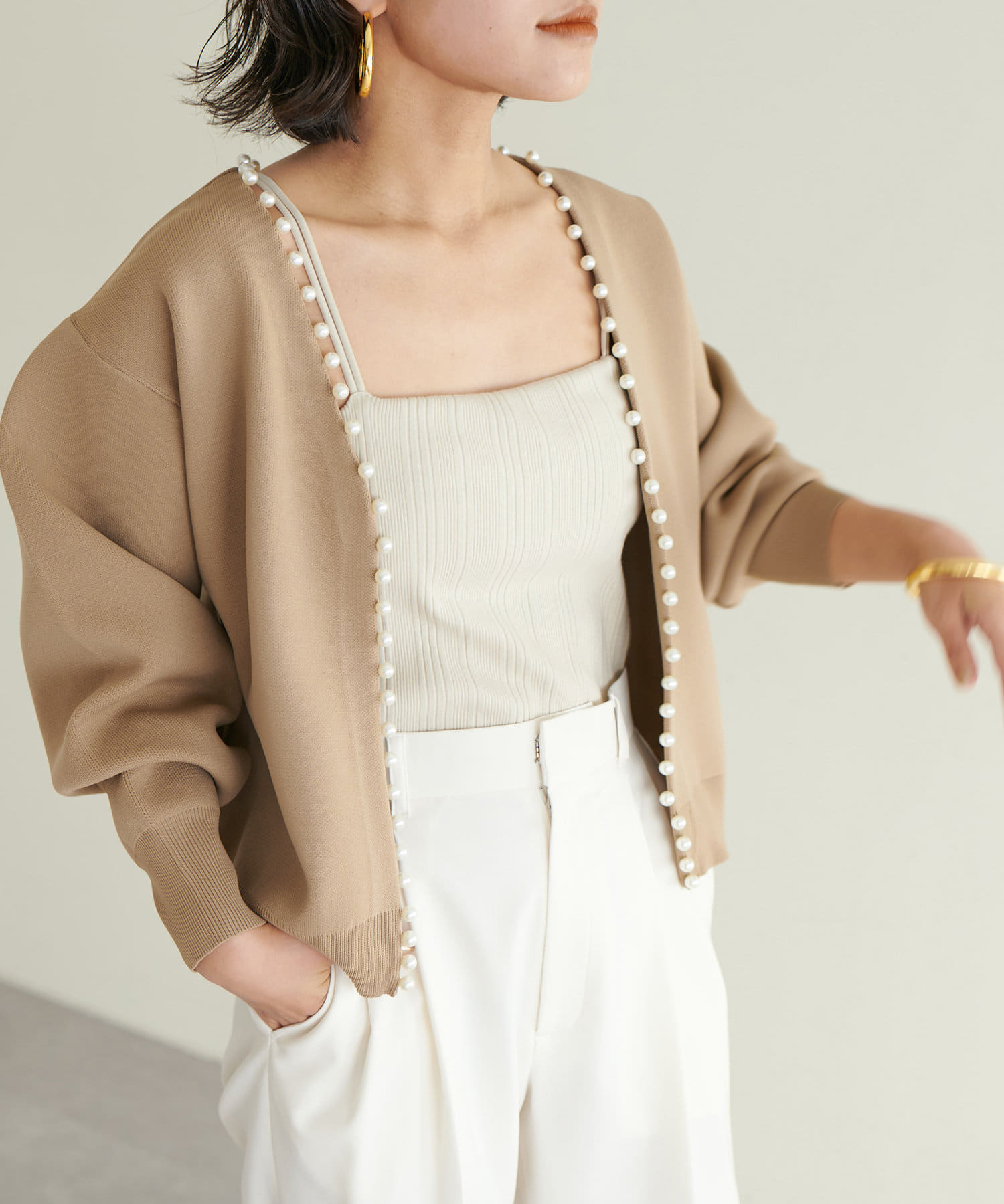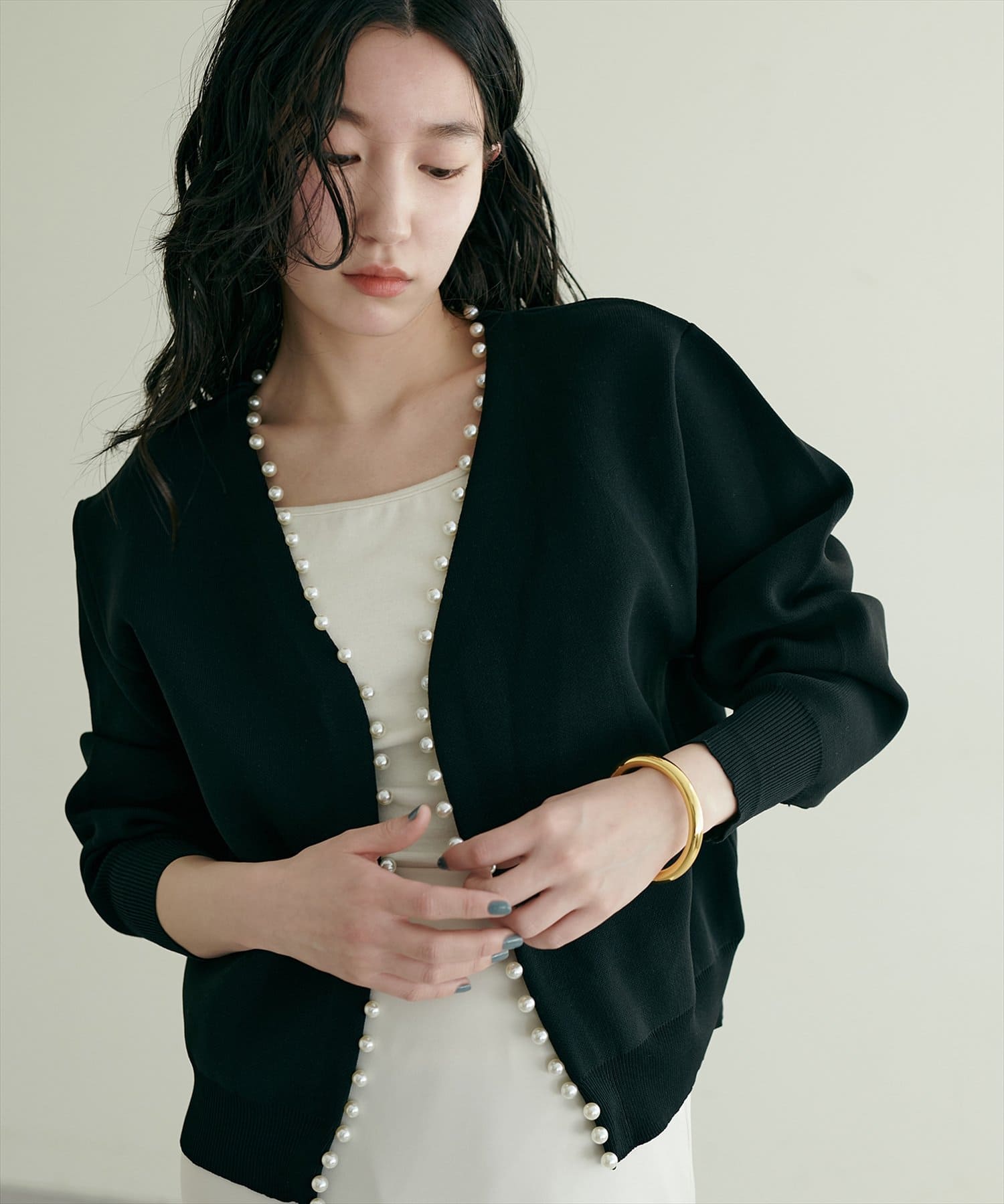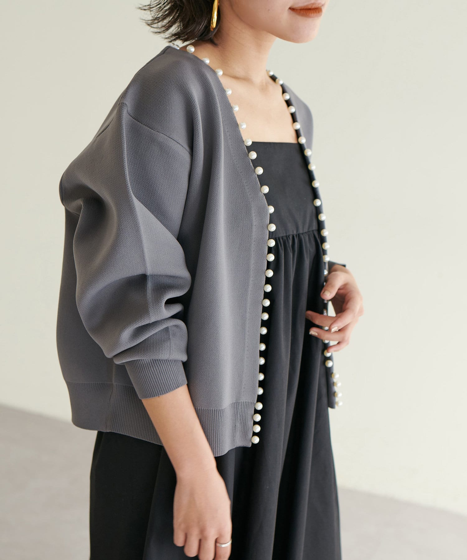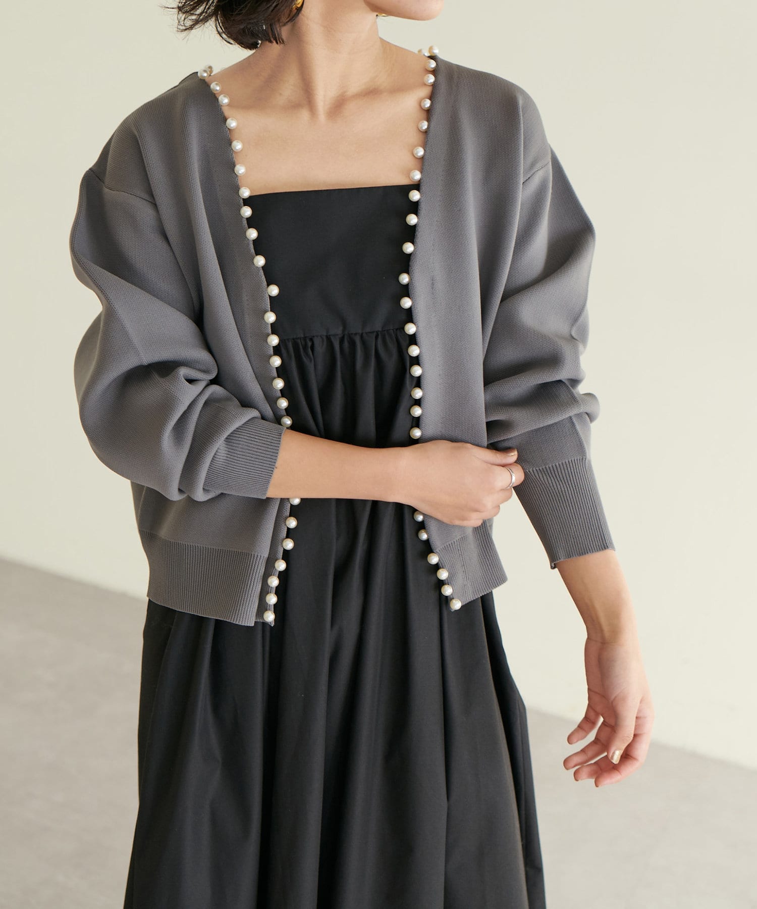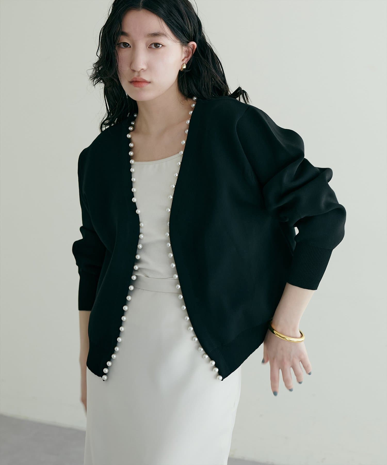 パッと見ただけで可愛らしい、襟ぐりから前立てに並んだパールが印象的なカーディガン。