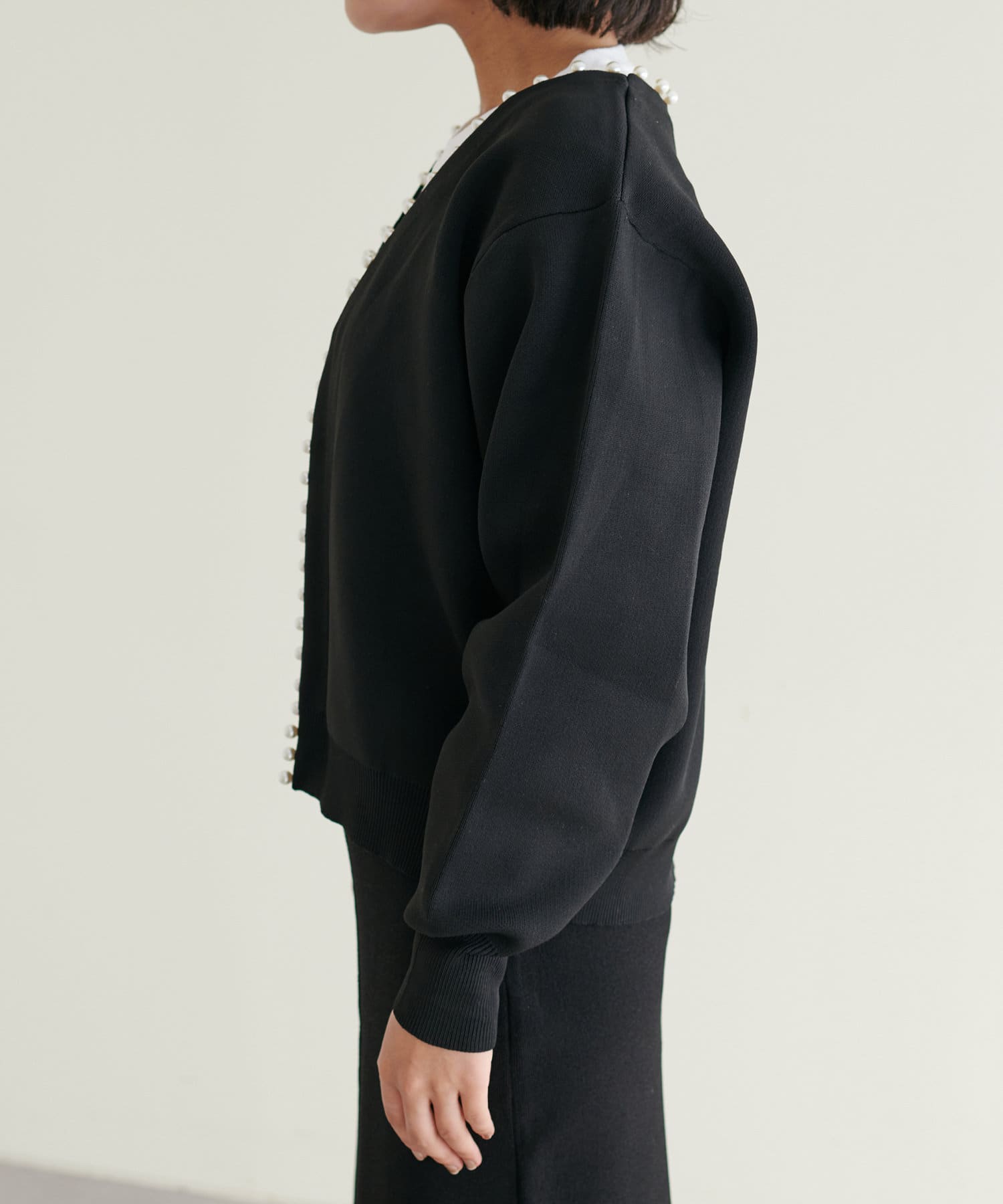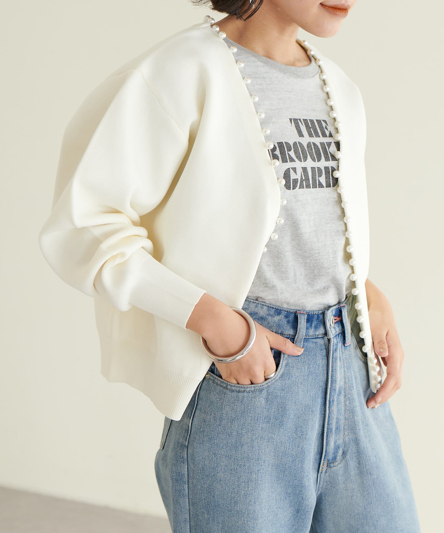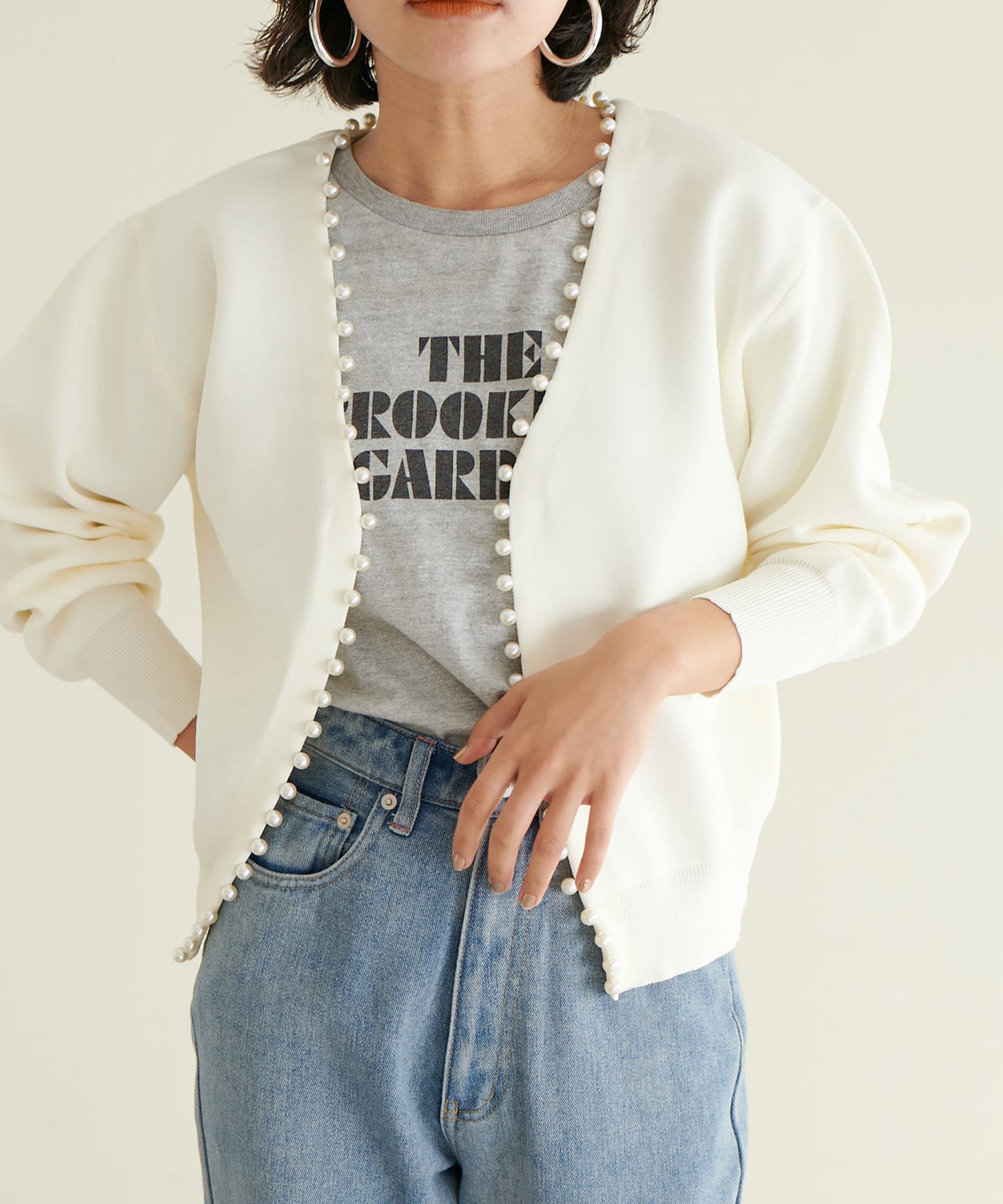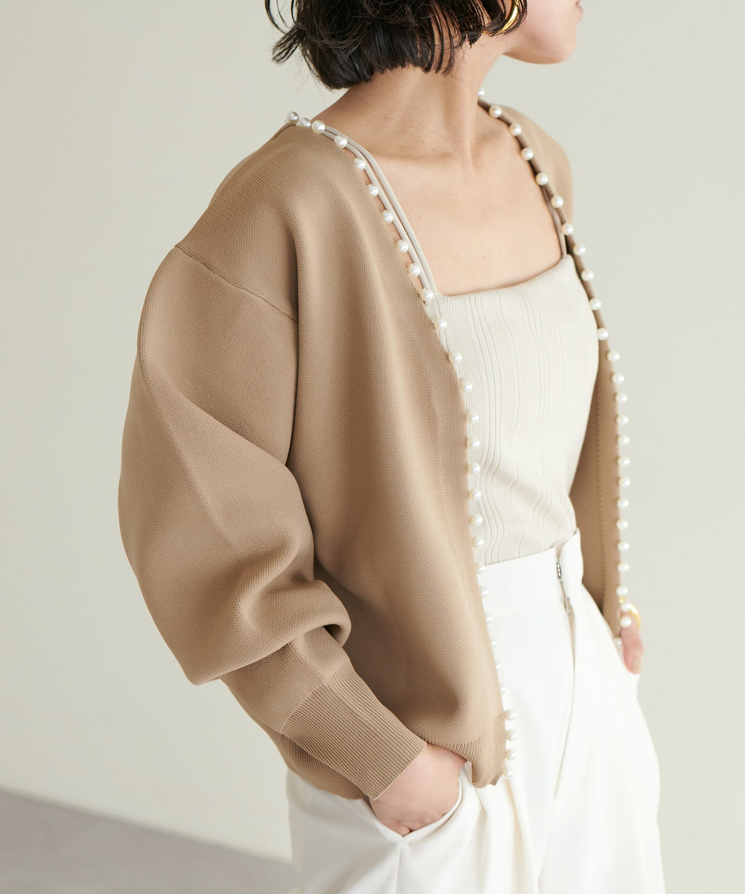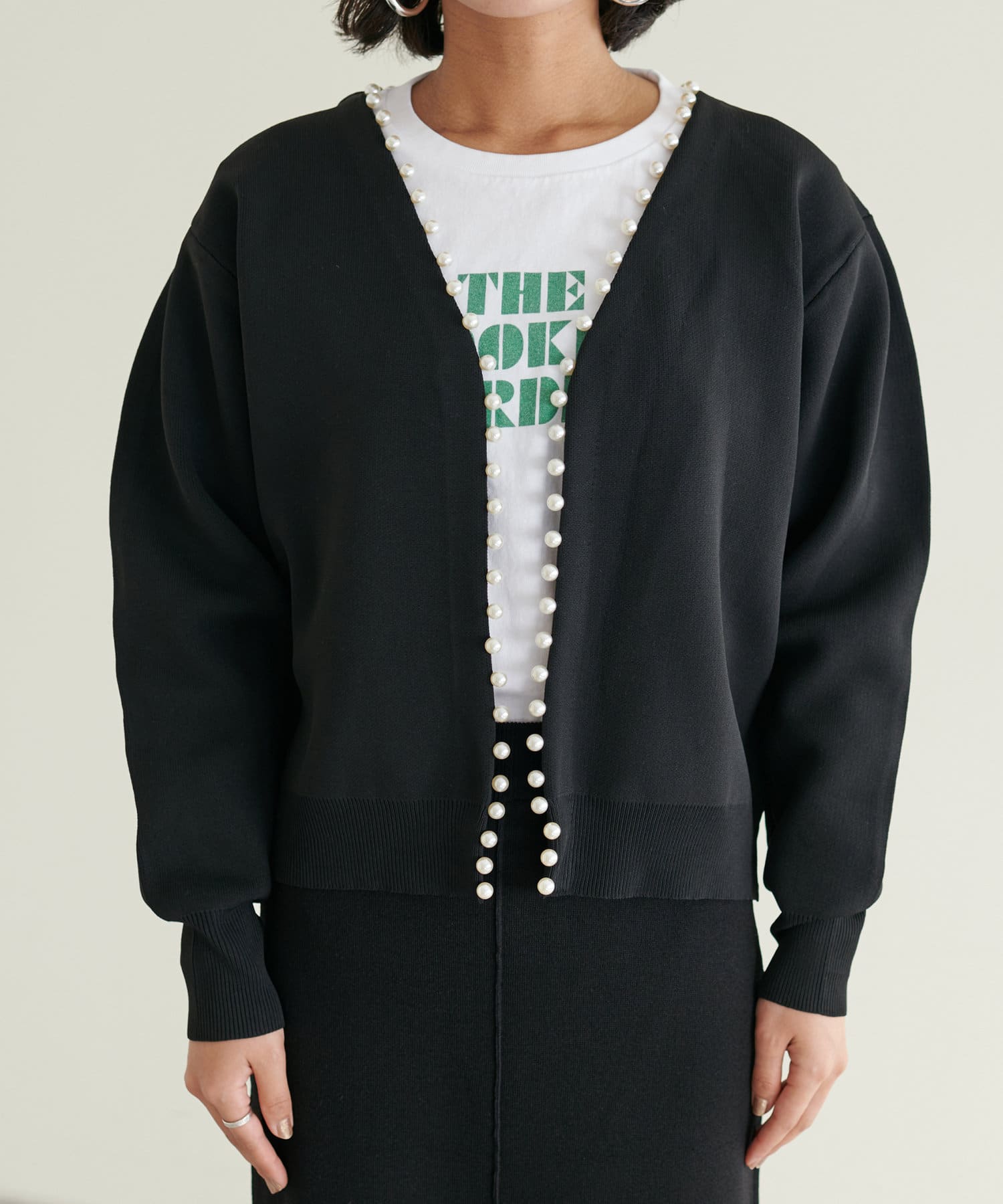 パッと見ただけで可愛らしい、襟ぐりから前立てに並んだパールが印象的なカーディガン。