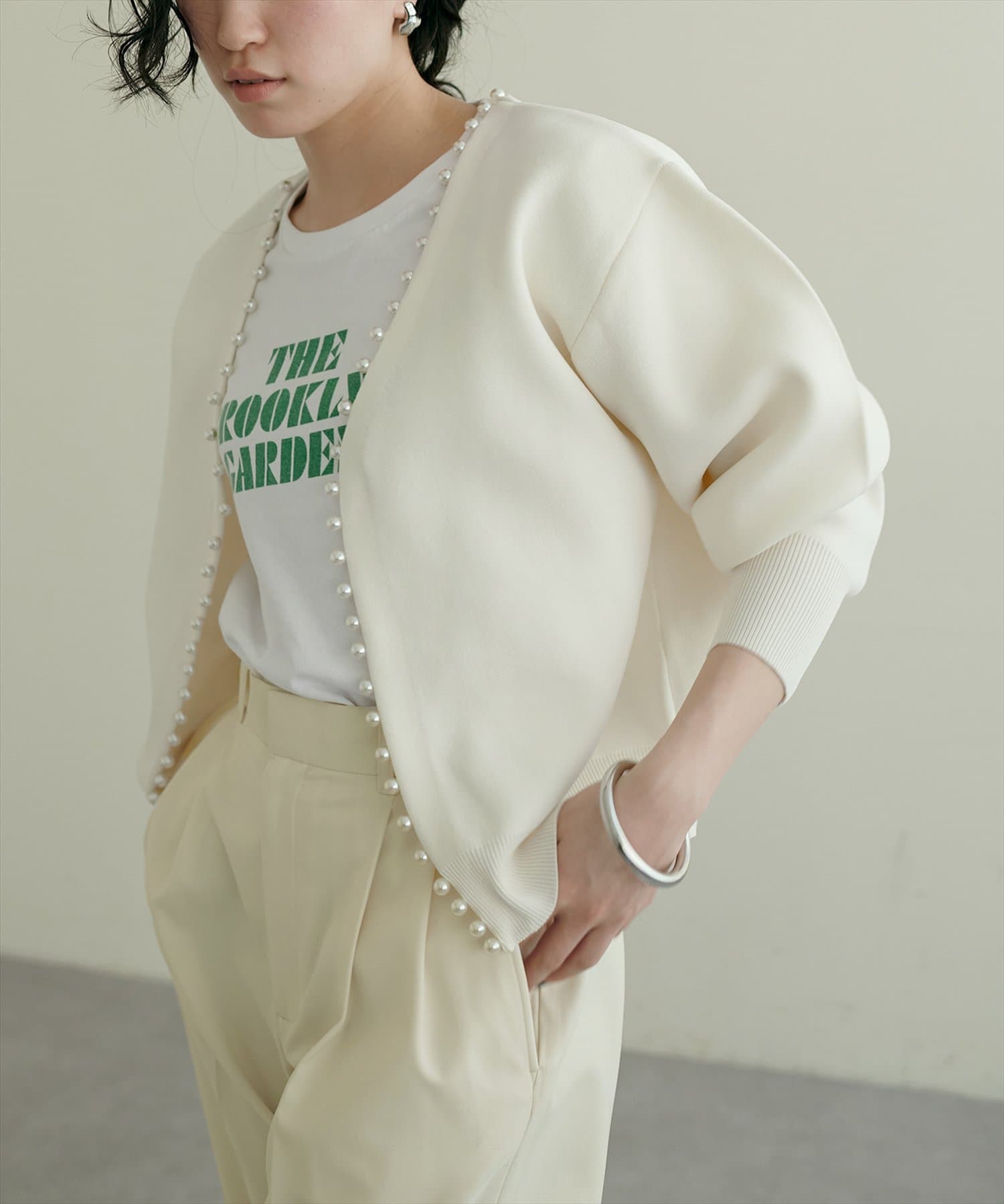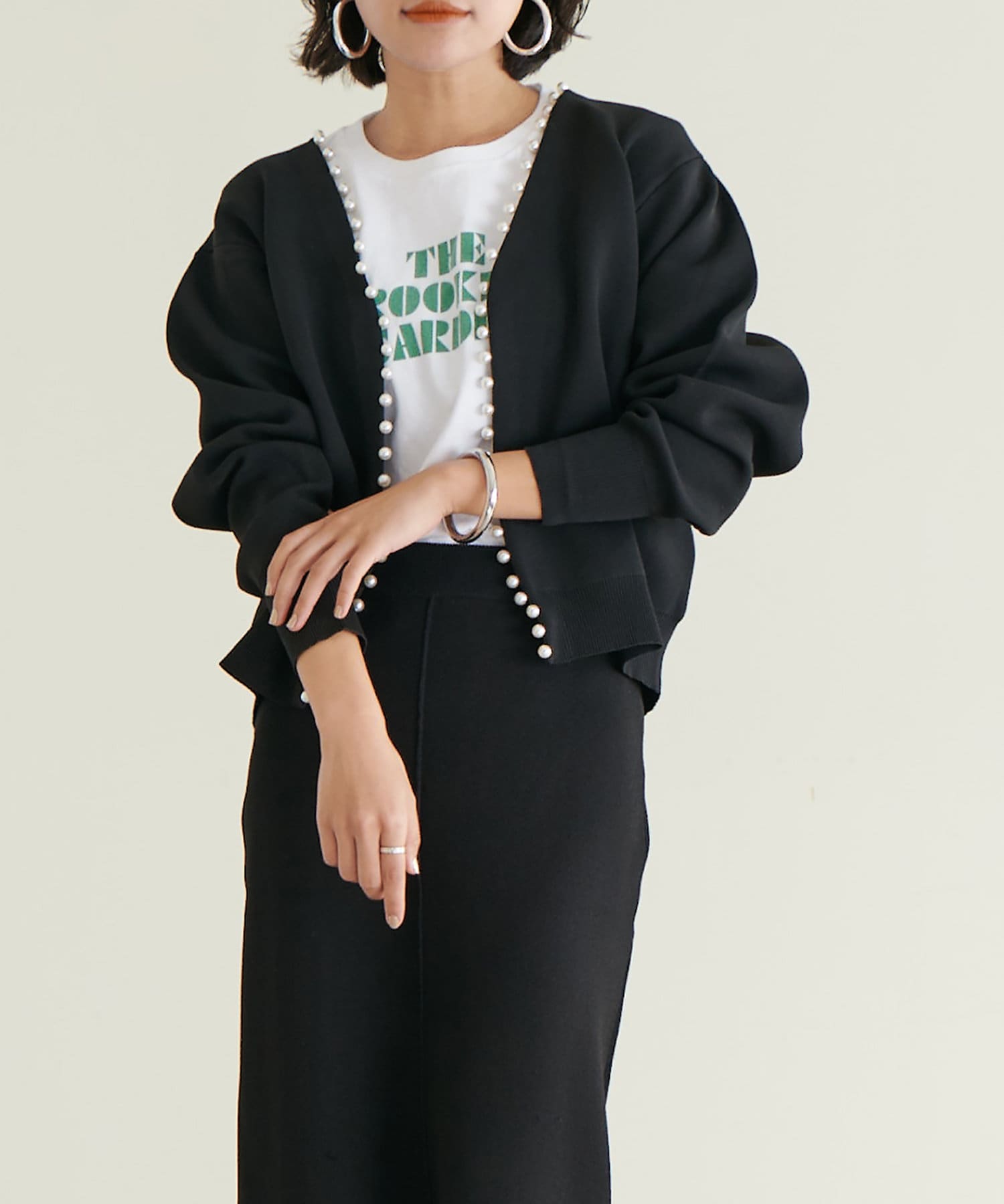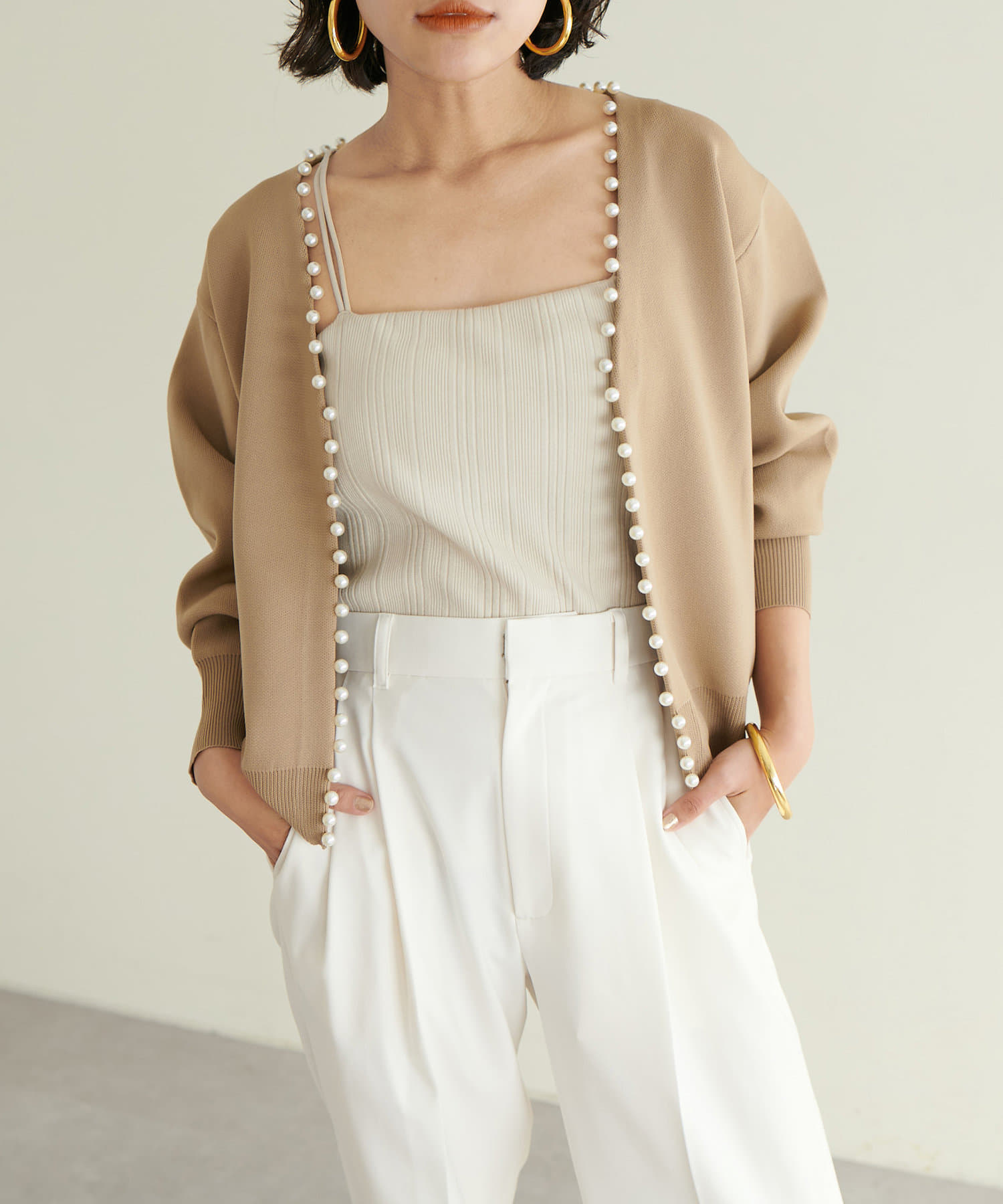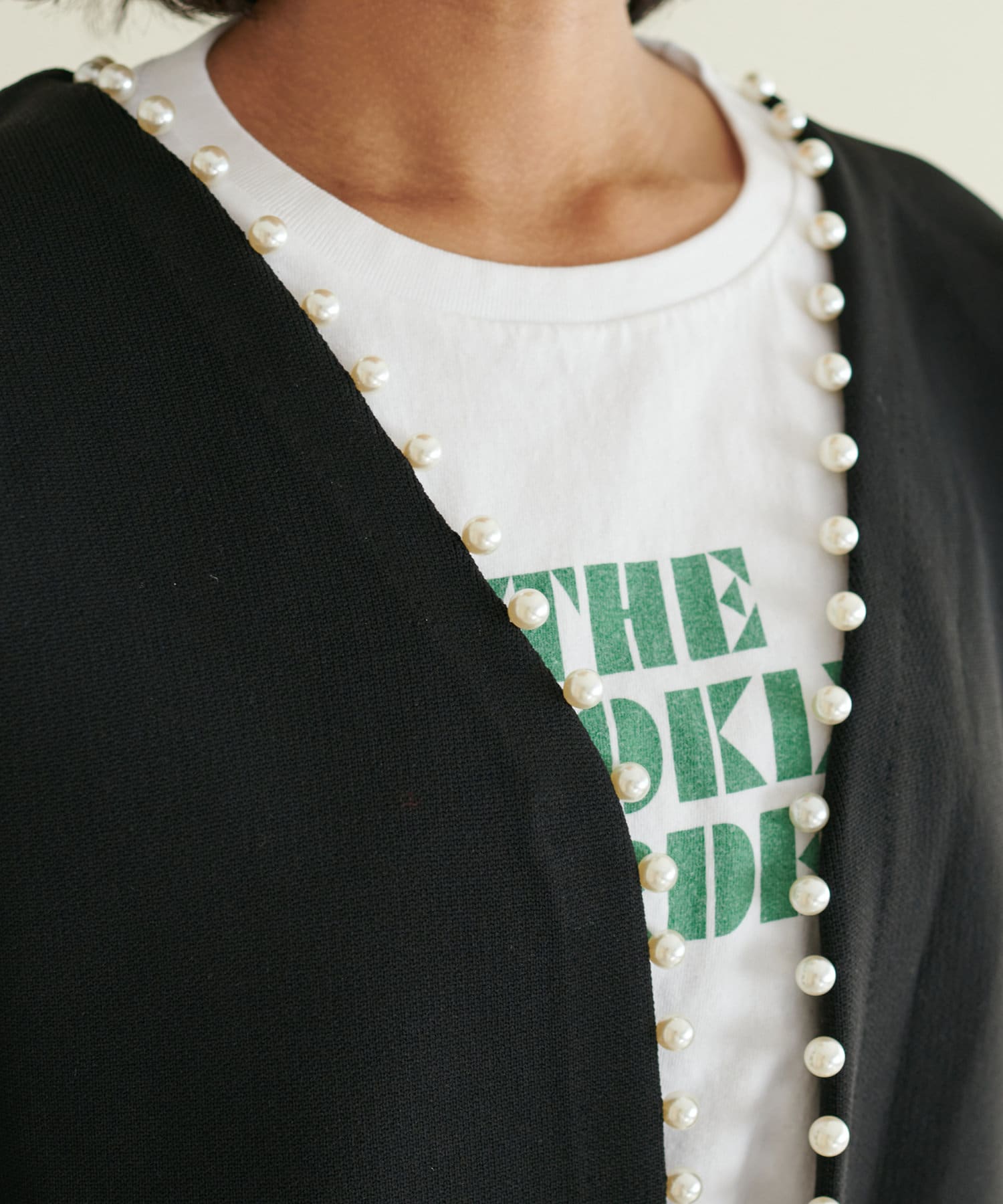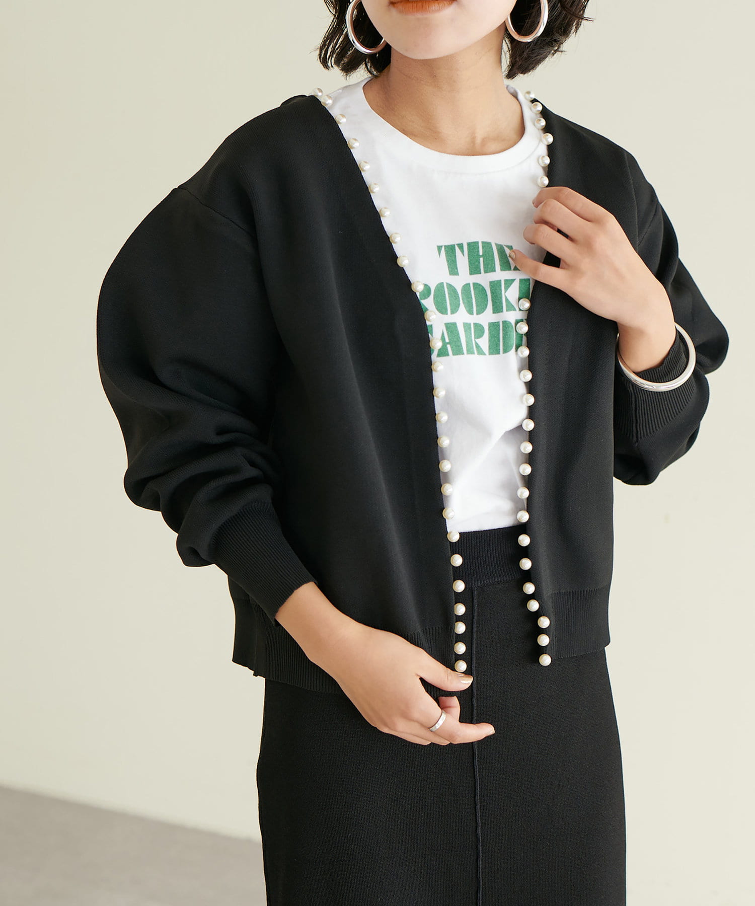 パッと見ただけで可愛らしい、襟ぐりから前立てに並んだパールが印象的なカーディガン。