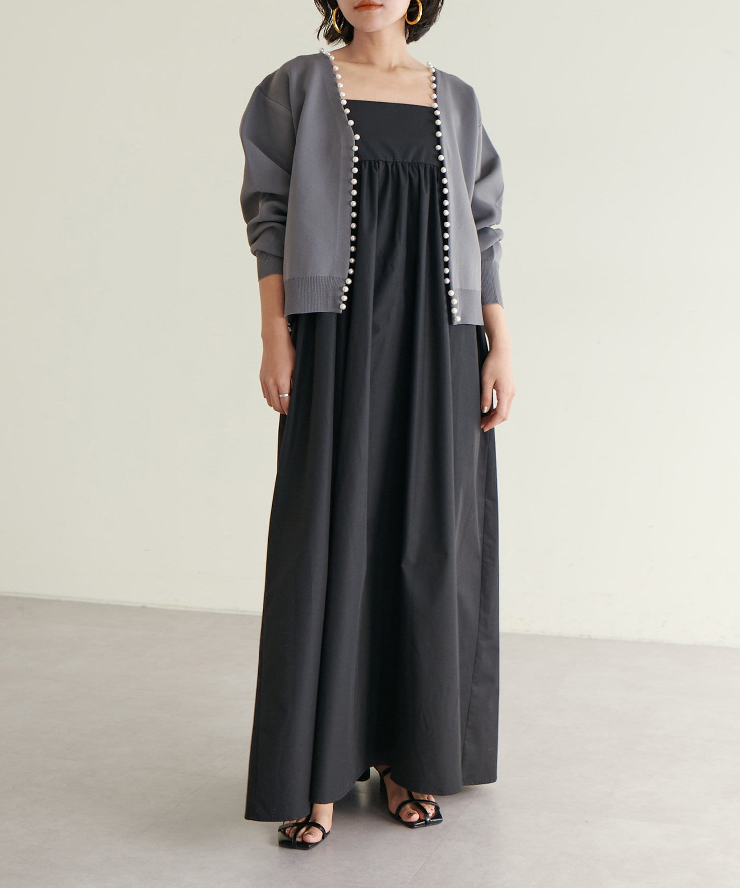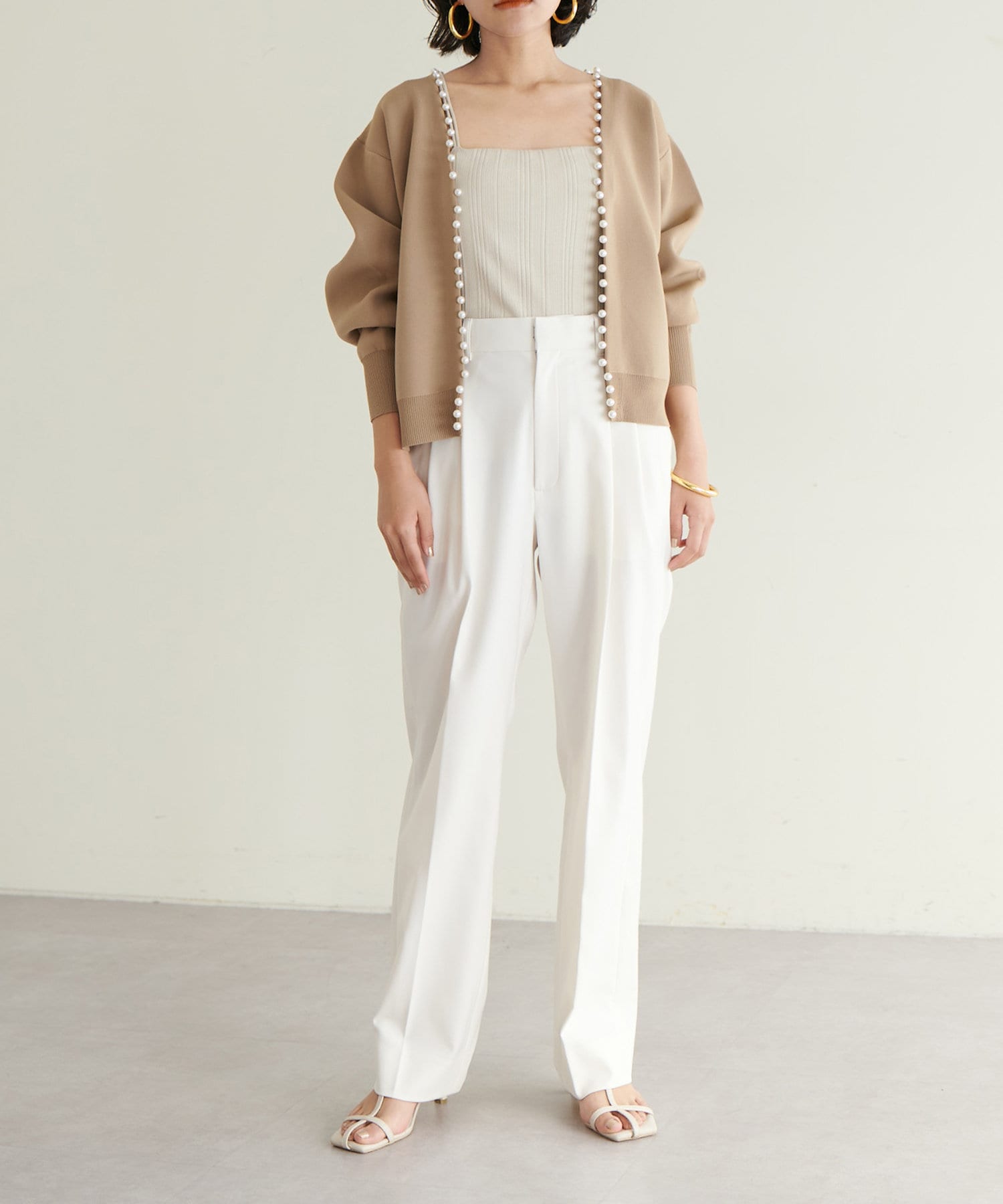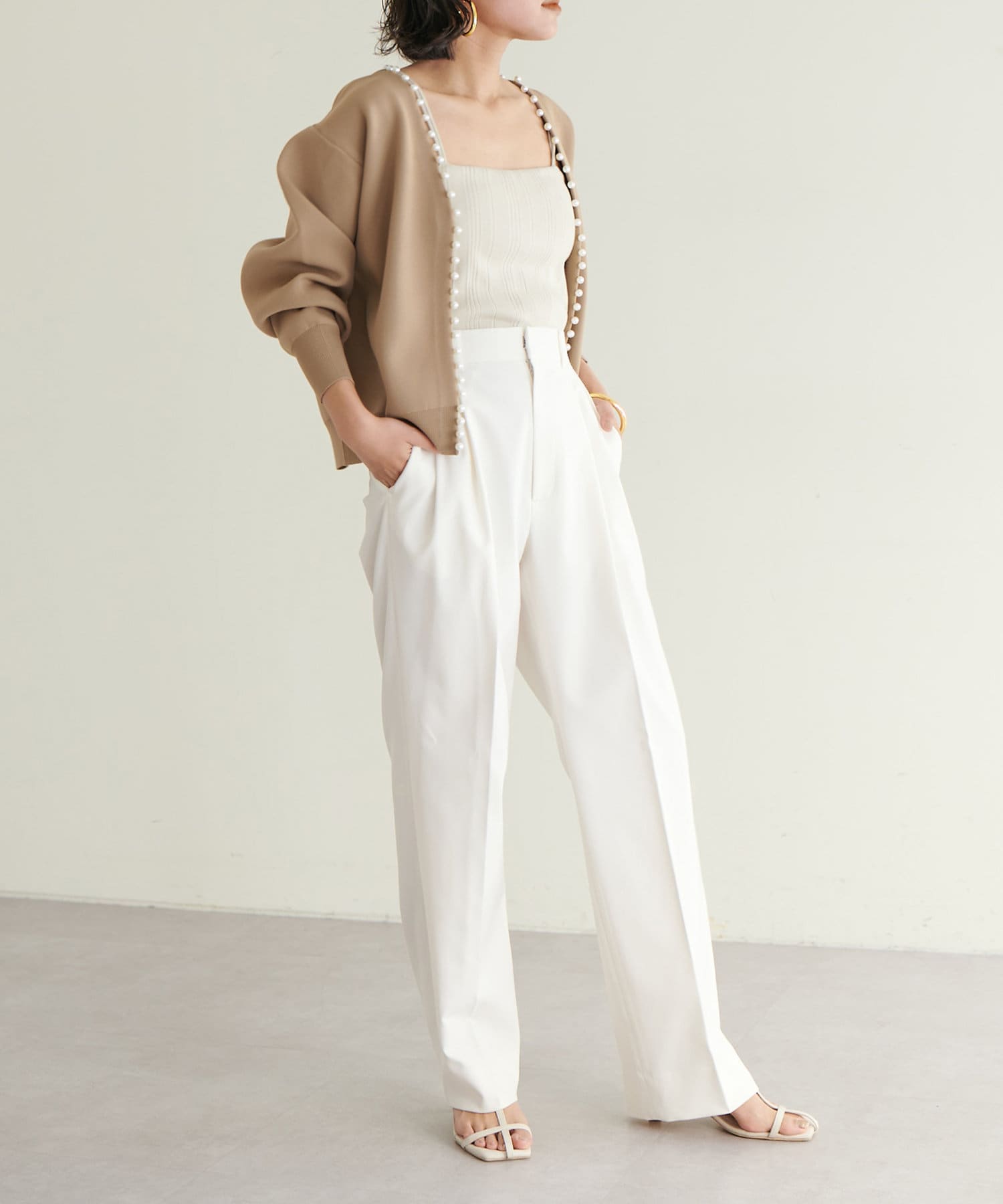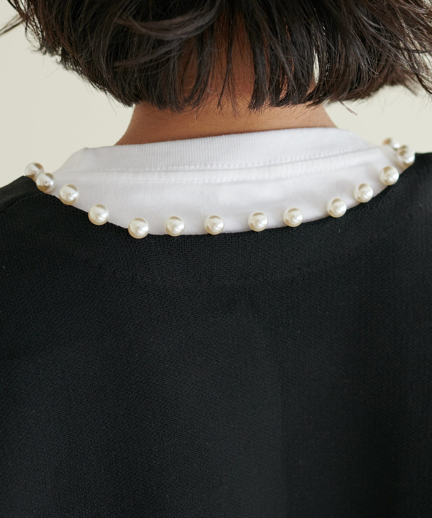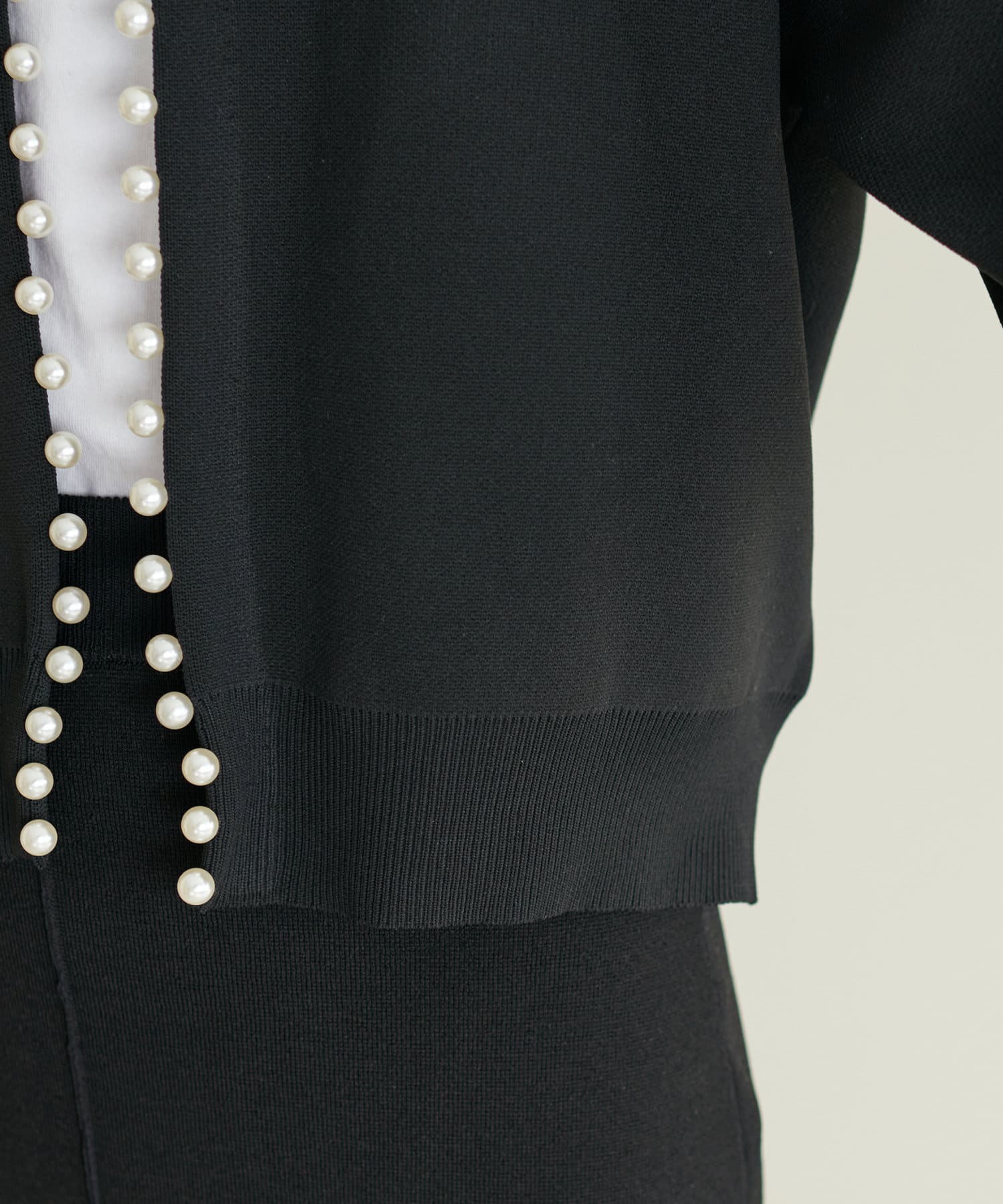 パッと見ただけで可愛らしい、襟ぐりから前立てに並んだパールが印象的なカーディガン。