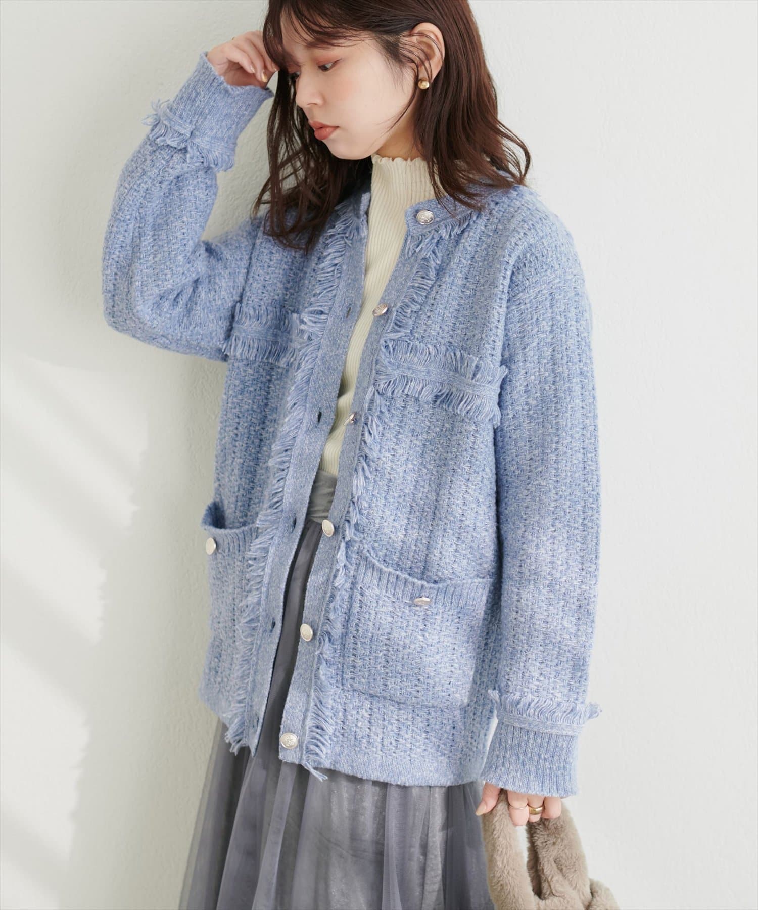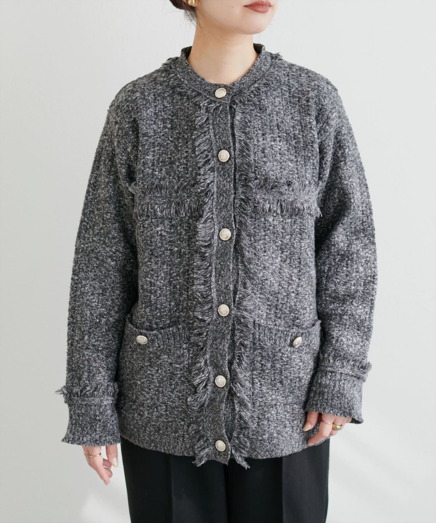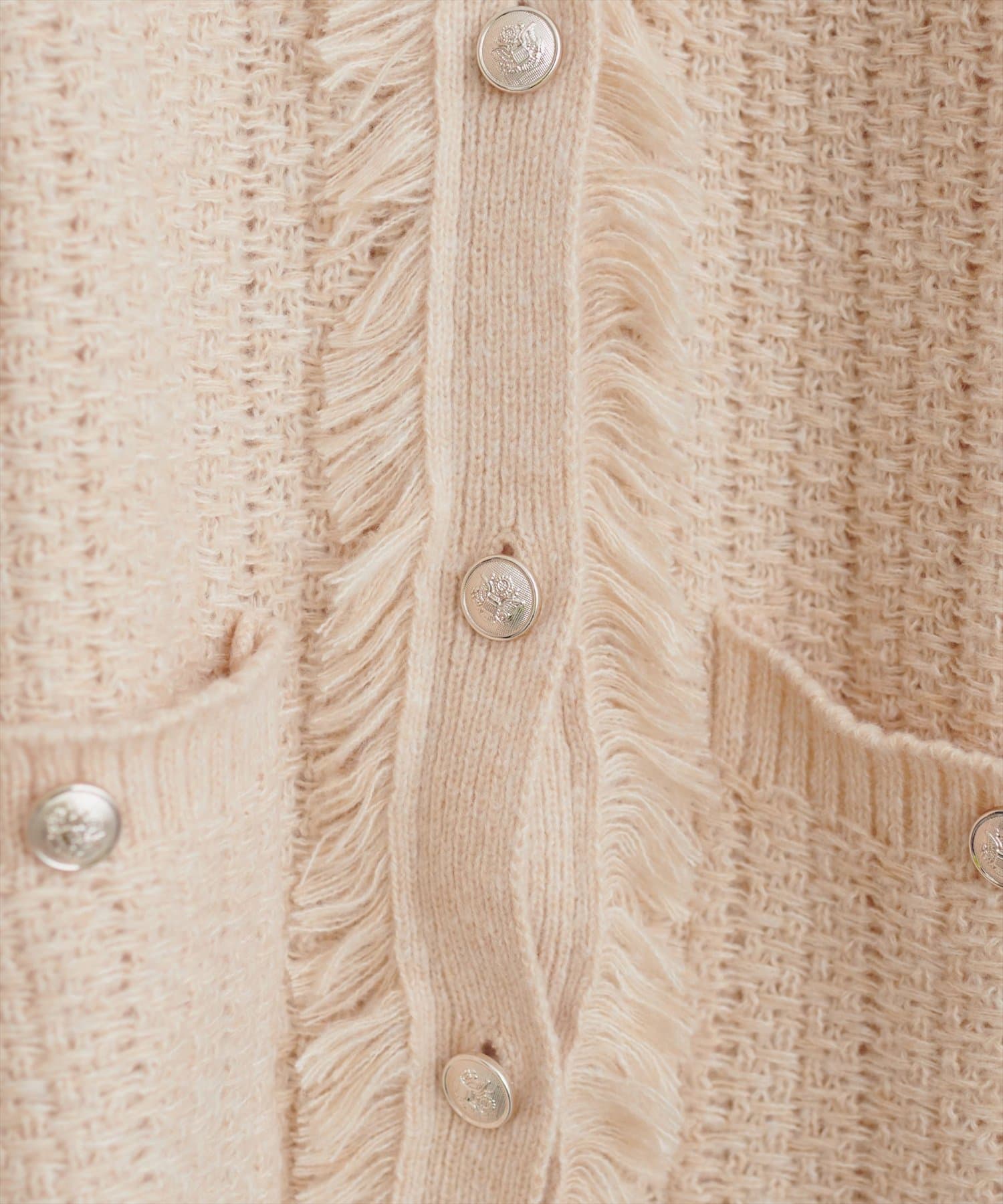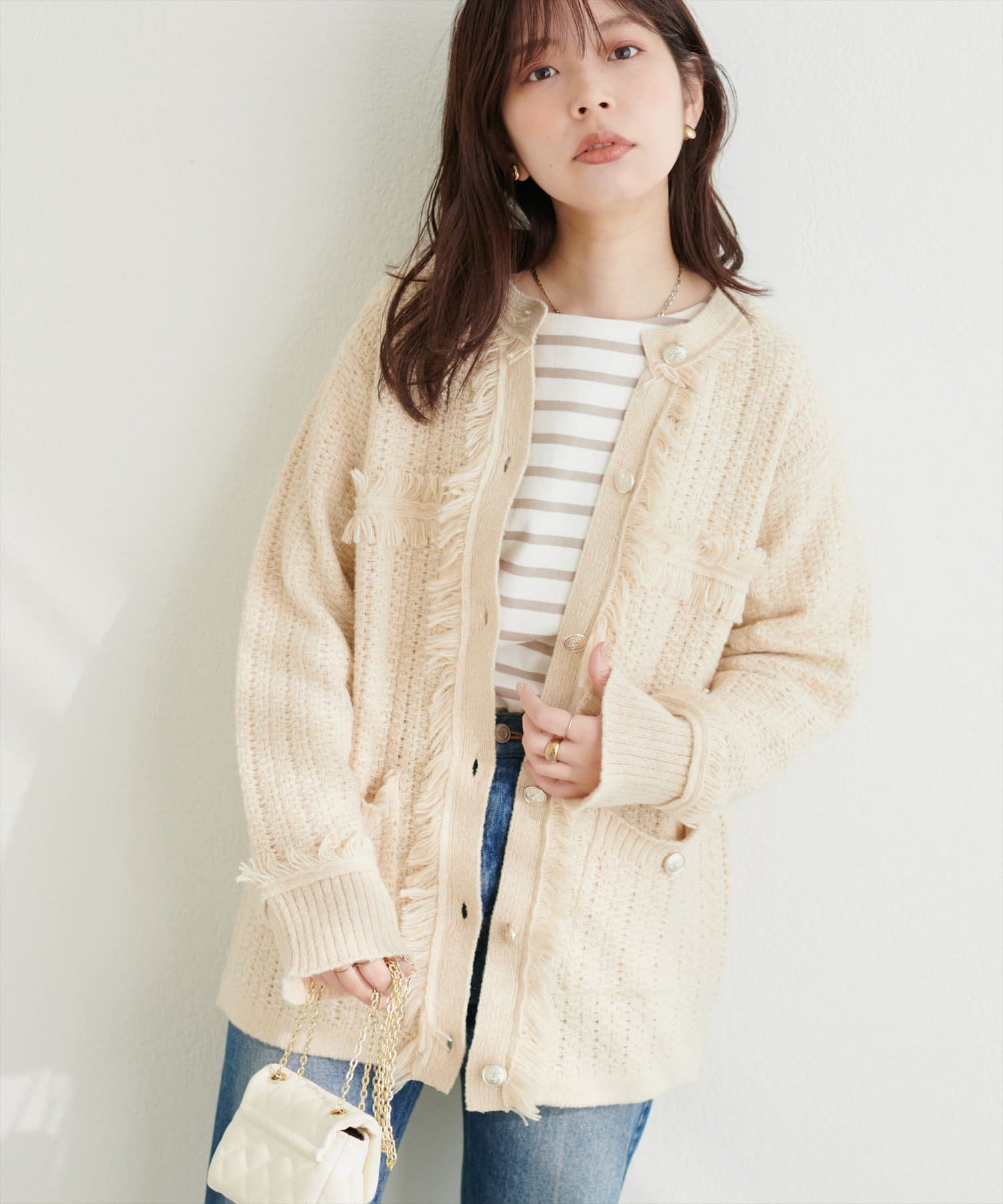 贅沢なフリンジとぎゅっとつまった編地が可愛いカーディガン。