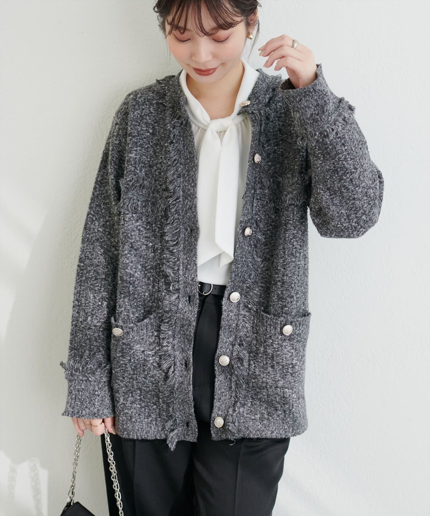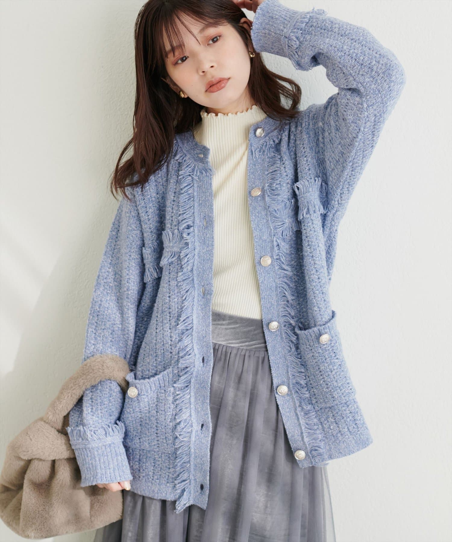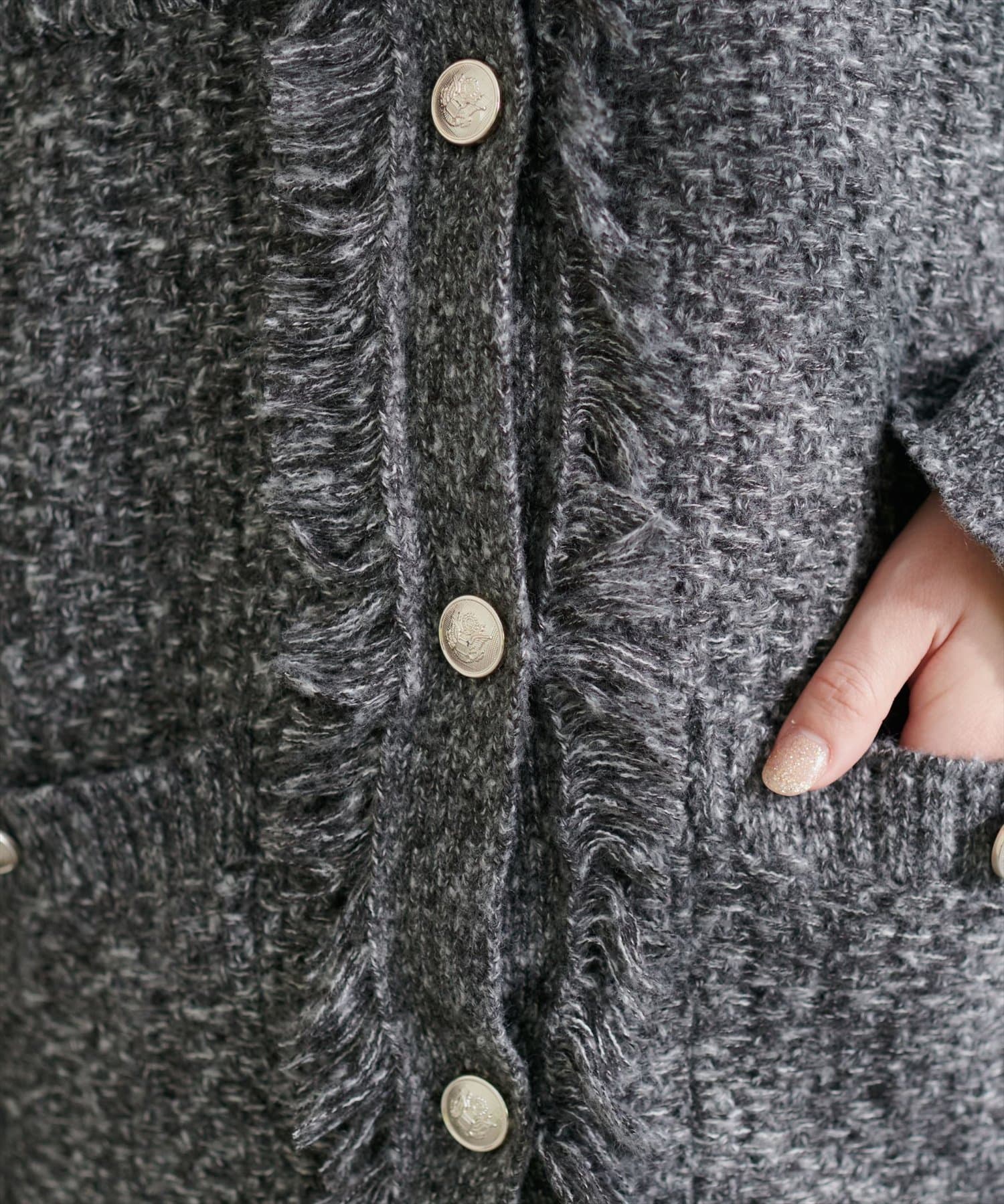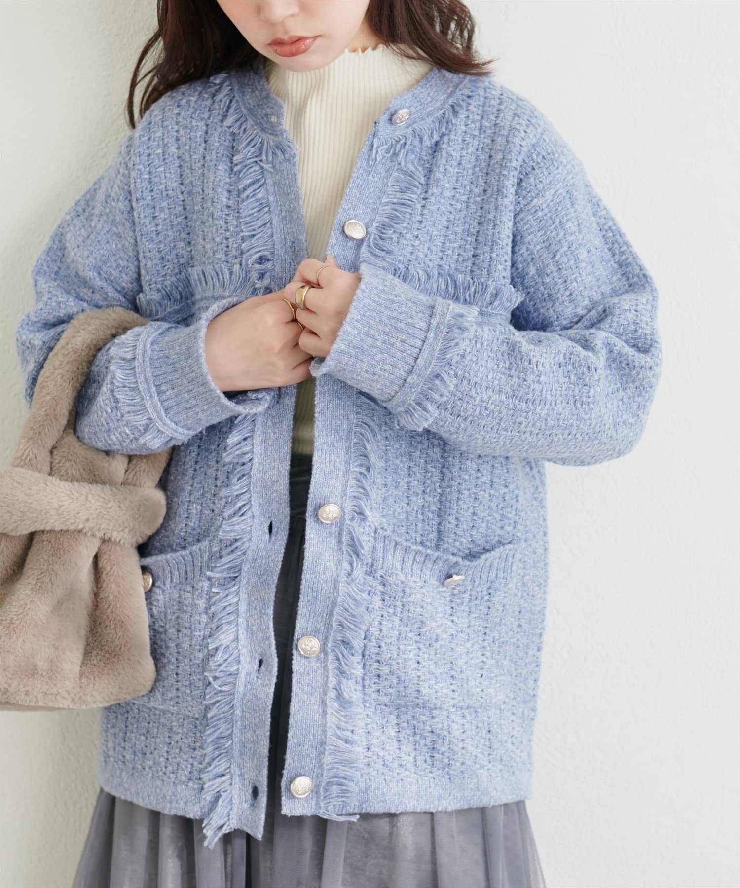贅沢なフリンジとぎゅっとつまった編地が可愛いカーディガン。