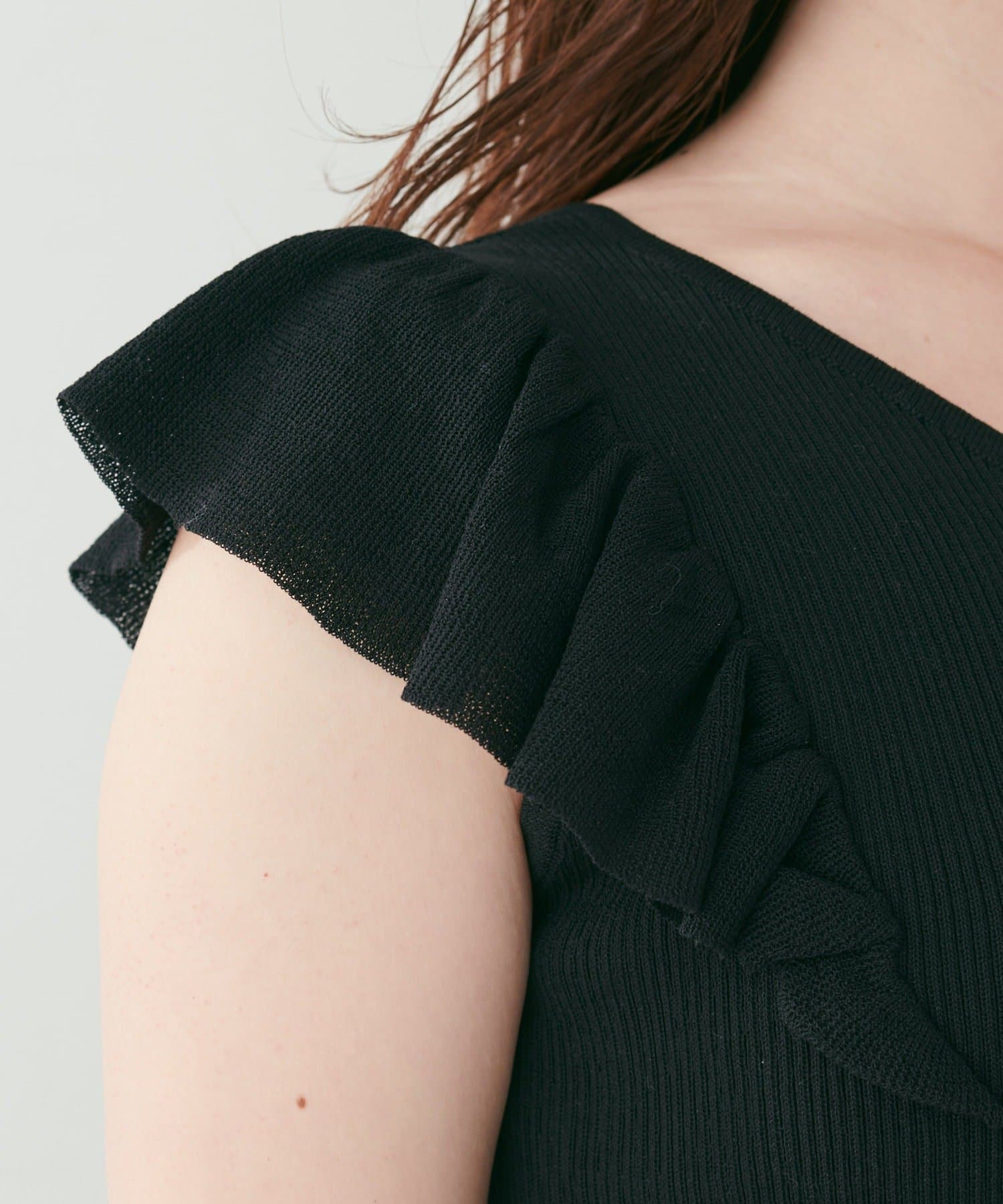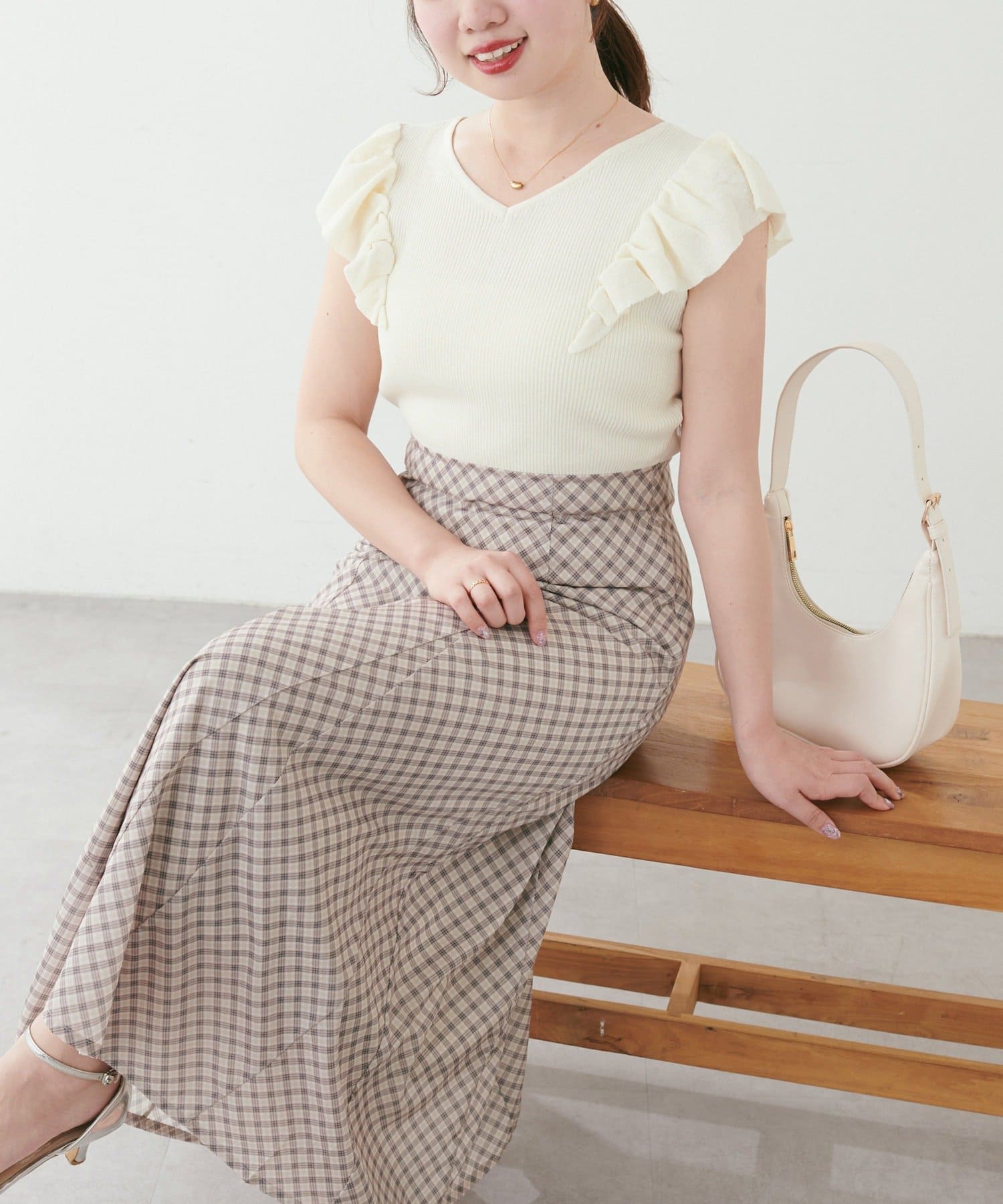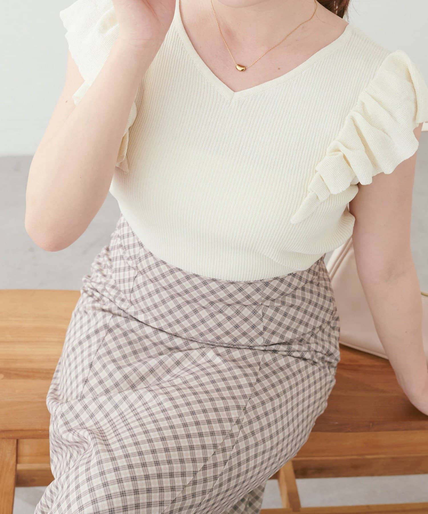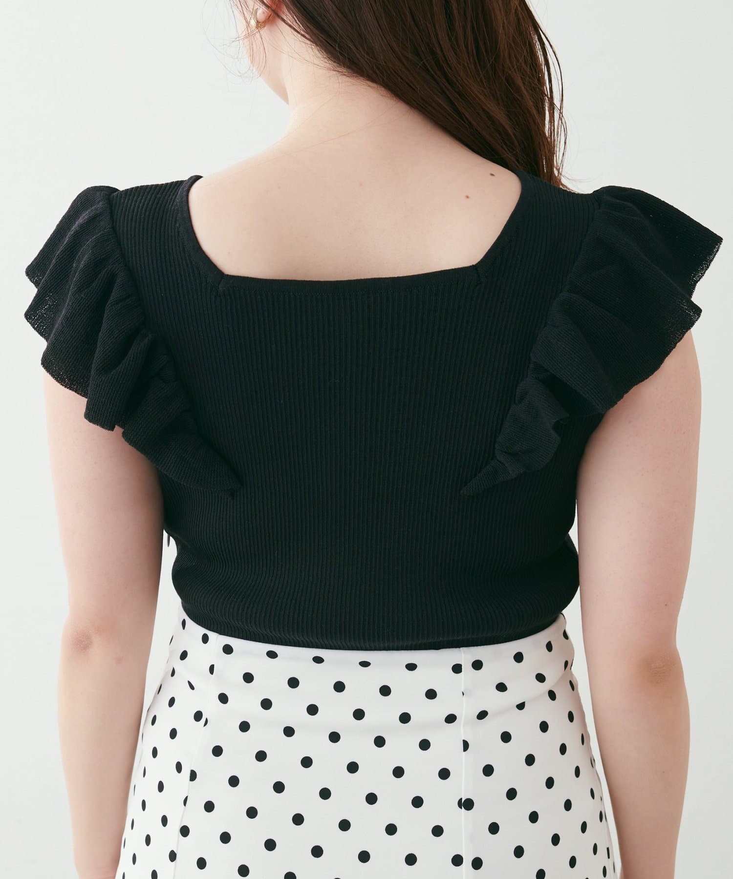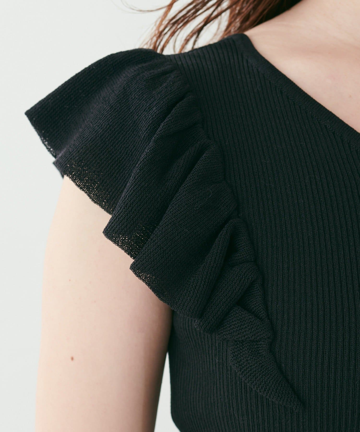 ニットのフリル袖は、フェミニンさを出してくれるだけでなく肩幅と肩回りのカバーも叶うデザイン。
