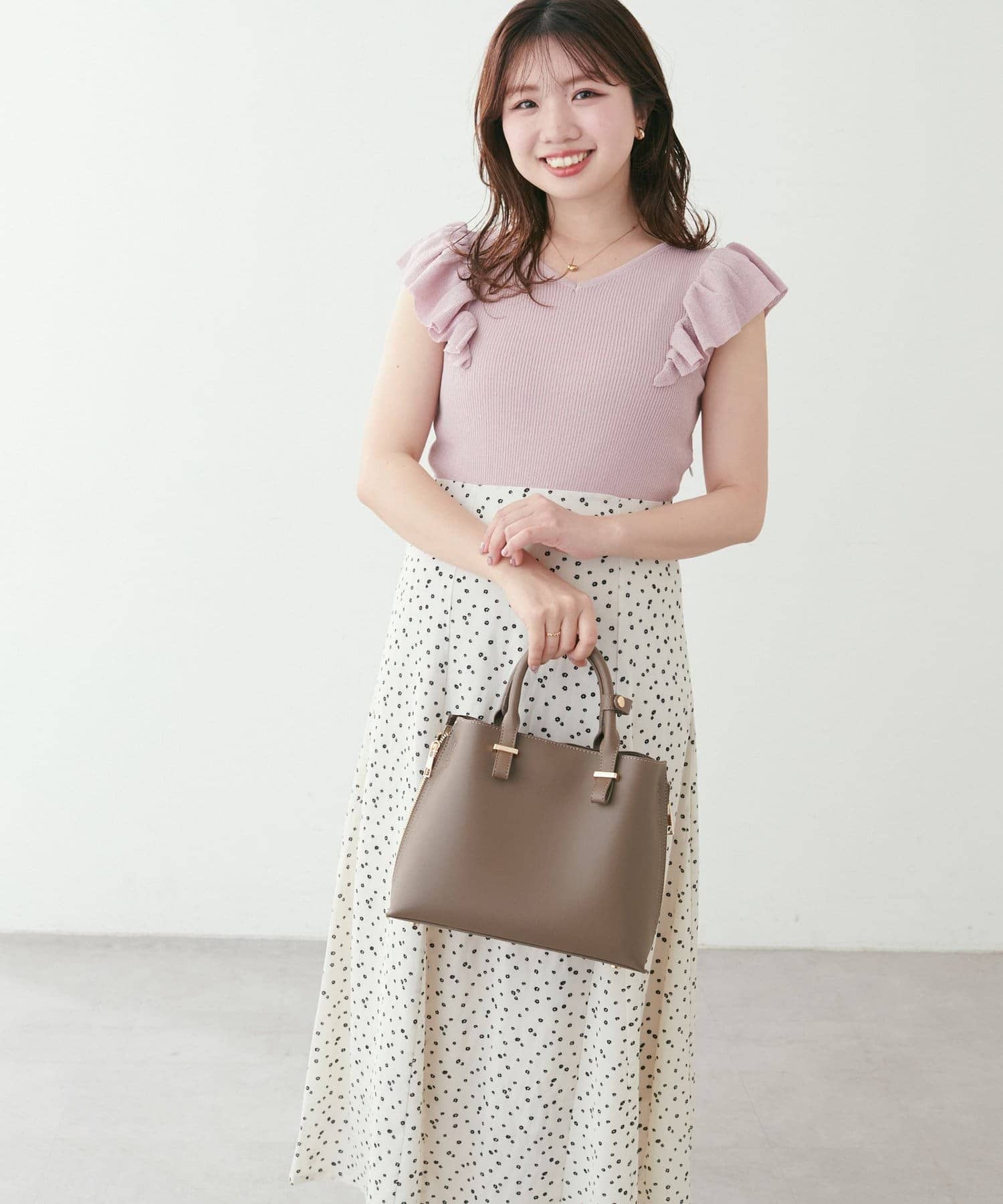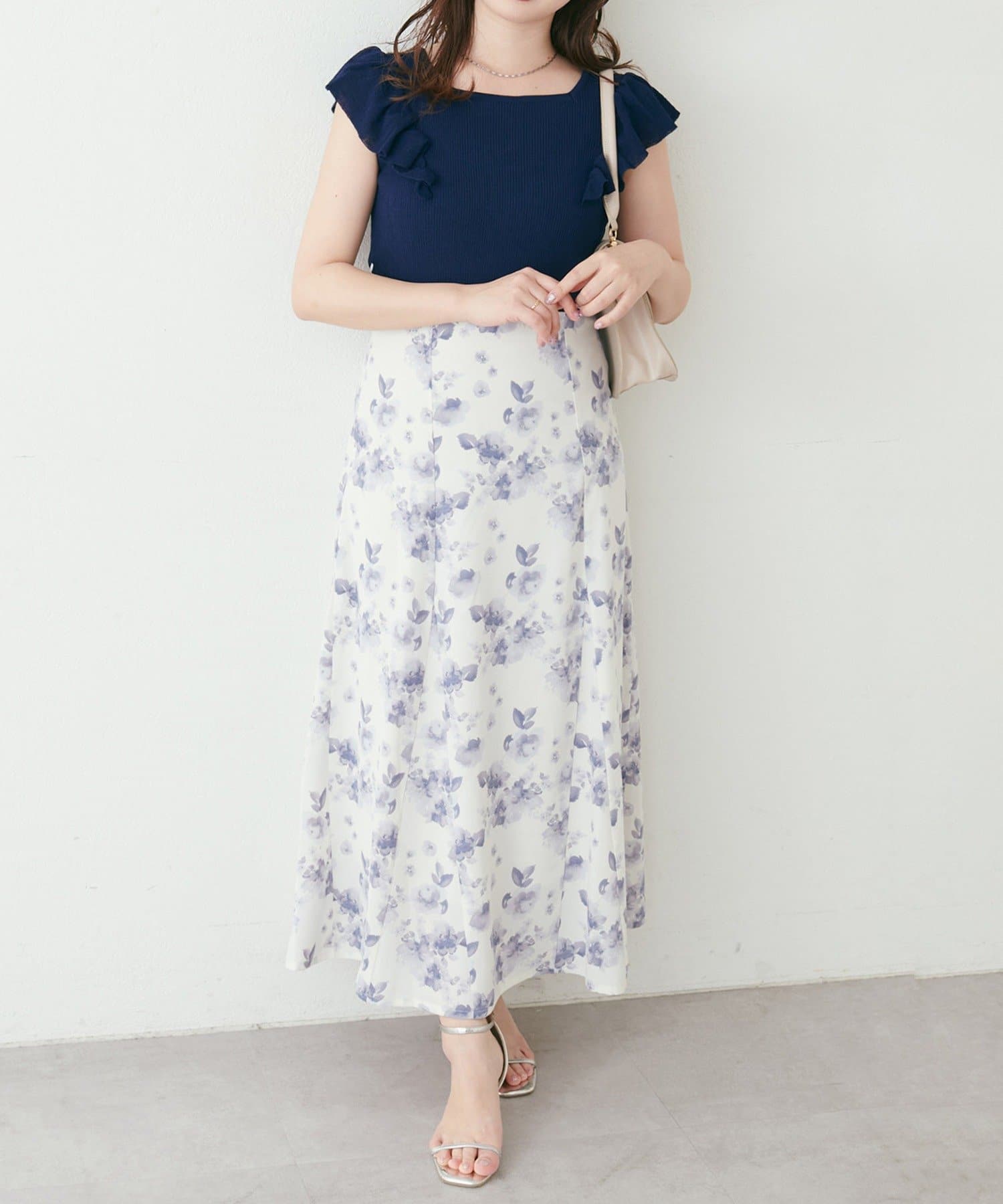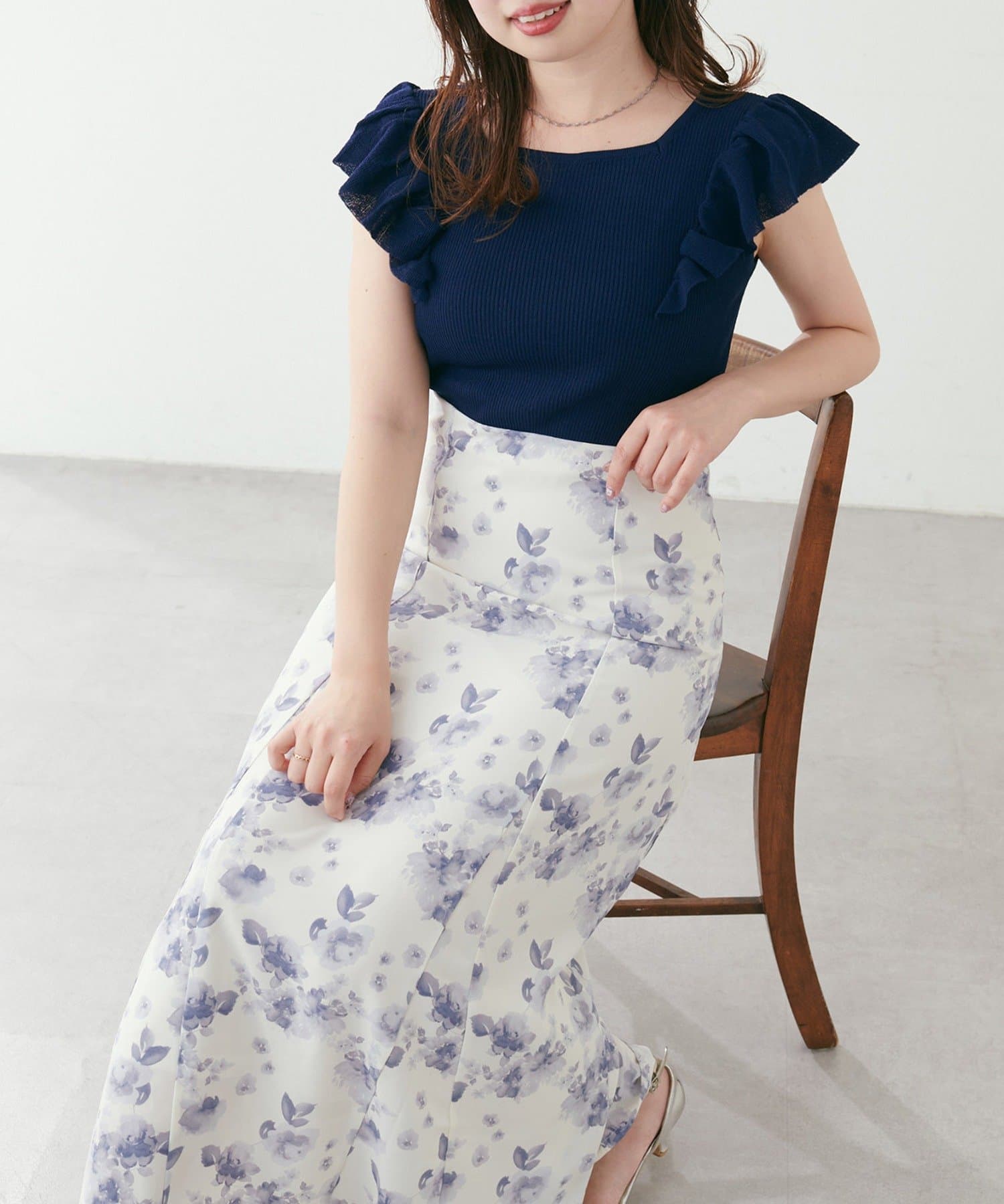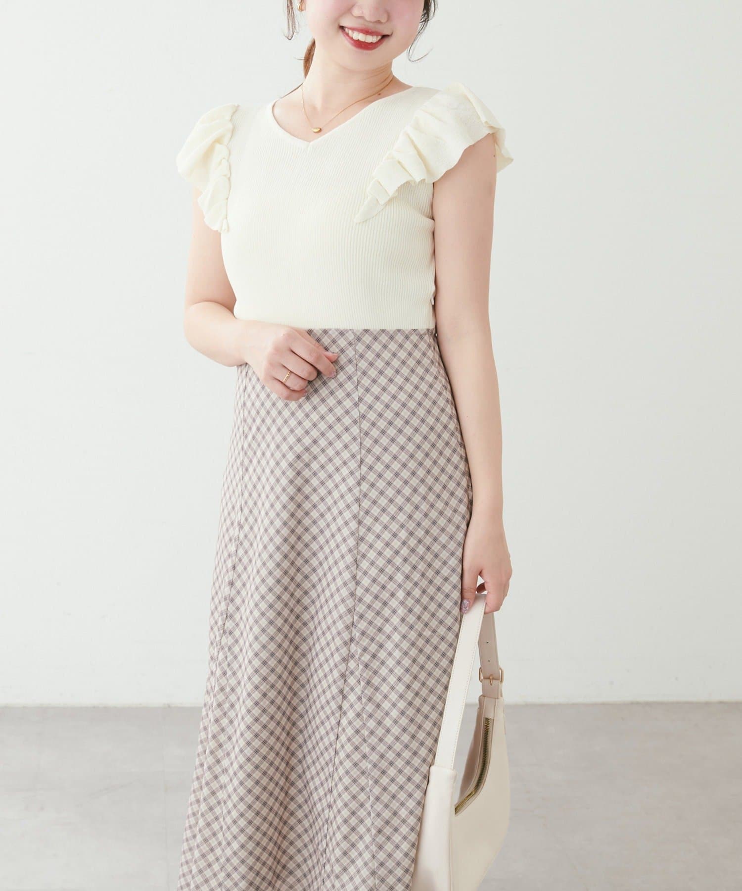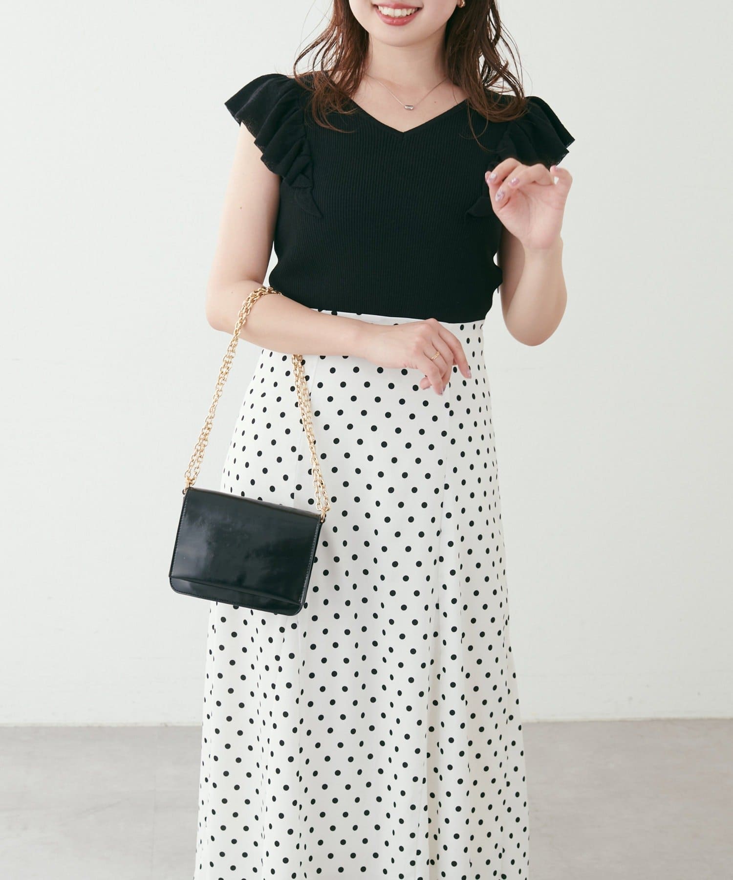 ニットのフリル袖は、フェミニンさを出してくれるだけでなく肩幅と肩回りのカバーも叶うデザイン。