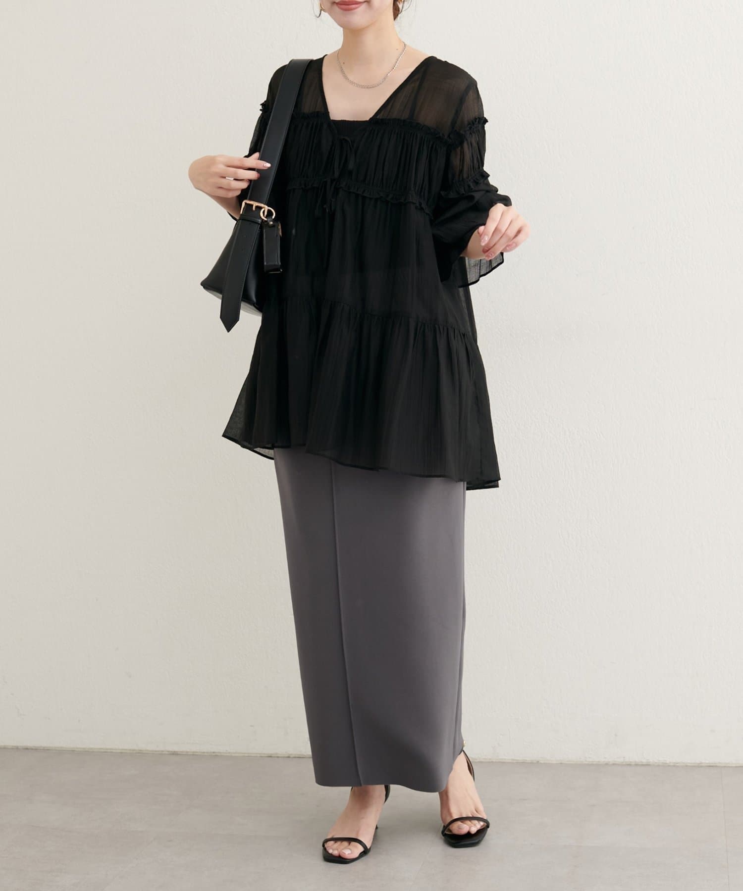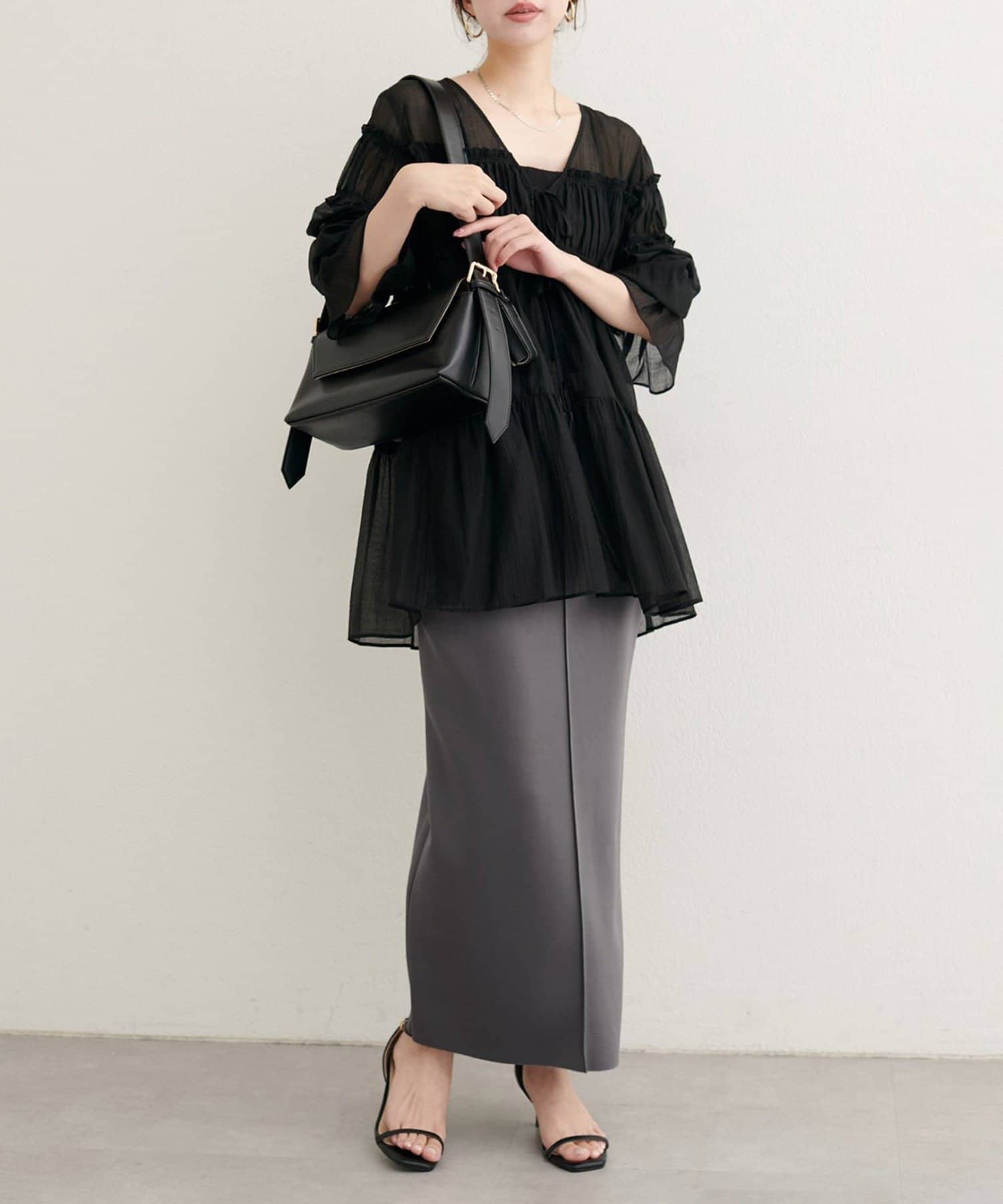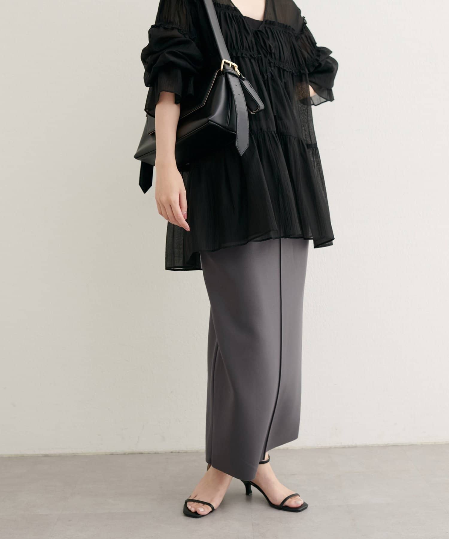 キレイめブラウスやフィット感のあるすっきりしたニットを合わせたスタイリングもおすすめ。