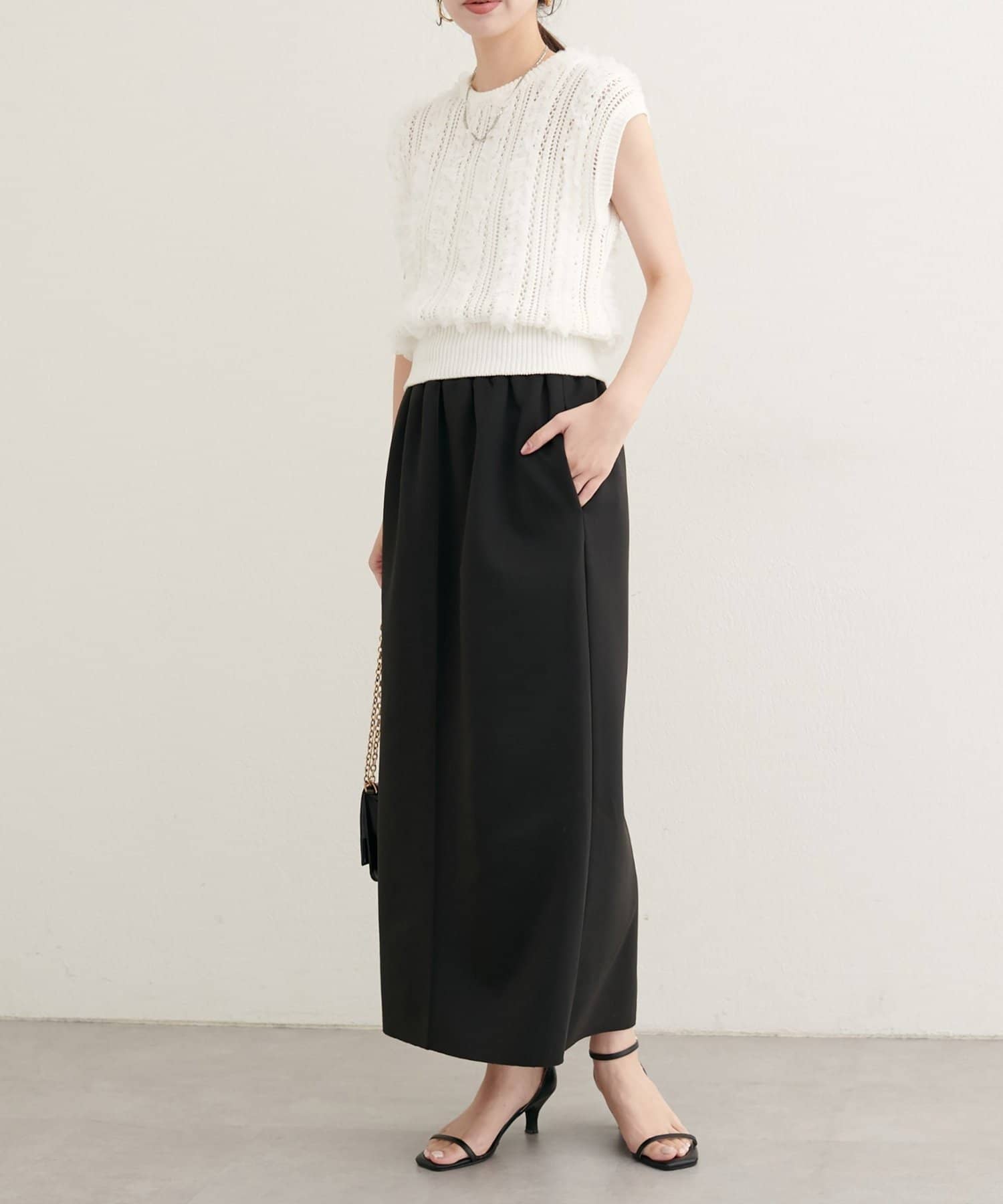 360度すっきりシルエットで通年使えるカットポンチ素材のスカート。