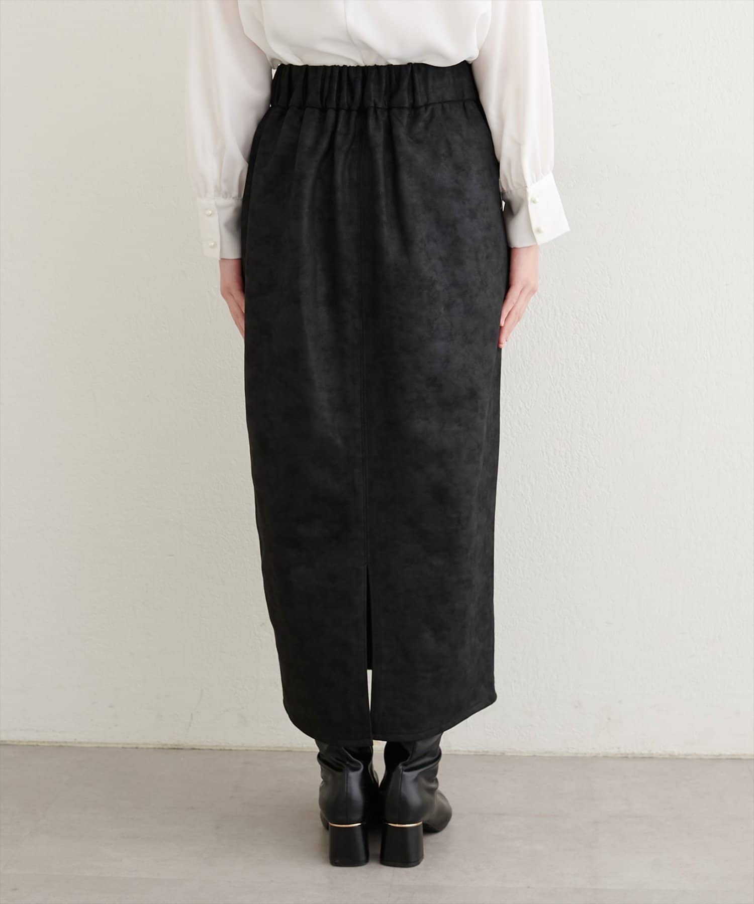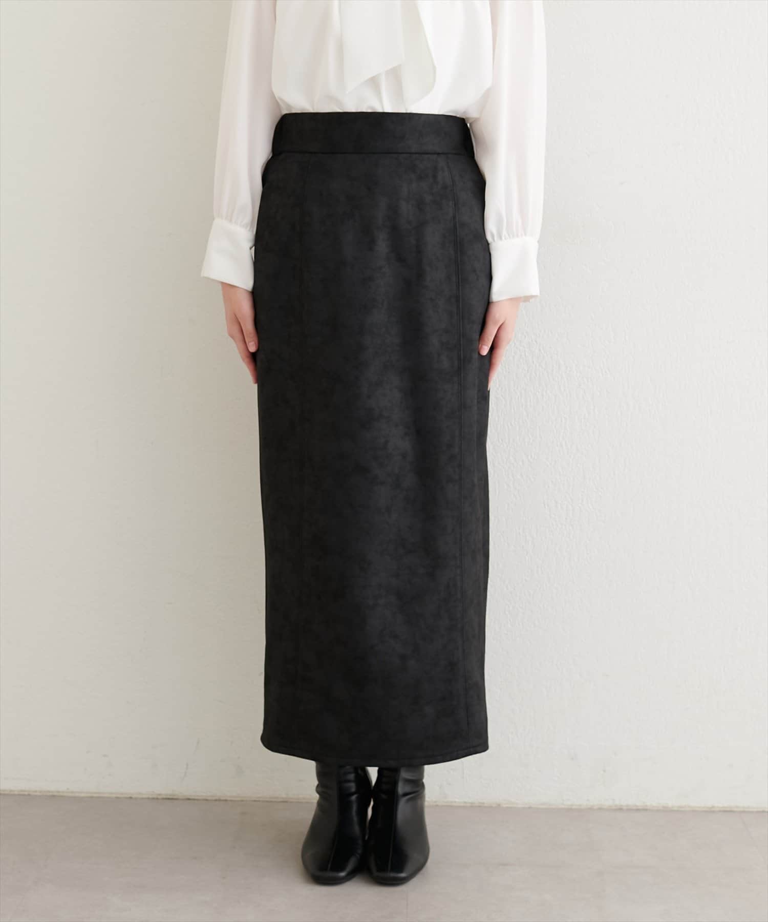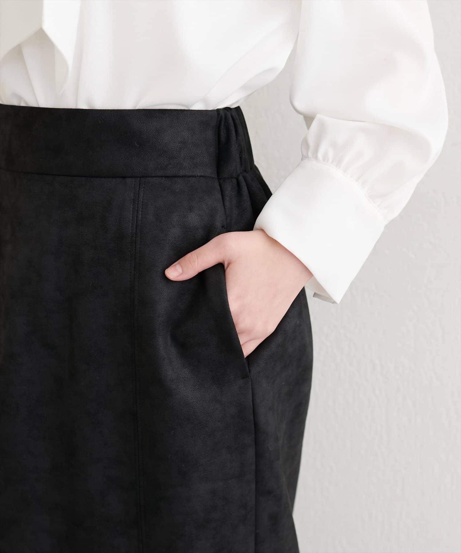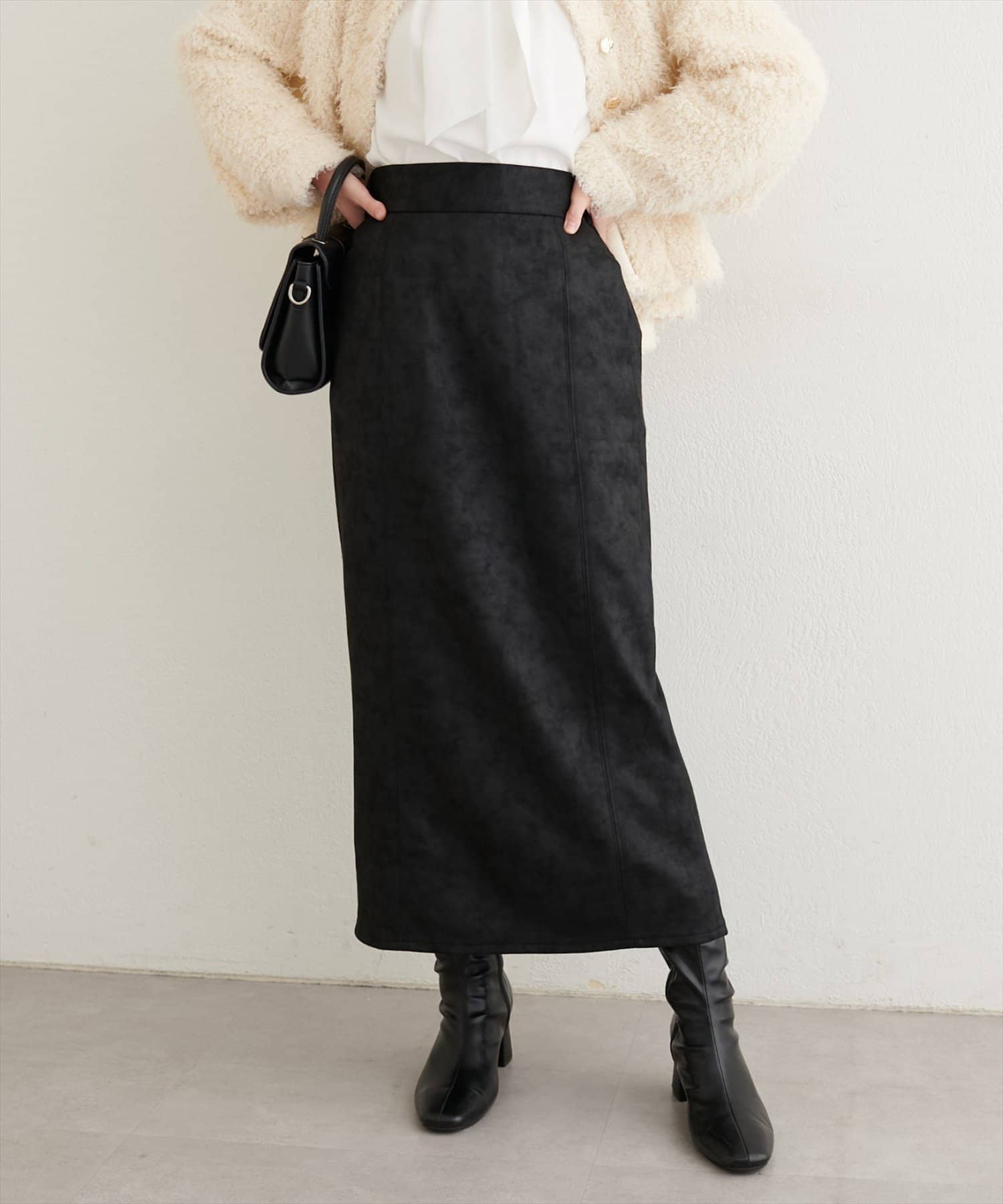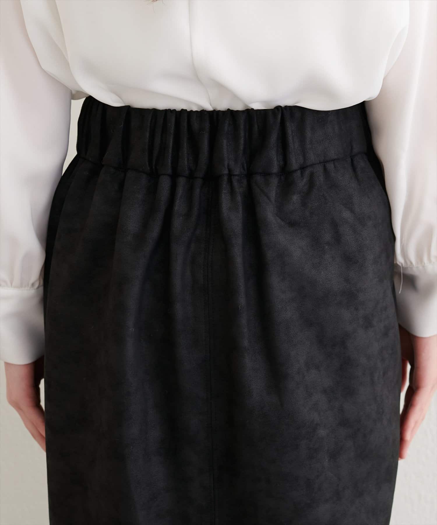 しっとりとした質感と、上品な素材感が魅力の合皮風ポンチスエードタイトスカート。