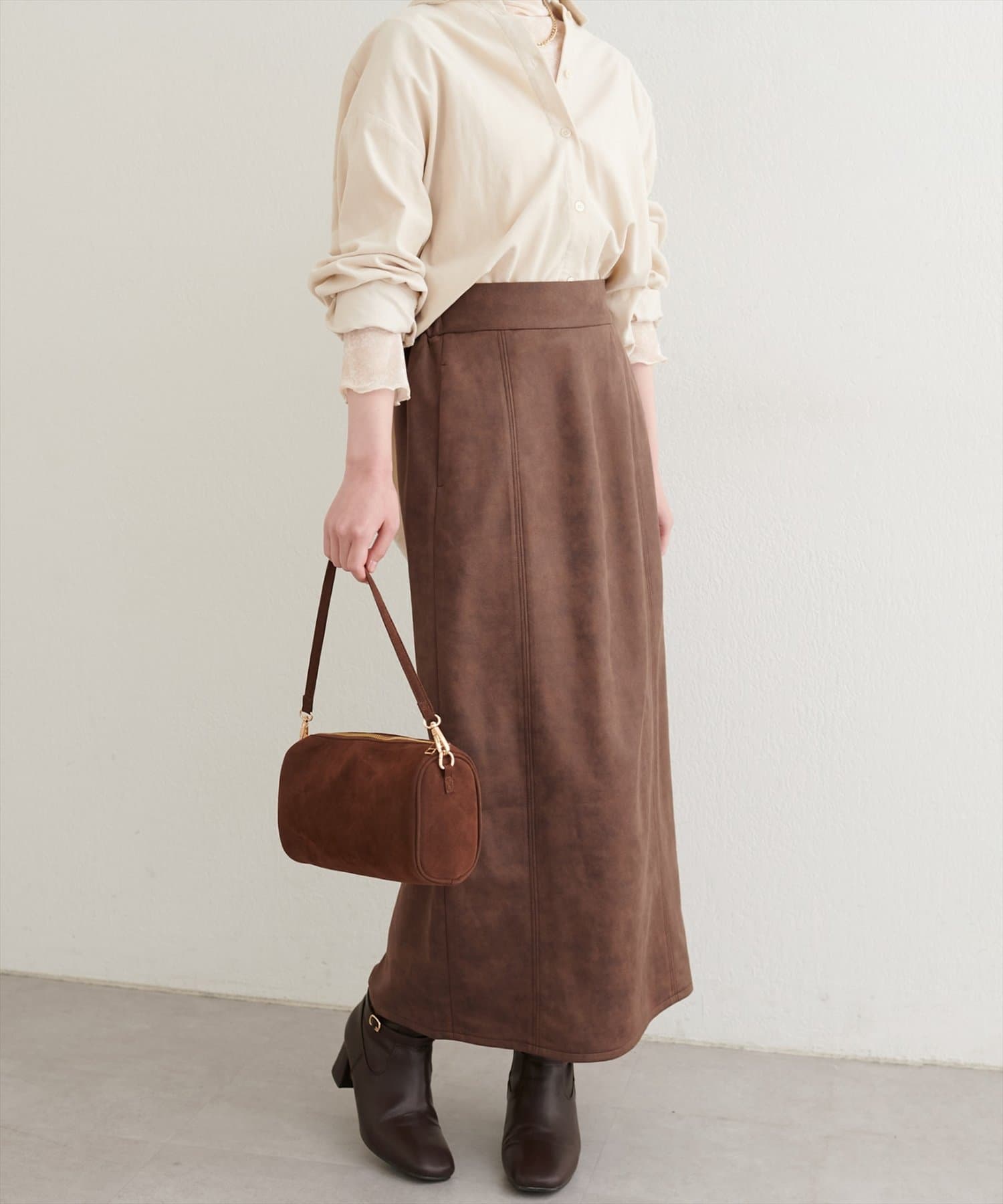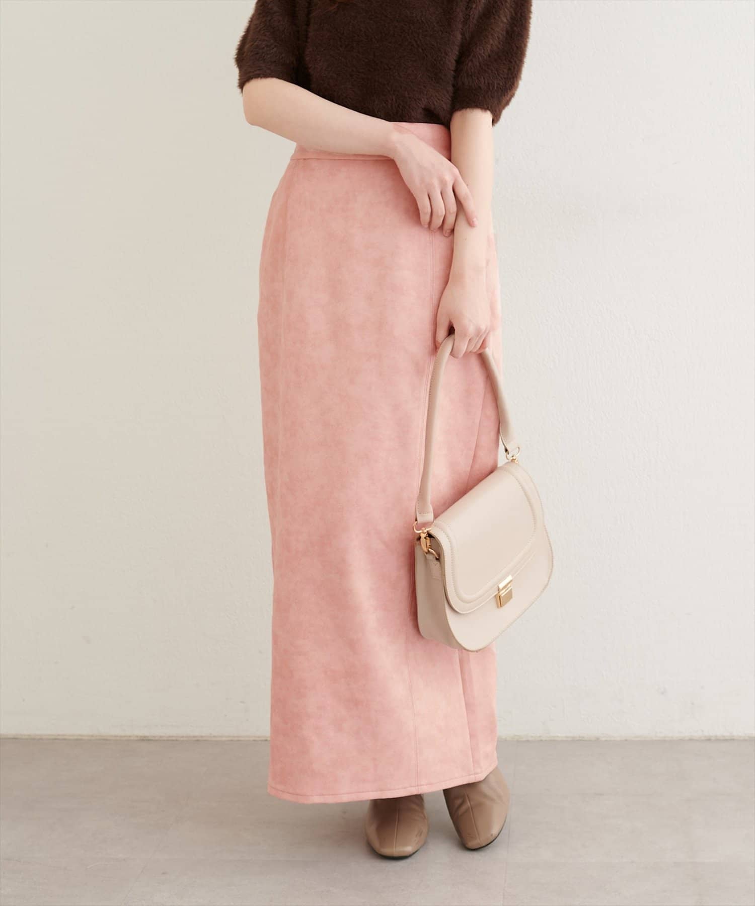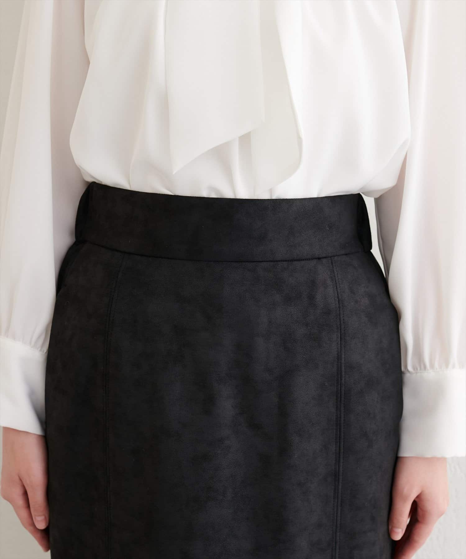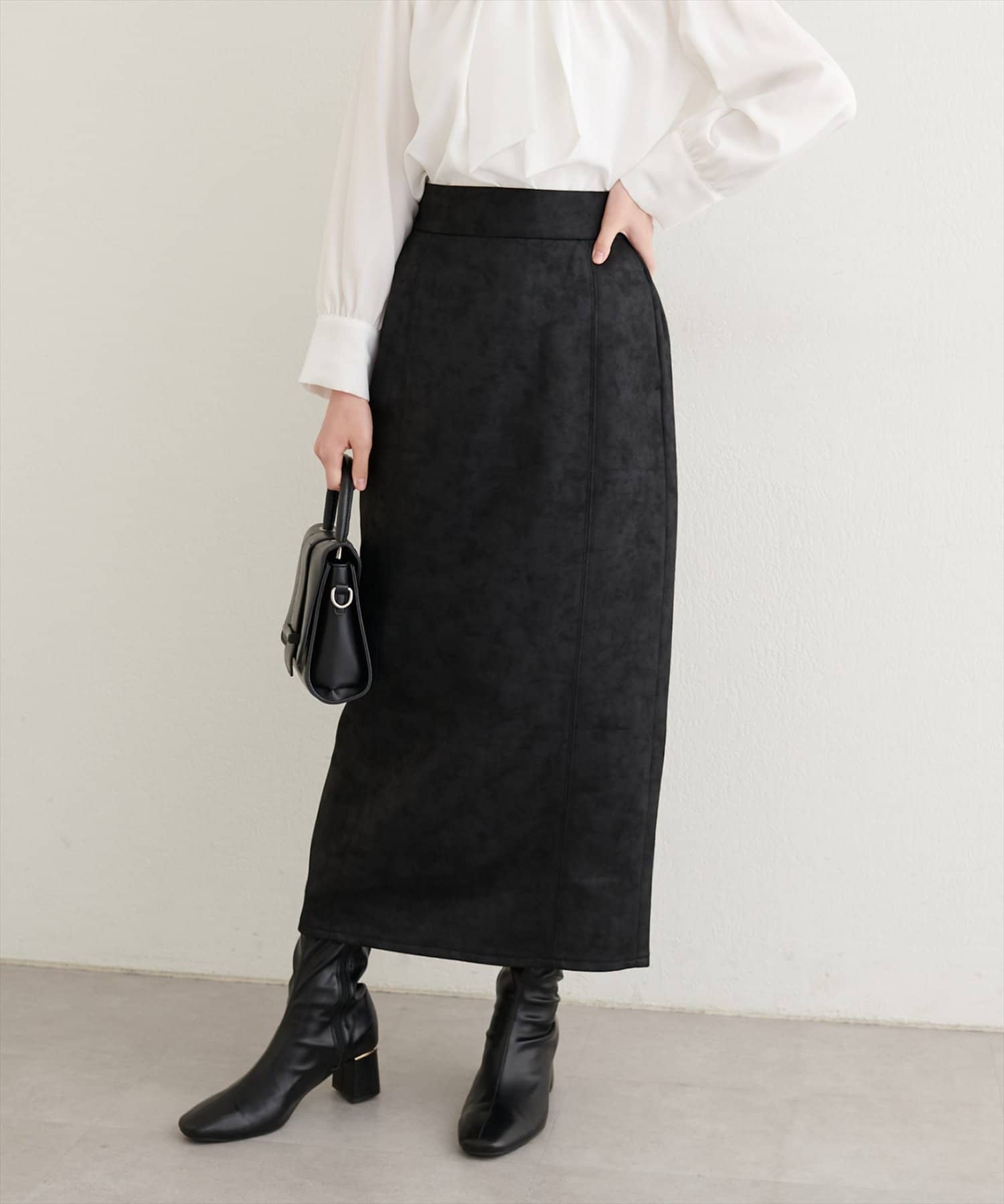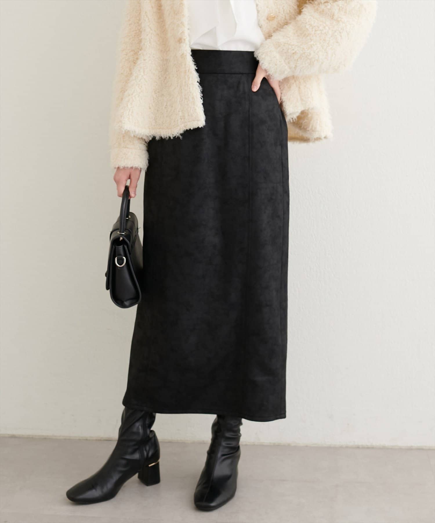 しっとりとした質感と、上品な素材感が魅力の合皮風ポンチスエードタイトスカート。