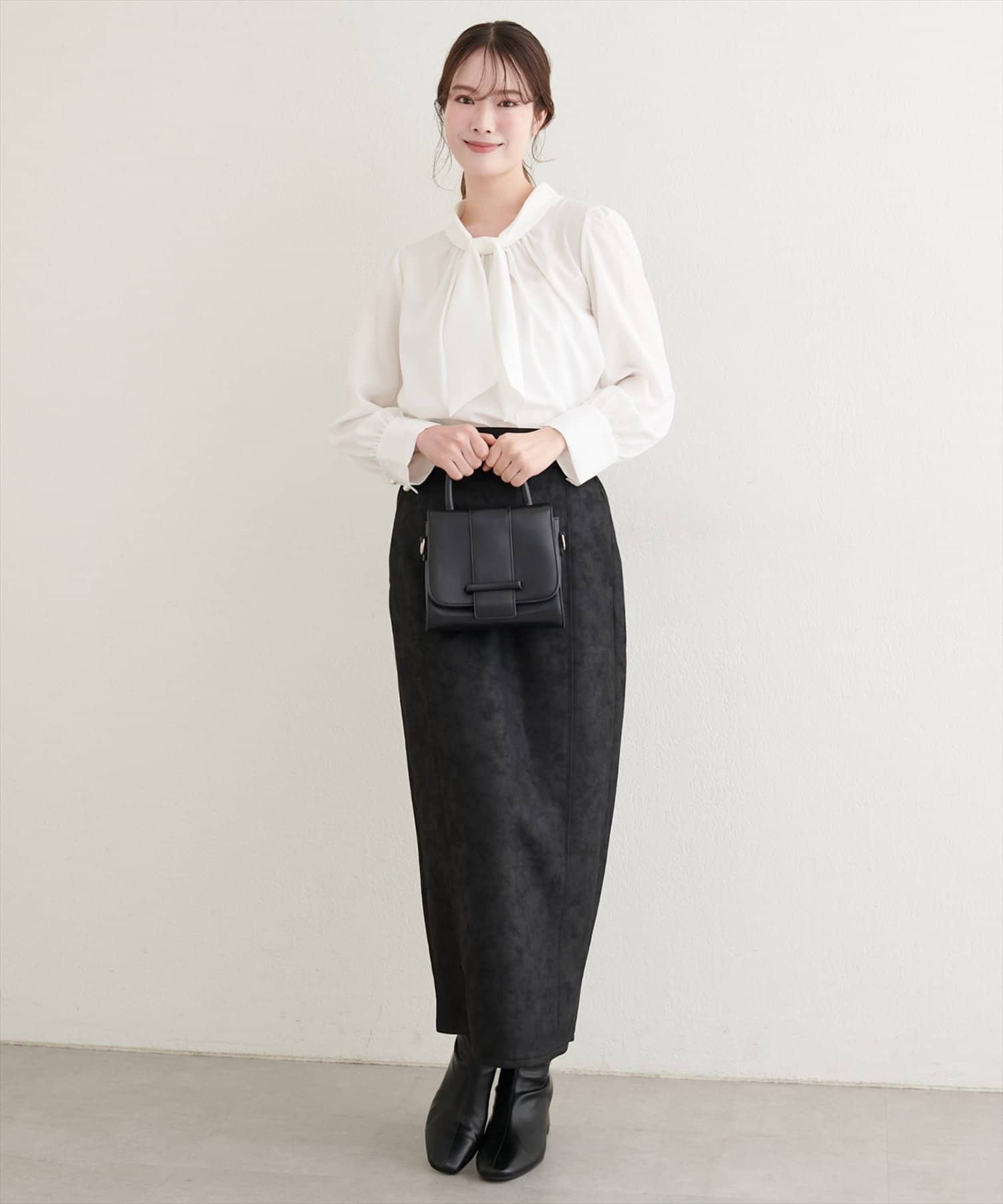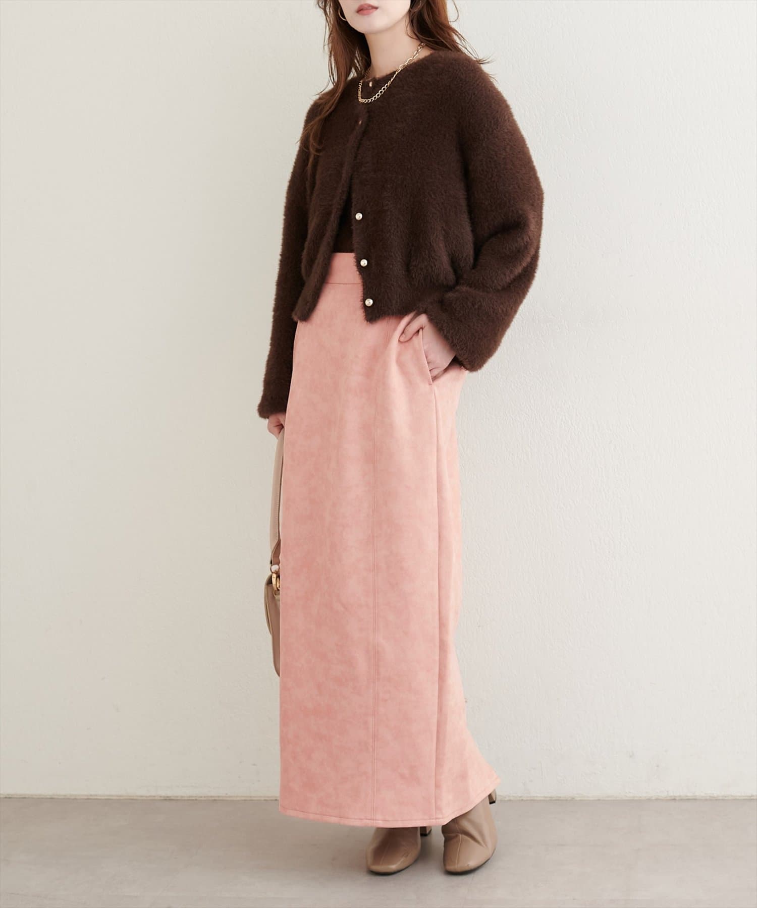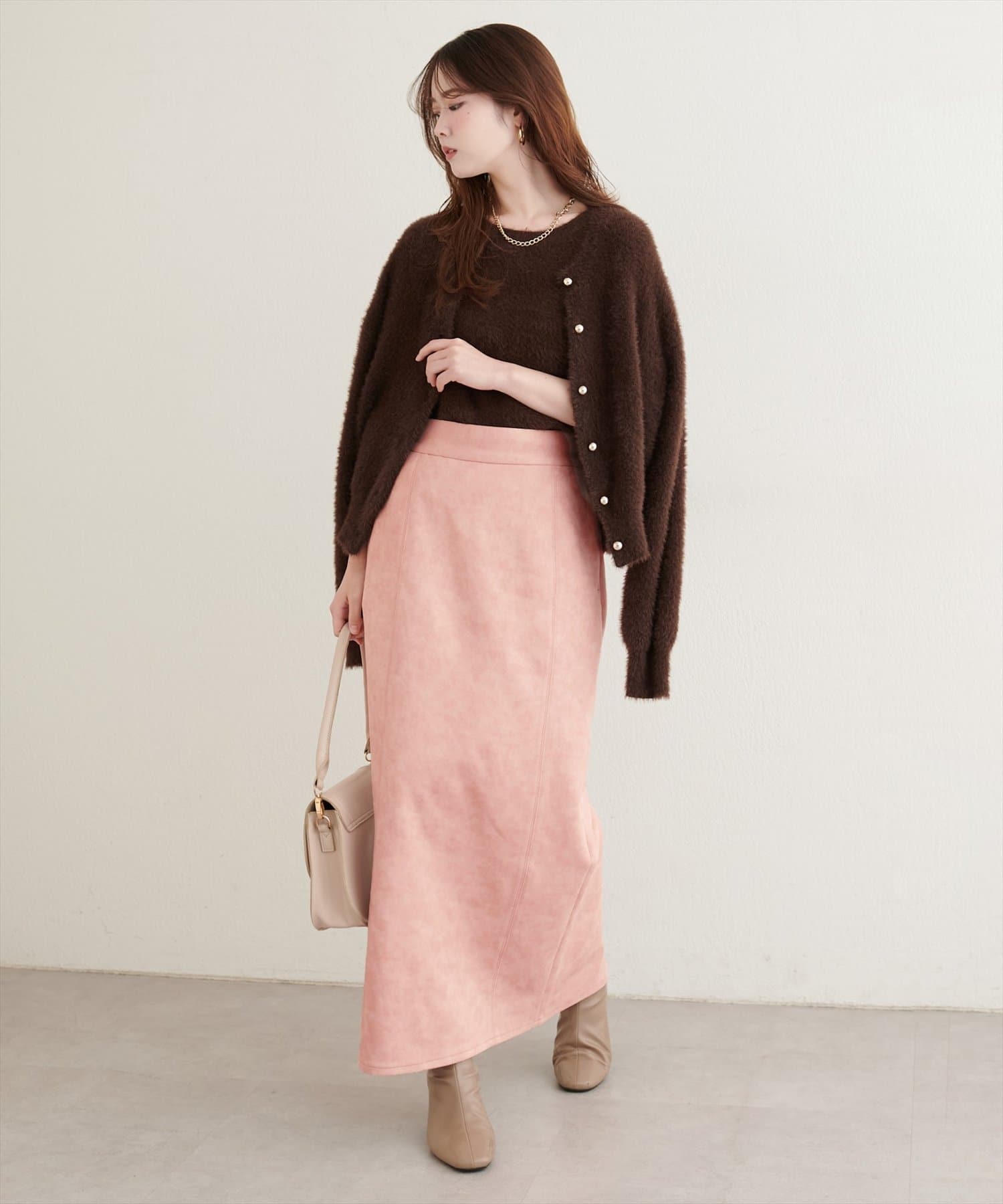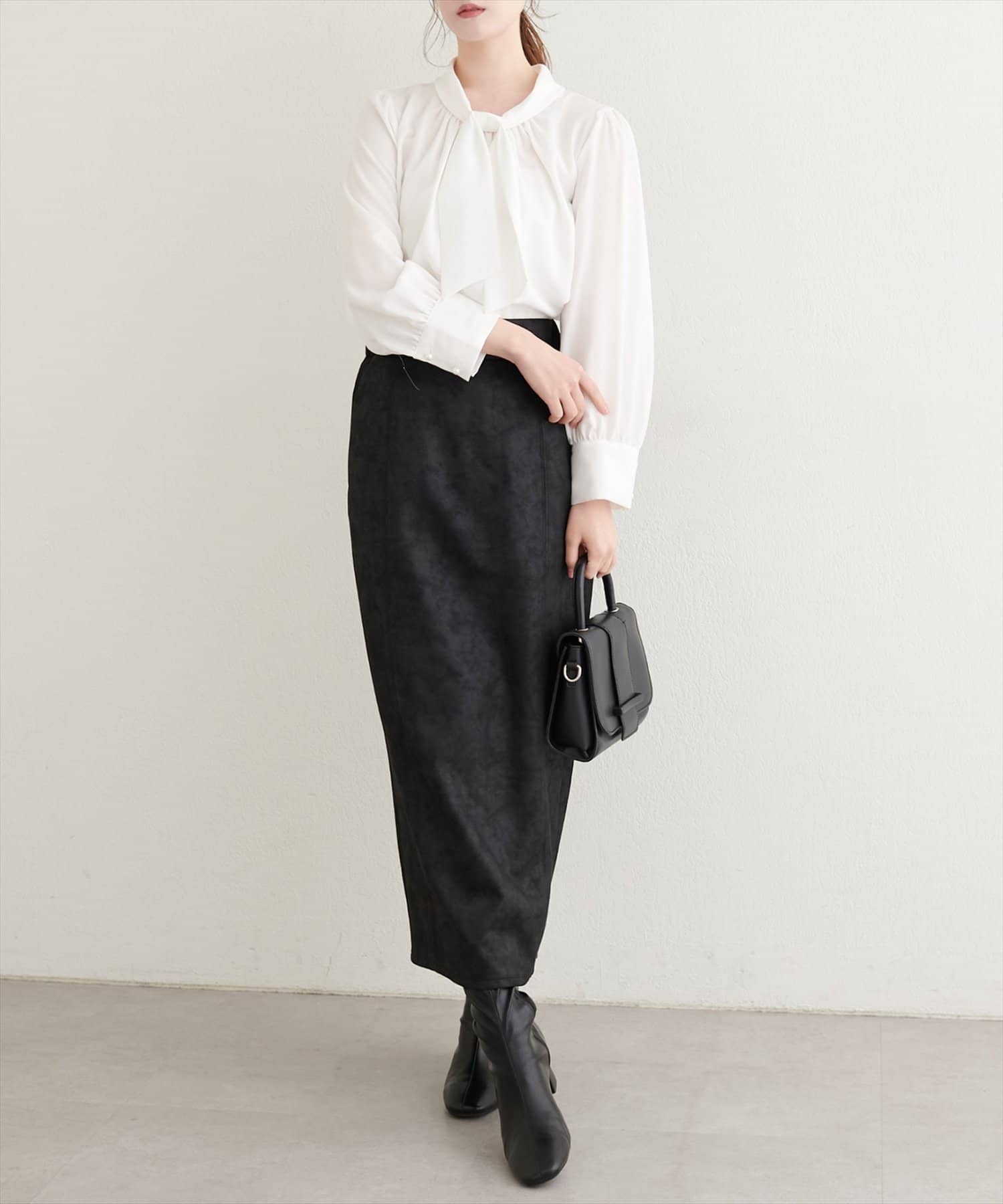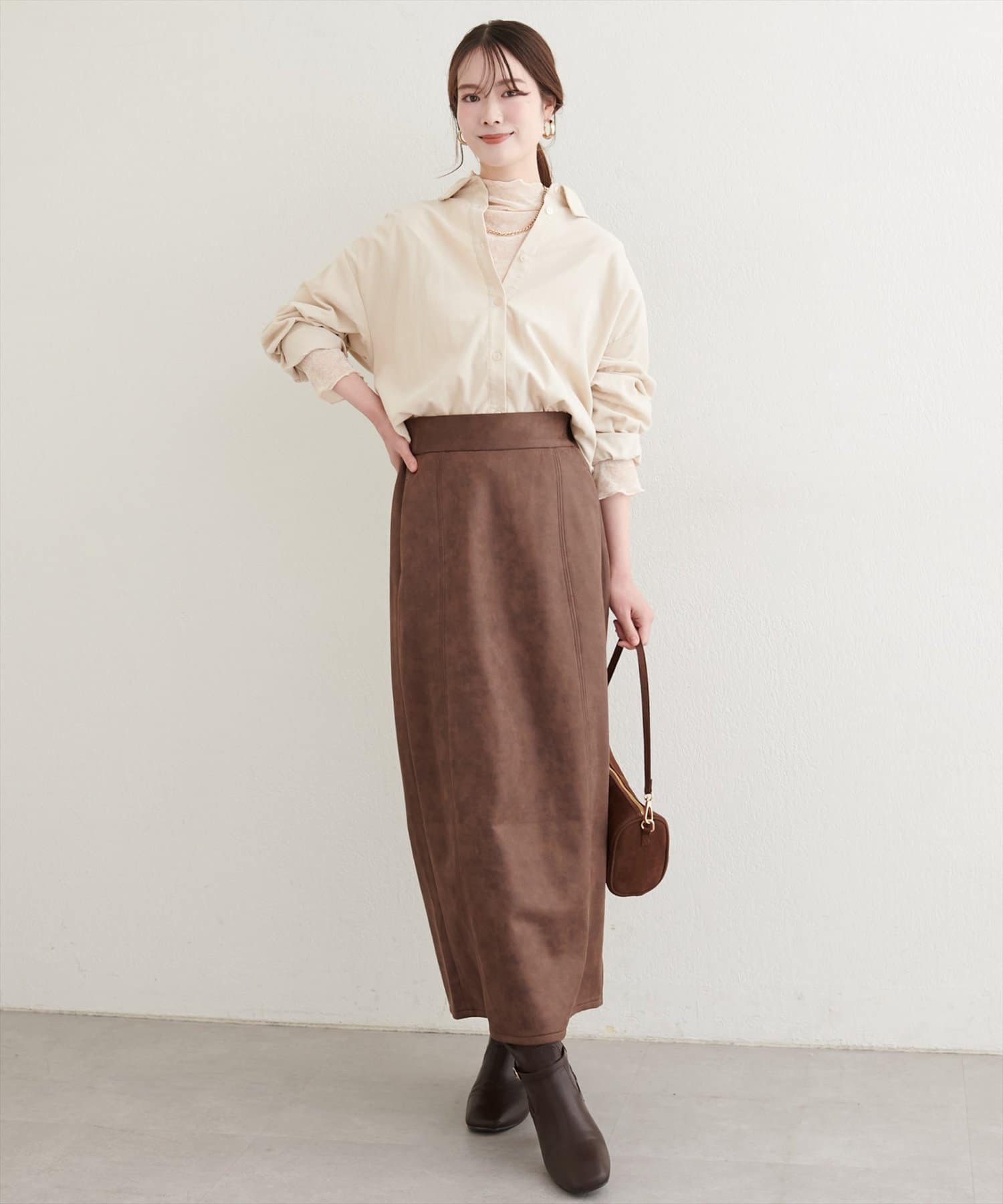 しっとりとした質感と、上品な素材感が魅力の合皮風ポンチスエードタイトスカート。