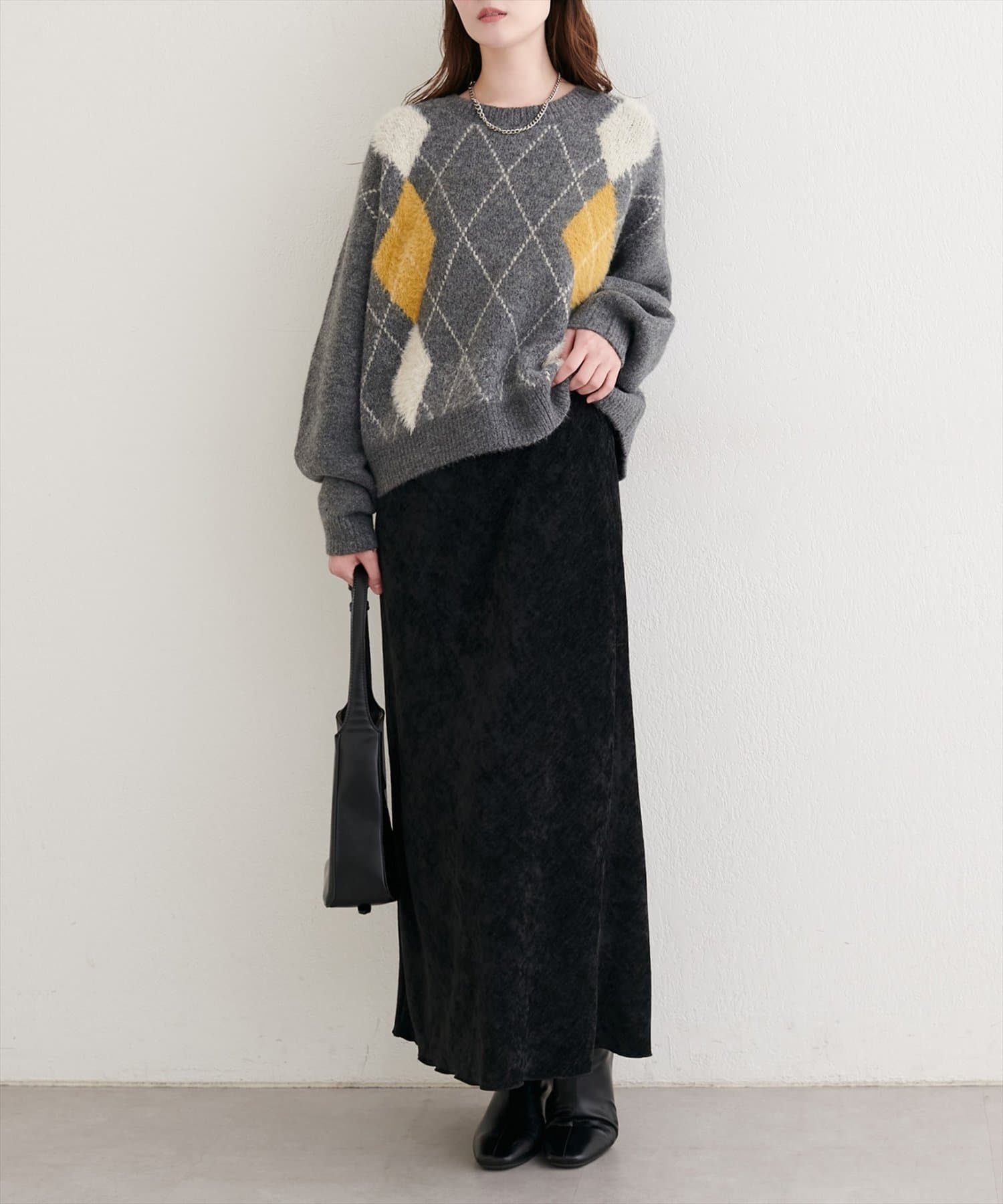 普段使いには、オーバーサイズのニットやスウェットと合わせて、カジュアルダウンした着こなしがおすすめです。