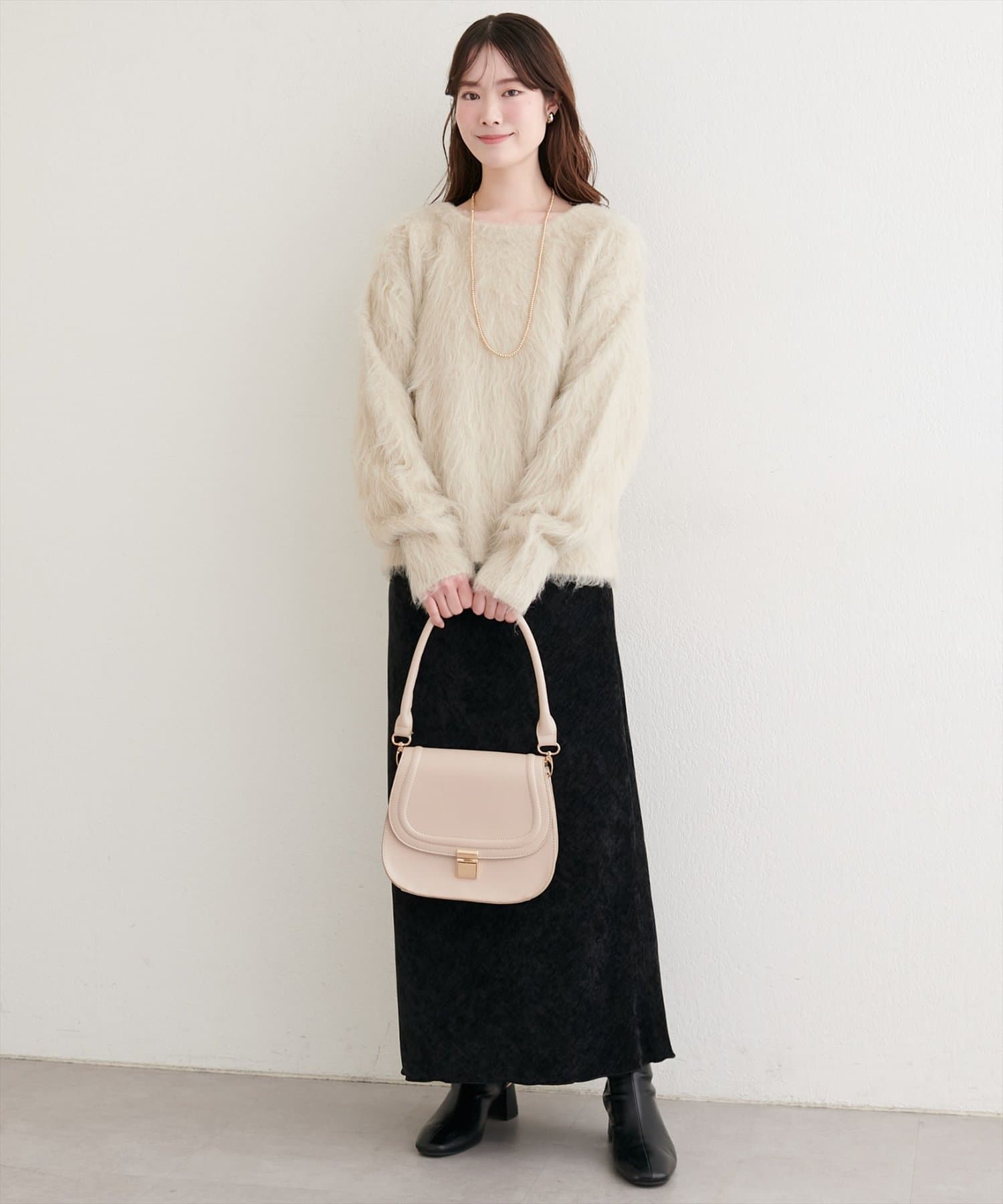 バッグは、小さめのショルダーバッグやハンドバッグを合わせれば、バランスの良いスタイリングになります。