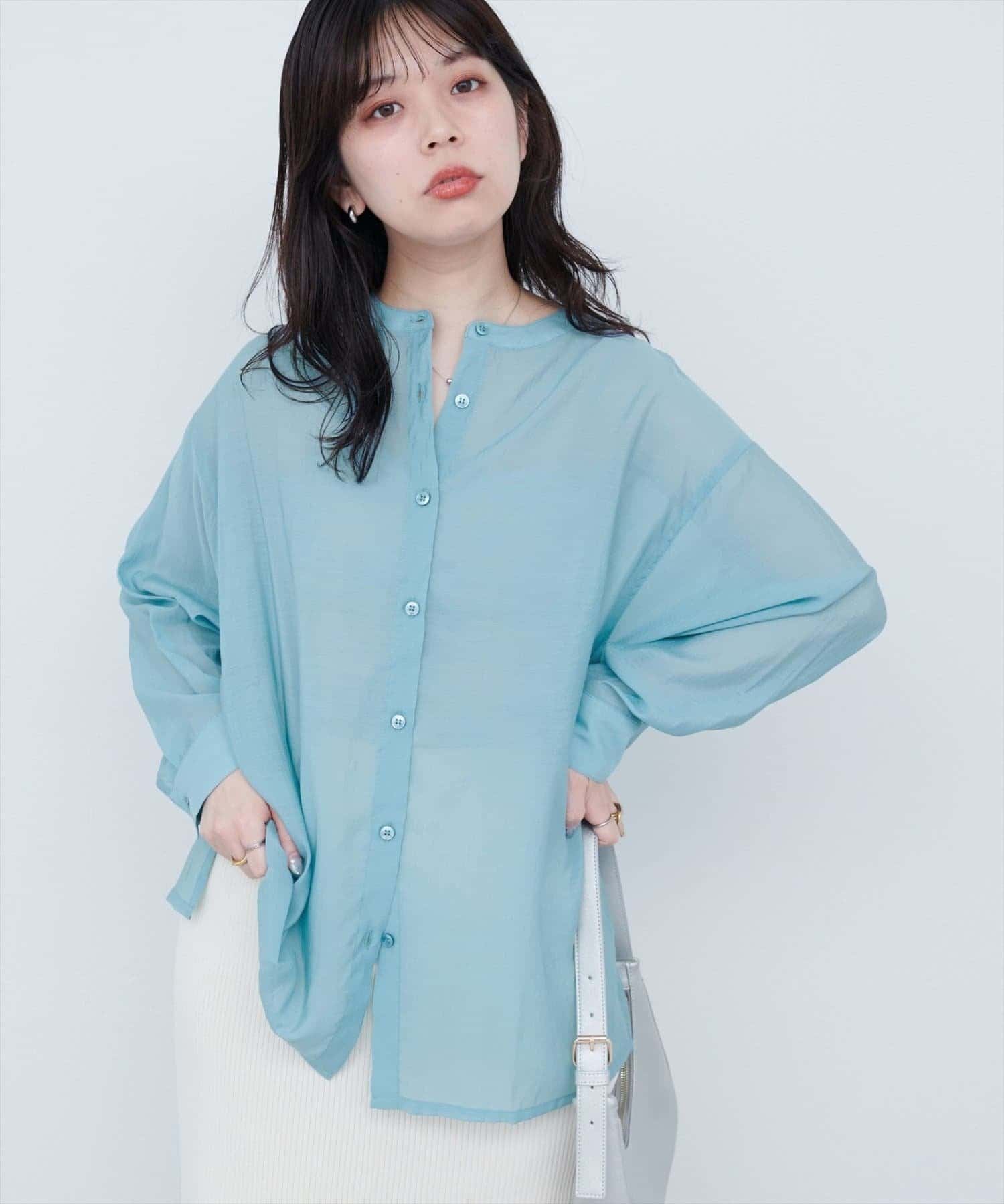 【natural couture】バンドカラーサイドスリットシアーシャツ