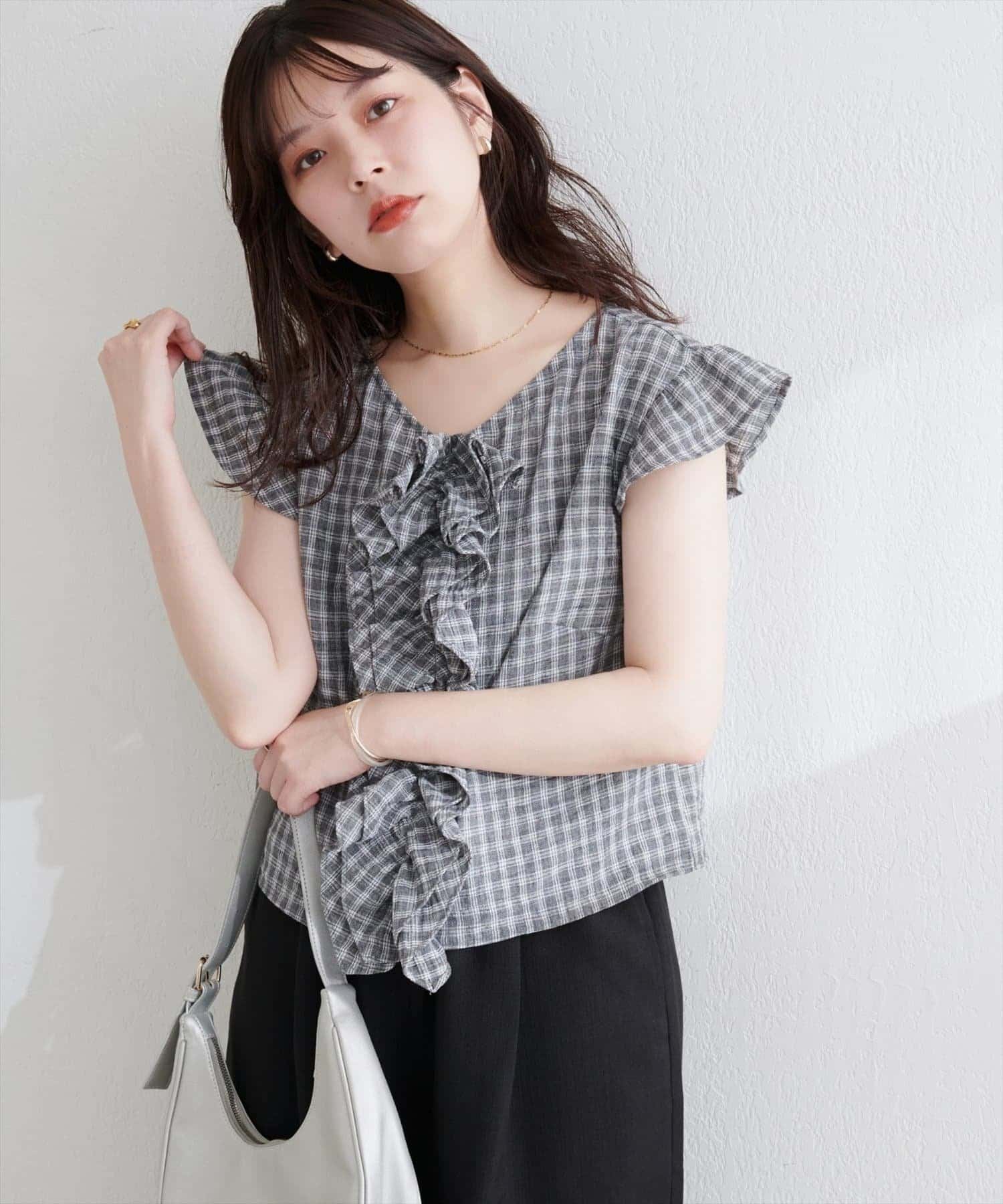 胸元を飾る繊細なフリルは、甘すぎない上品なアクセントとなり、周囲の視線を惹きつけます。