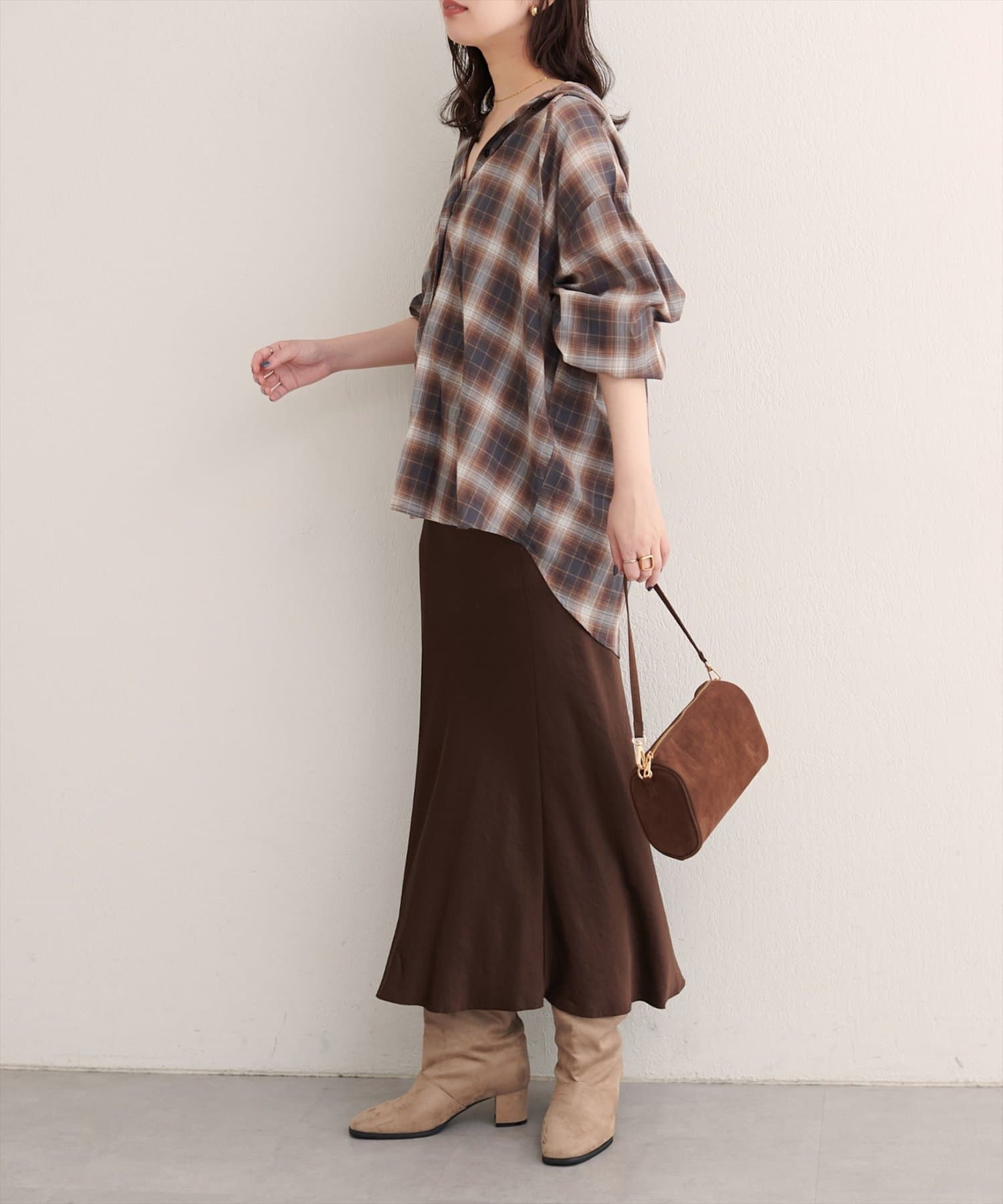 ゆったりとしたシルエットは、リラックス感がありながらも、体型をさりげなくカバーしてくれる効果も。