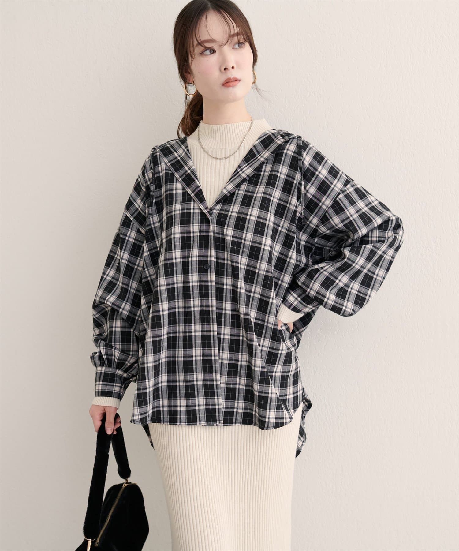 特徴的なフードデザインは、首元に程よいボリューム感をもたらし、小顔効果も期待できます。