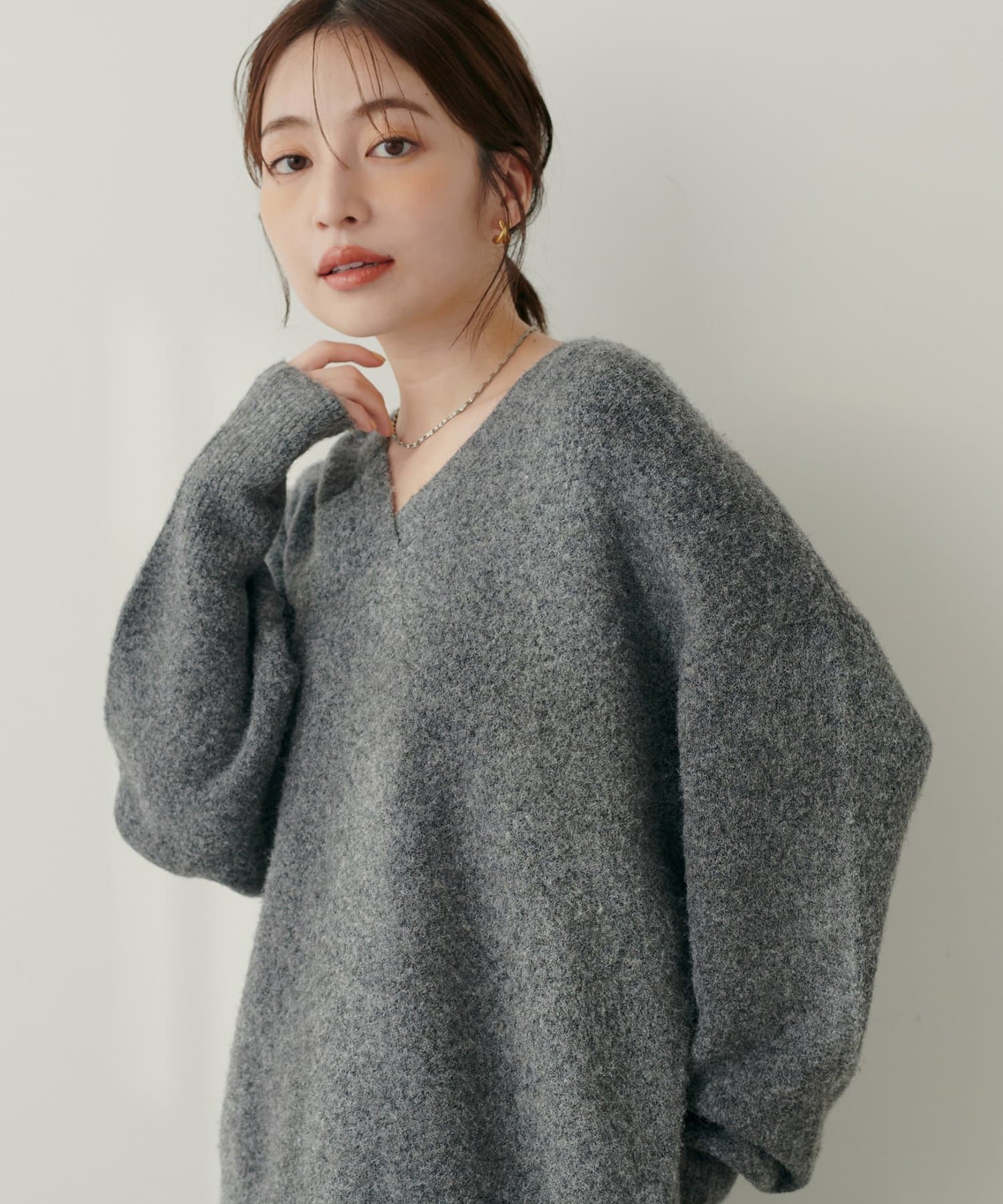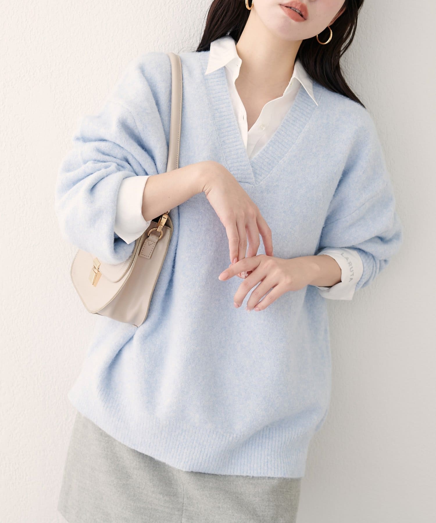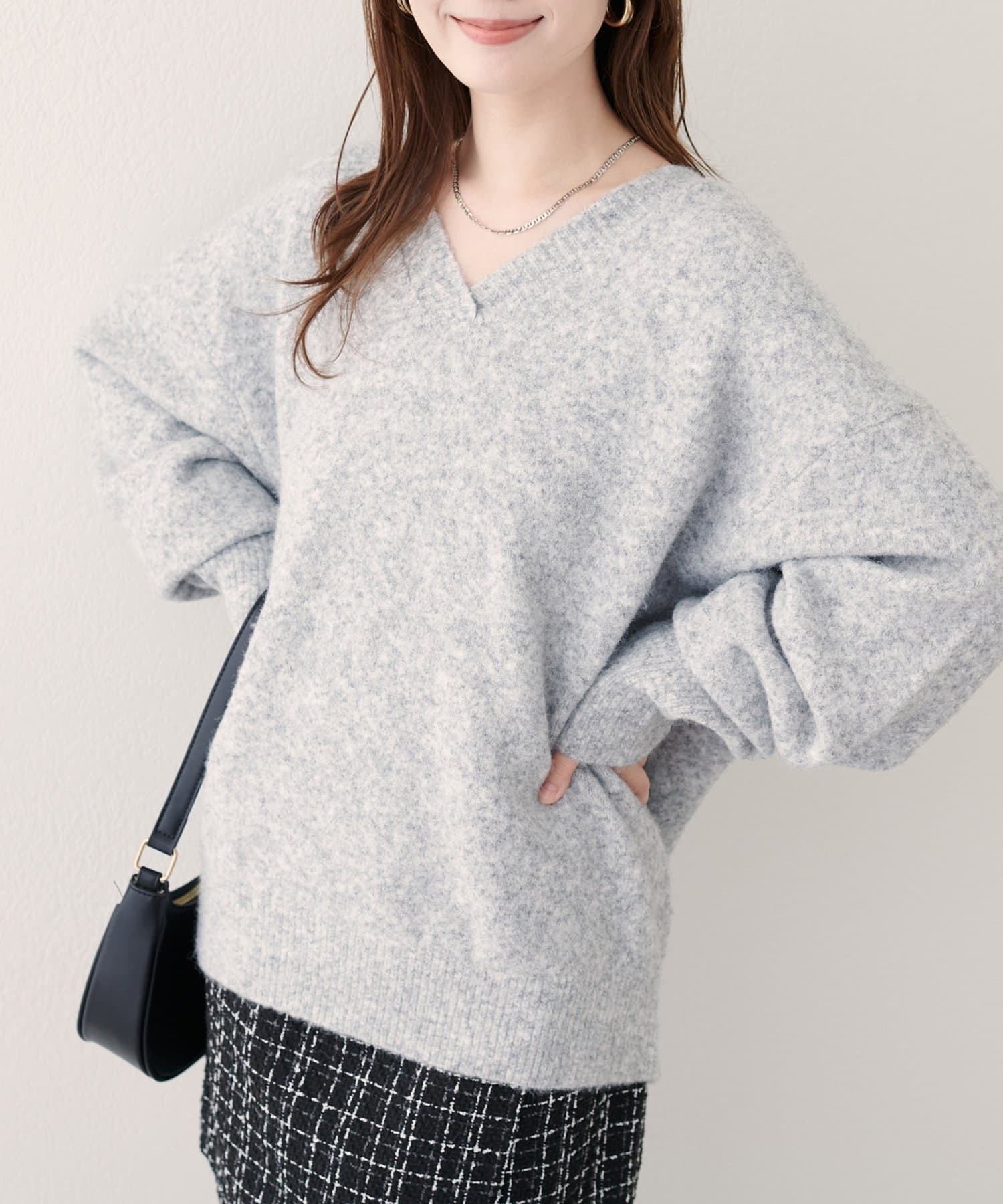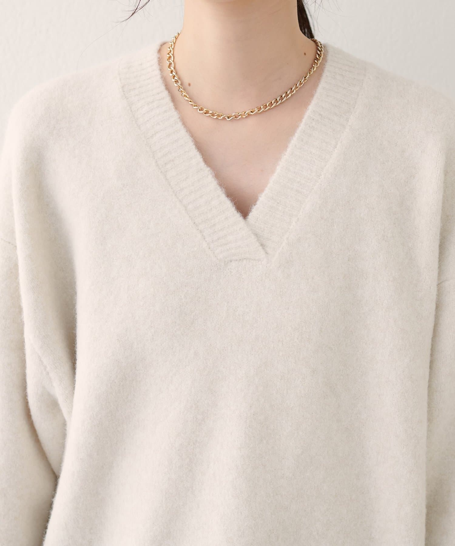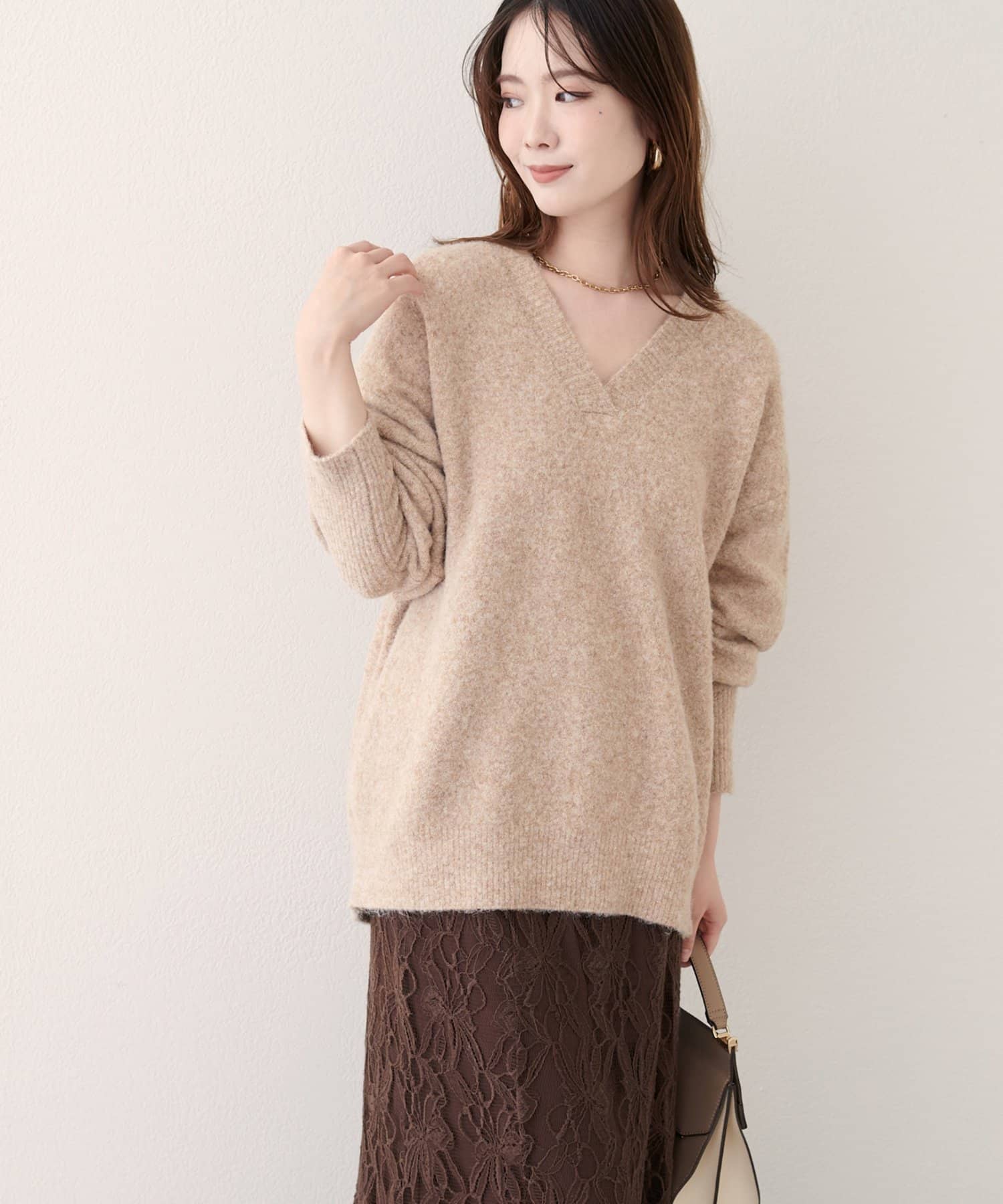 デコルテを美しく見せるVネックラインは、カジュアルながらも女性らしさを引き立てる絶妙なカッティング。