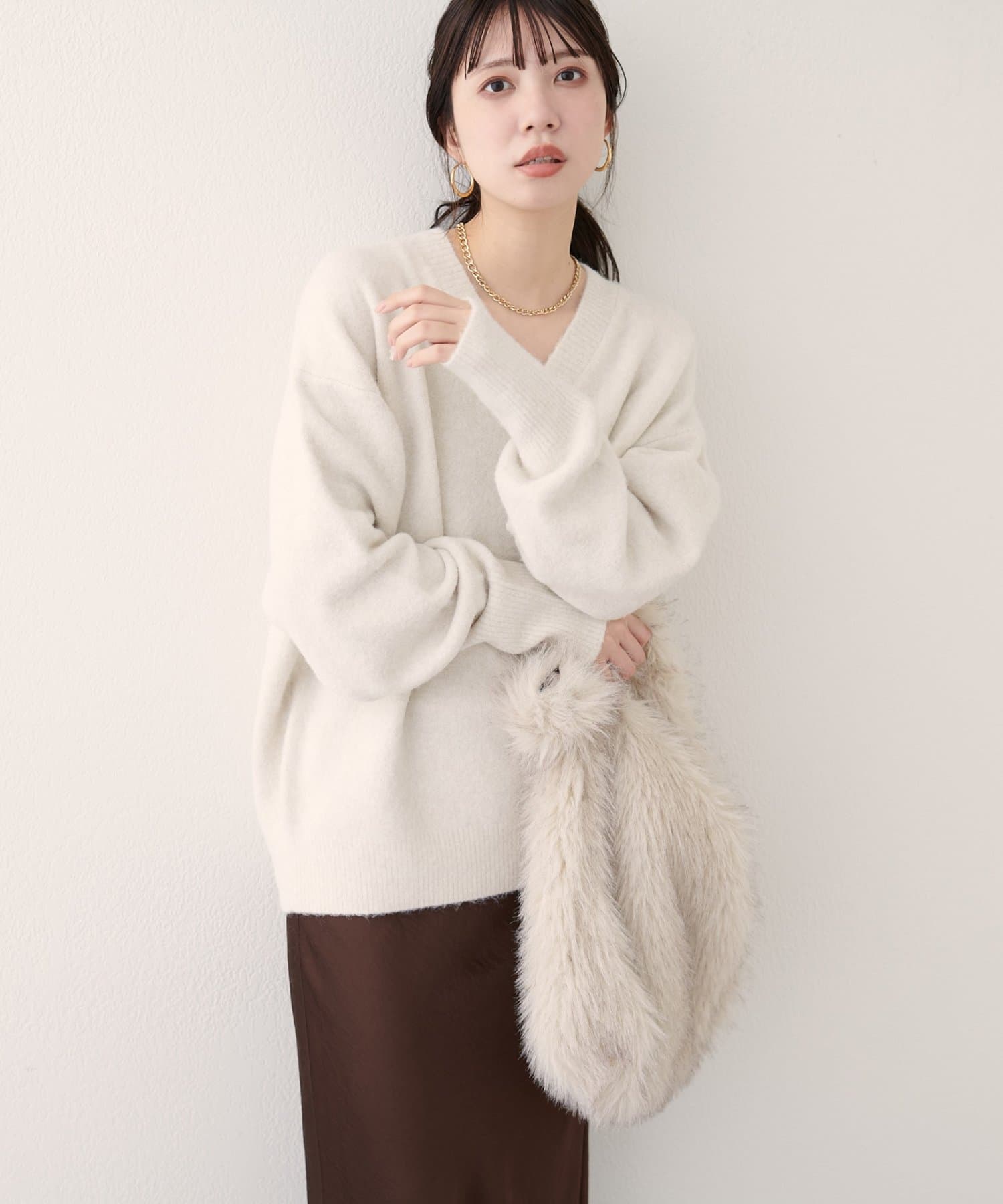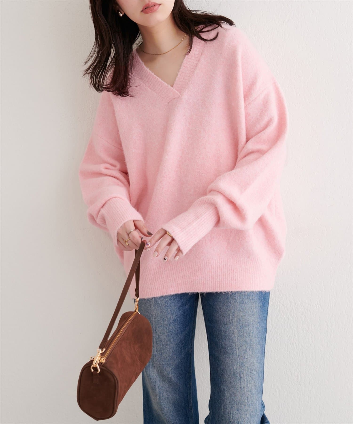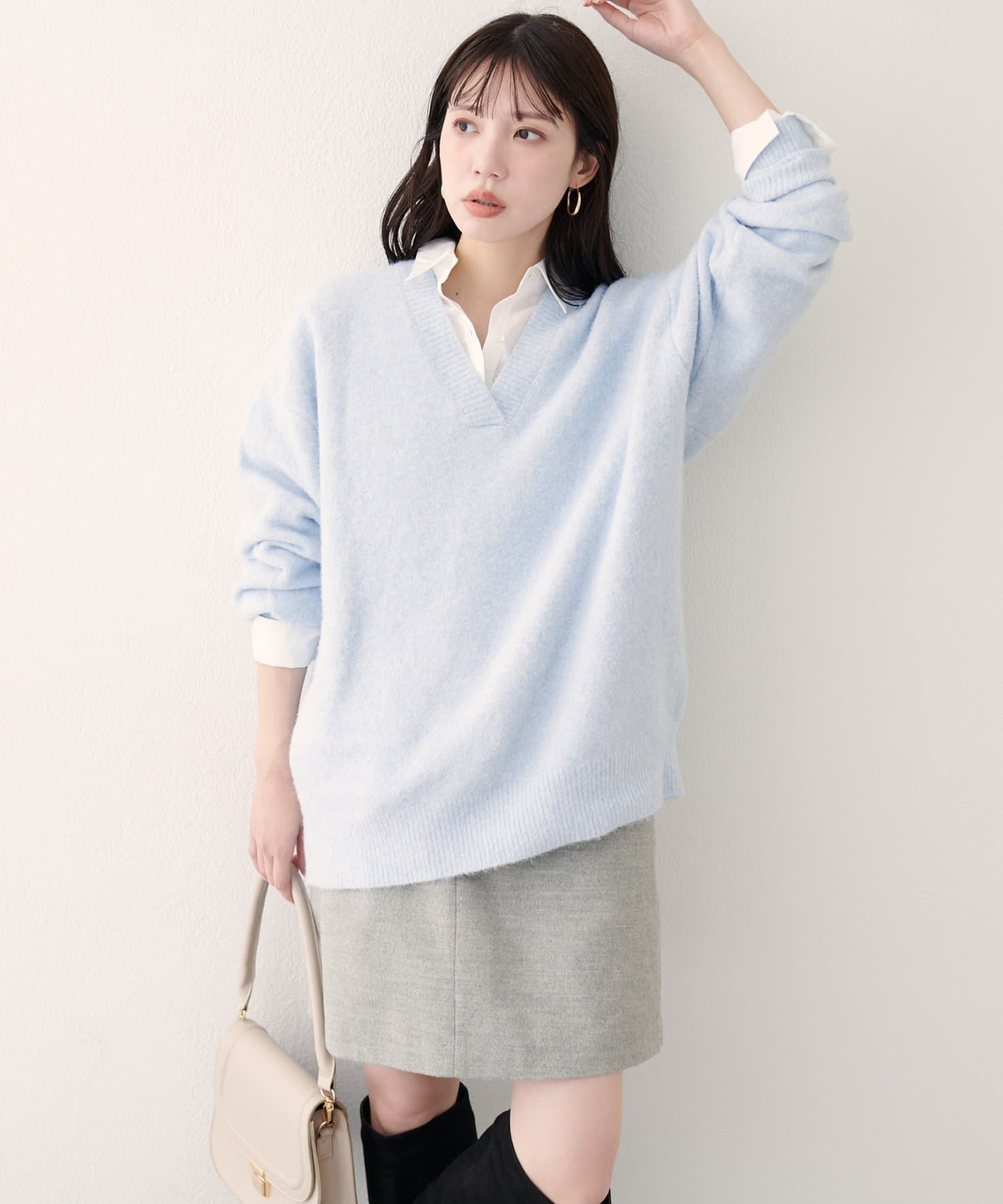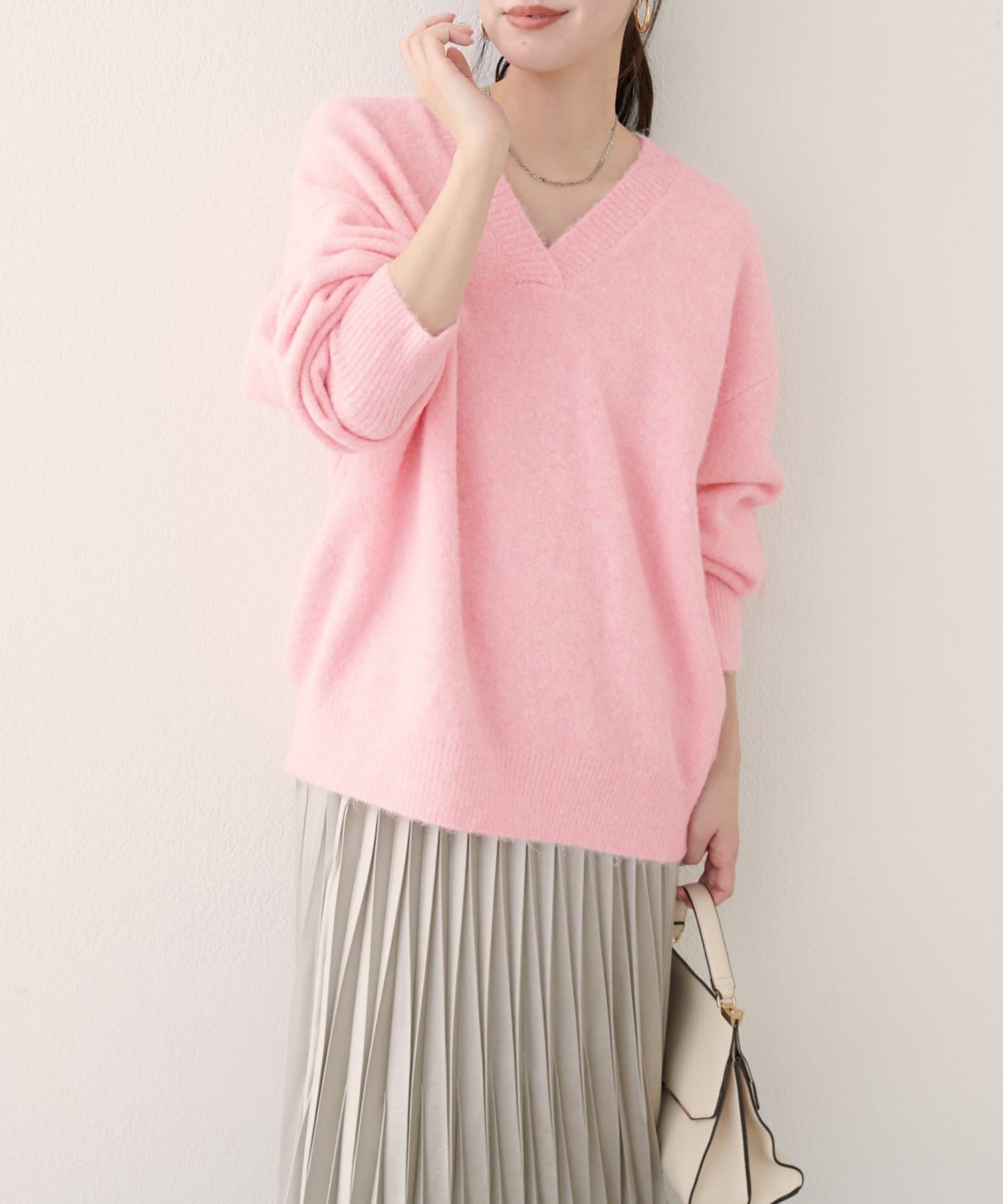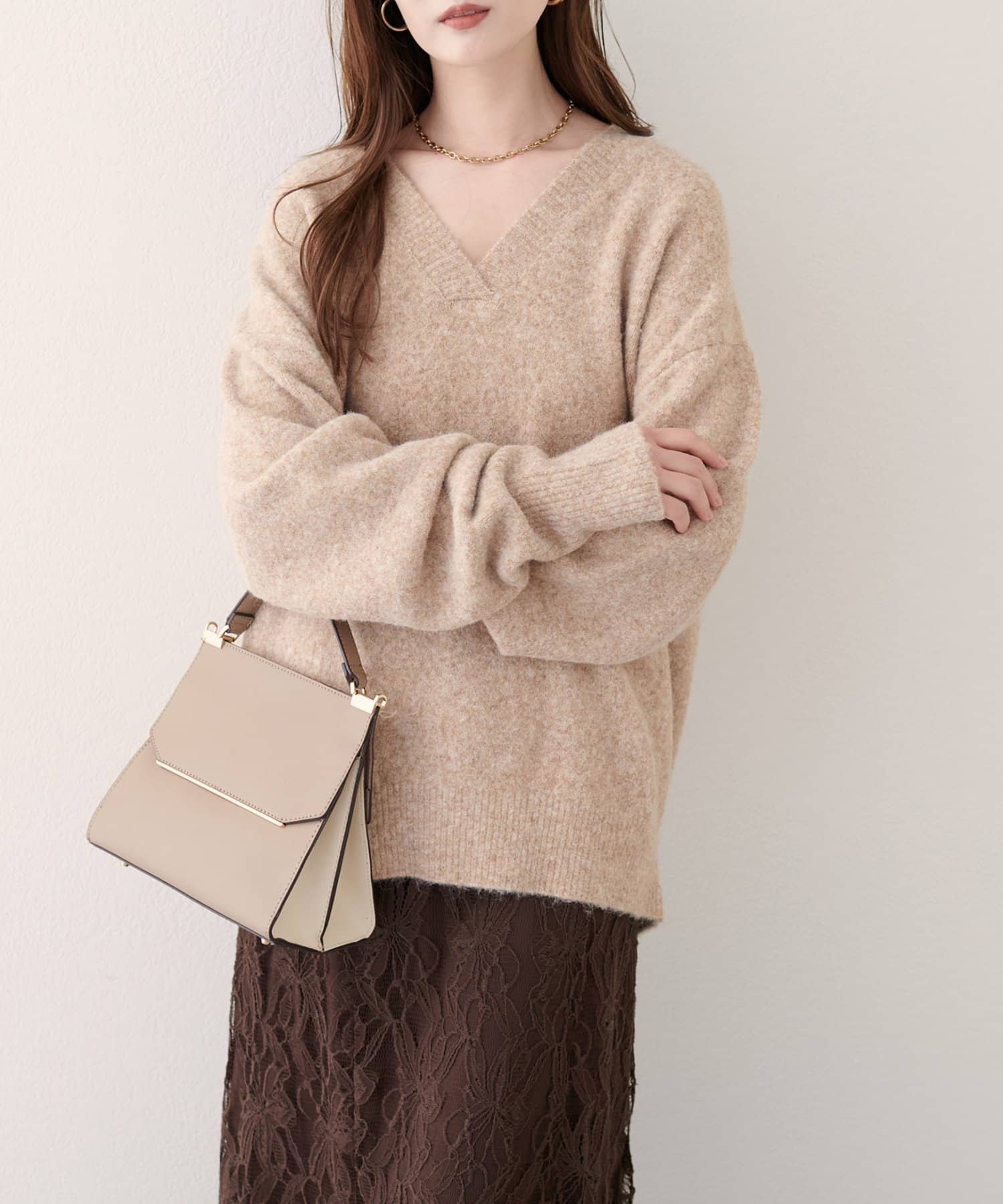 デコルテを美しく見せるVネックラインは、カジュアルながらも女性らしさを引き立てる絶妙なカッティング。